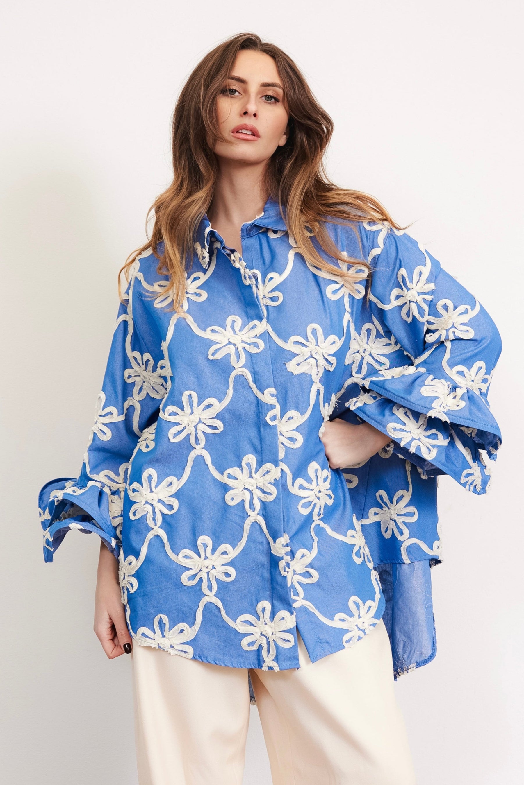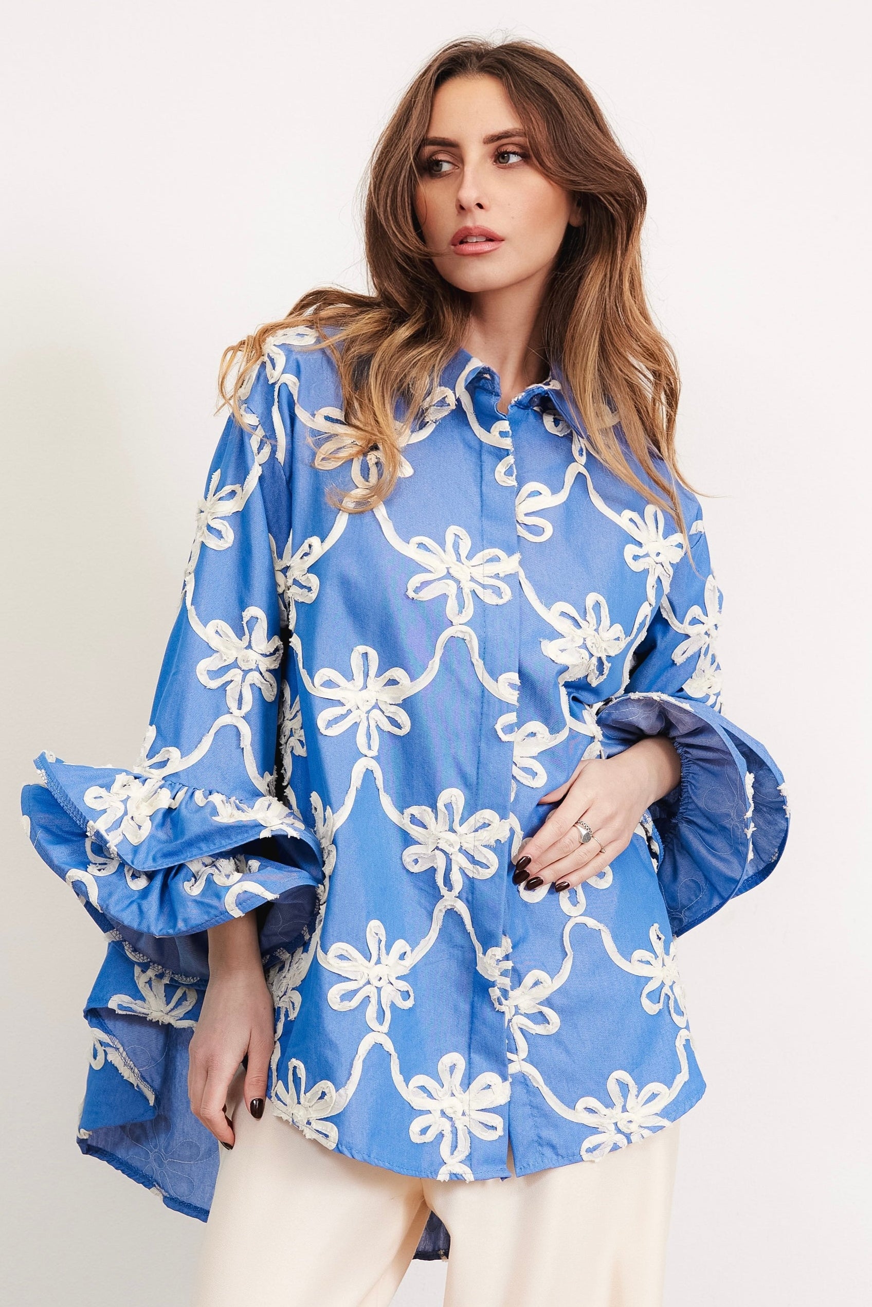 FLAMENCO - Camicia con rouches (Azzurra Fiori Bianchi)