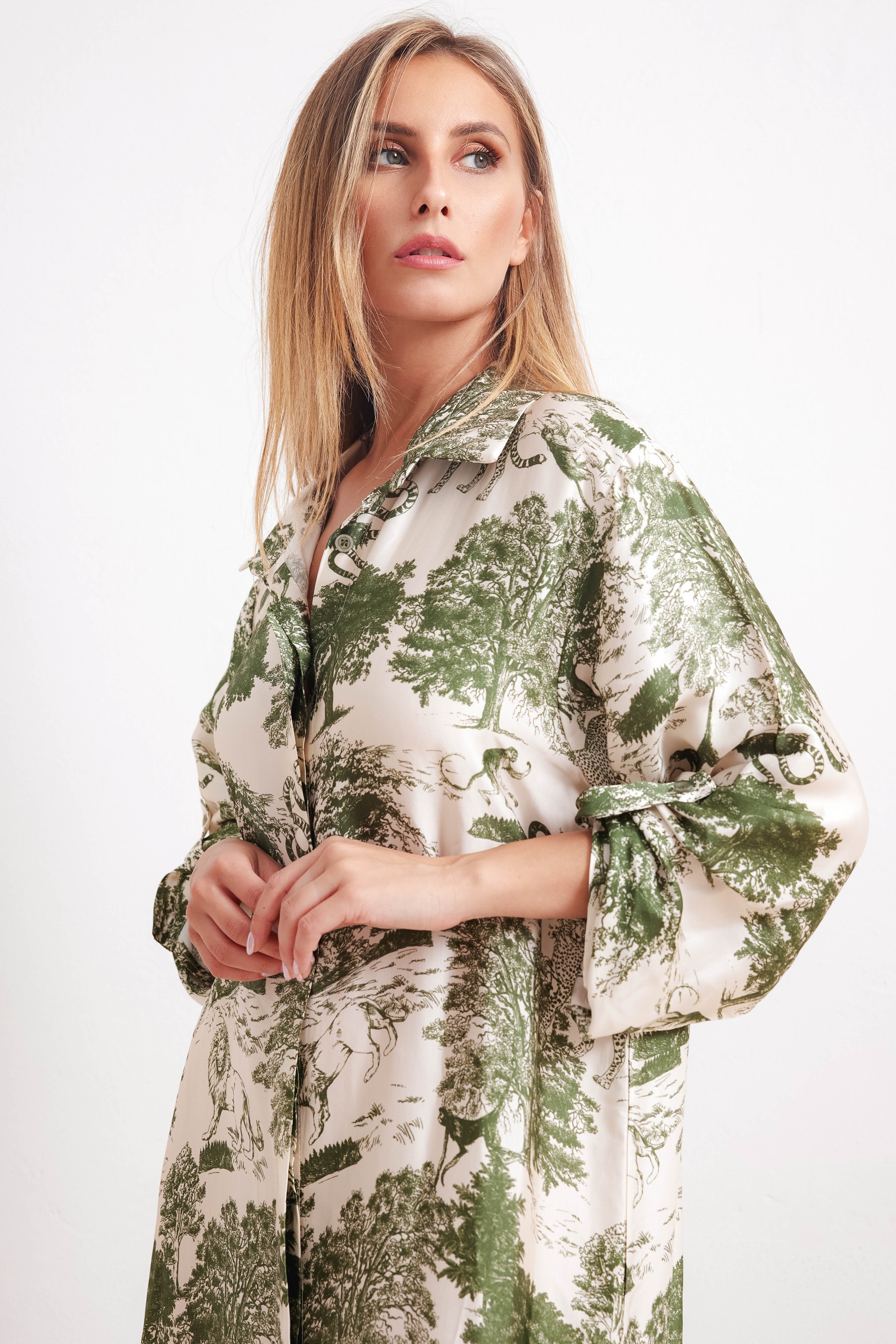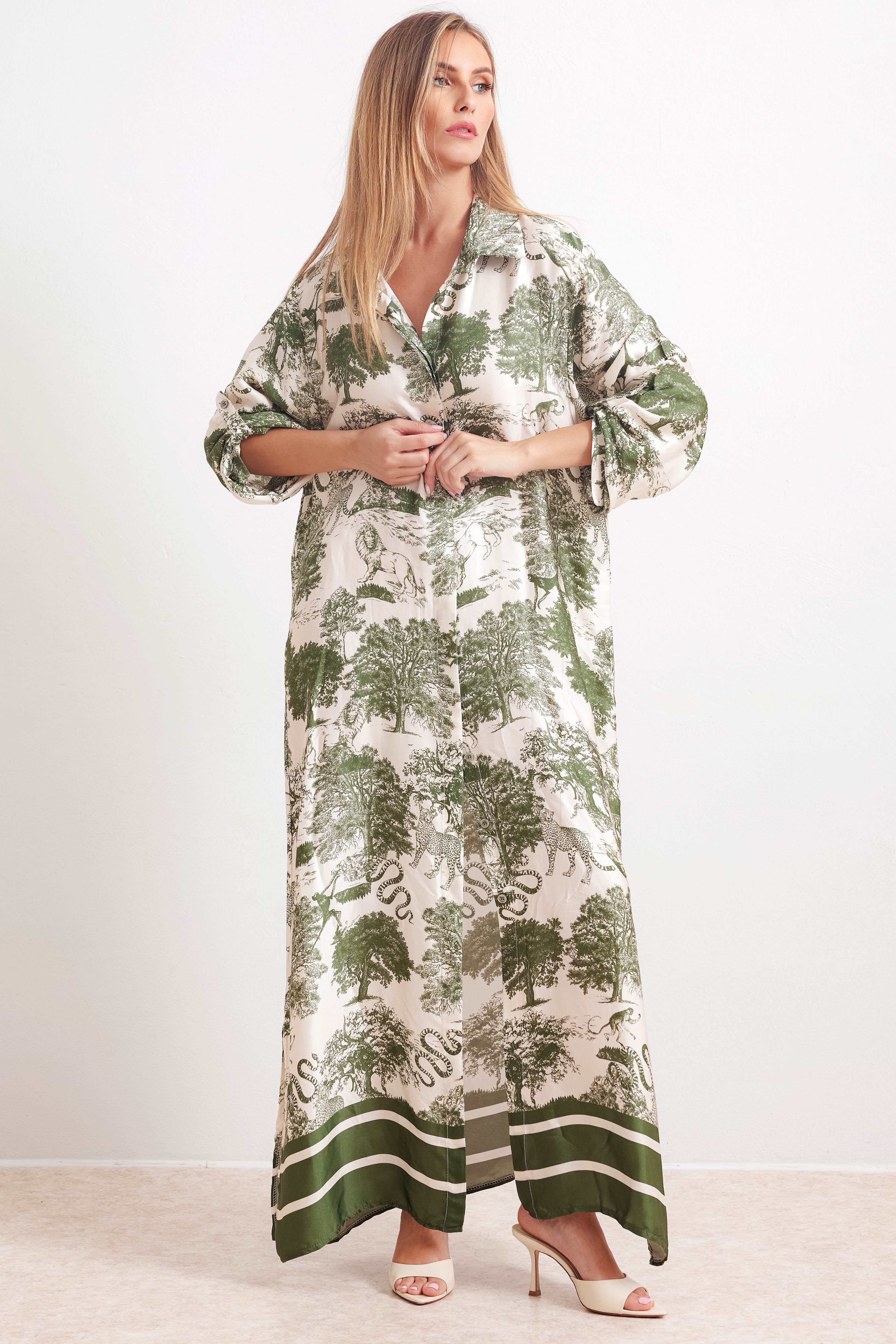 Abito fresco e leggero dalle linee classiche in stile camicia lunga con bottoni frontali e colletto. Le maniche sono lunghe, da poter arricciare a 3/4 grazie ad un bottoncino. La parte finale dell’abito riporta spacchi laterali.