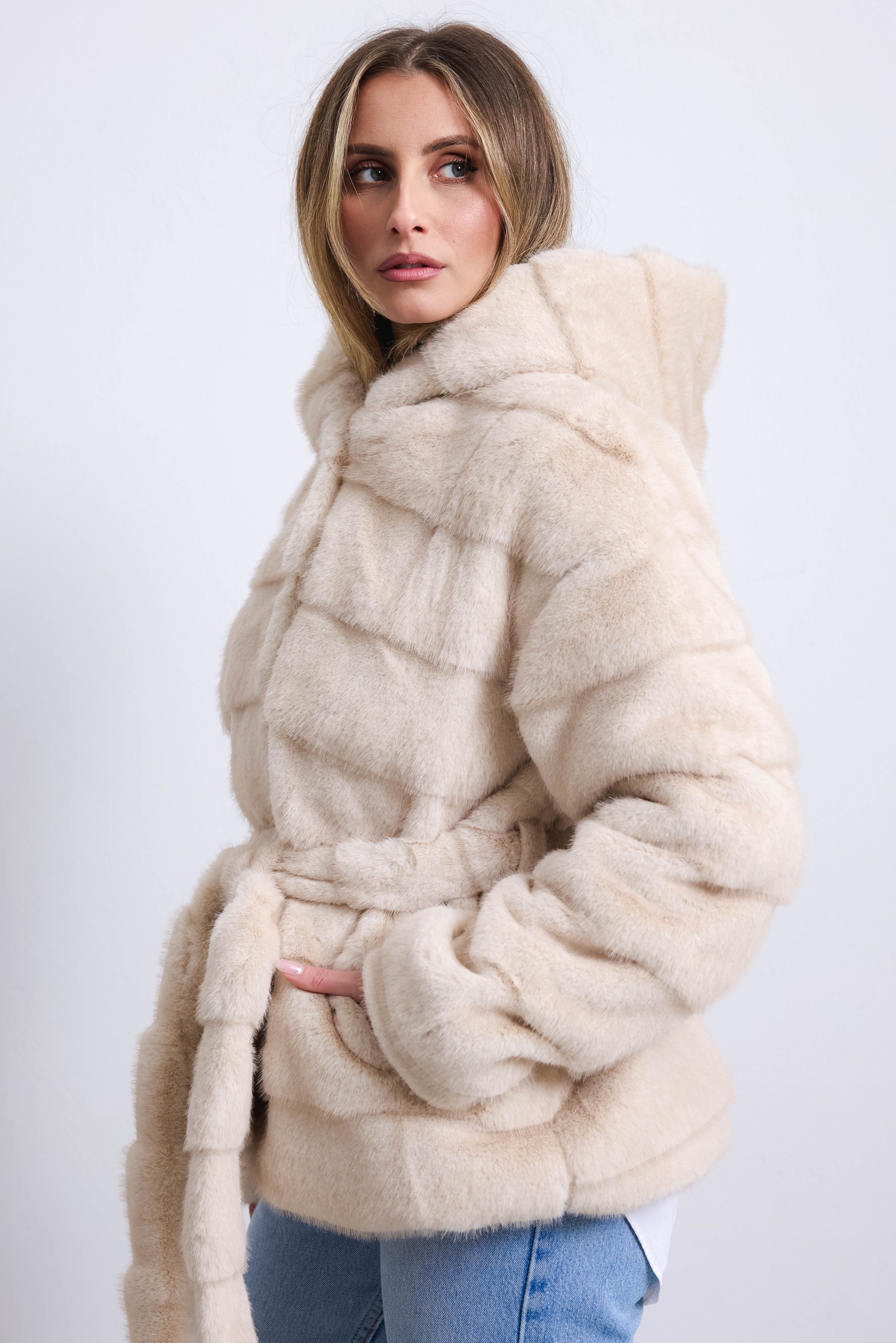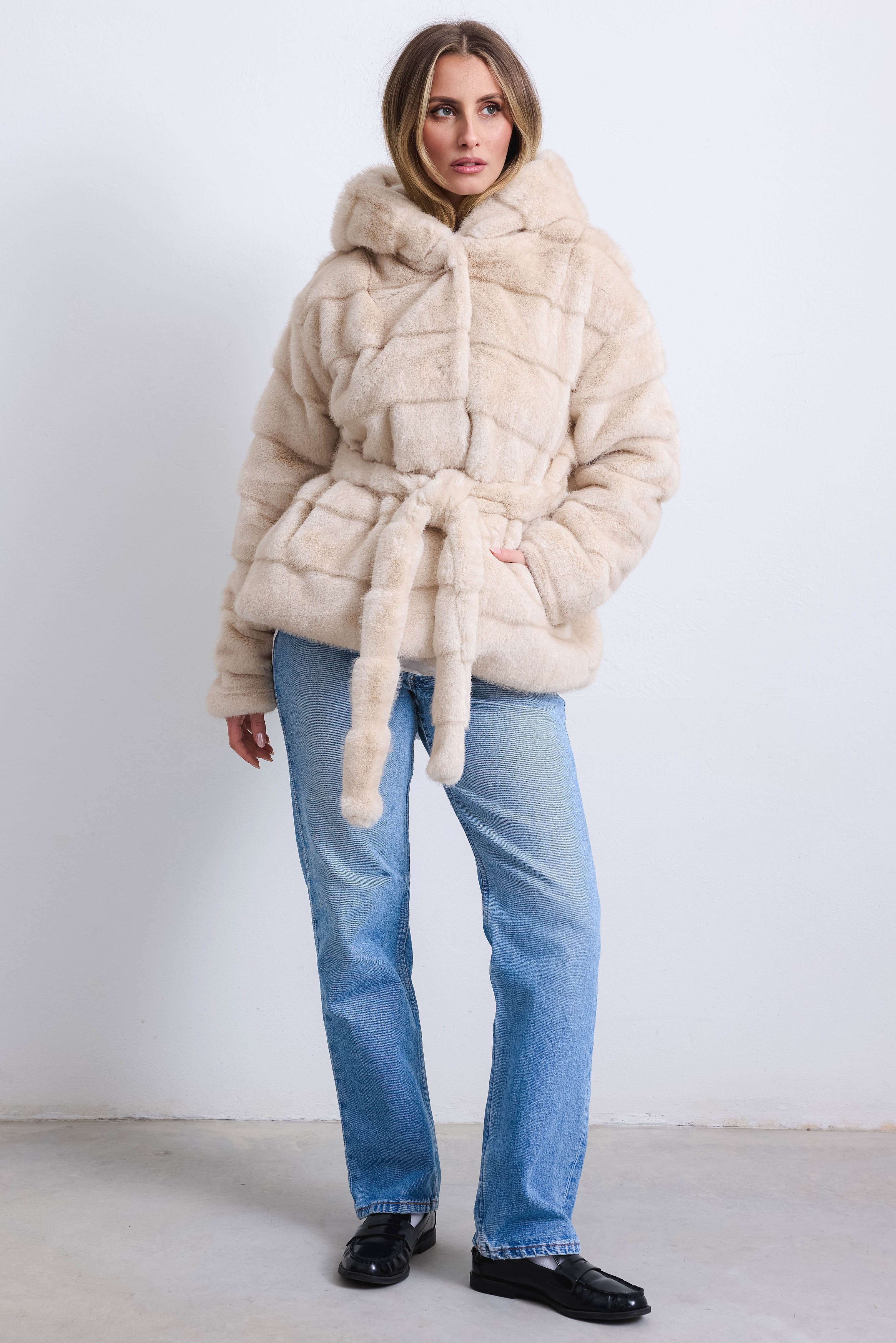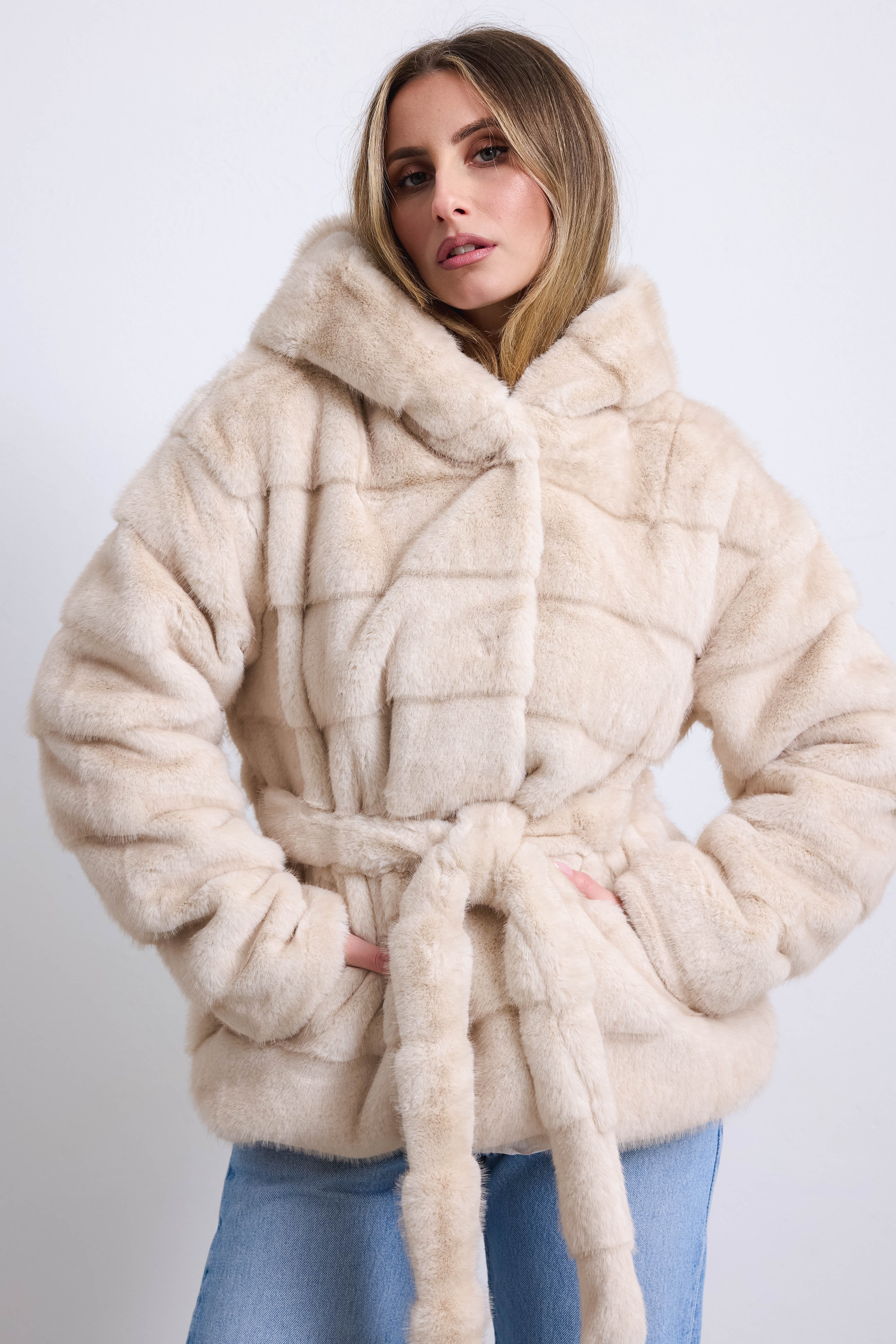 Giacca ecologica a pelo liscio con morbido cappuccio e cintura removibile. Calda e confortevole, donerà al tuo guardaroba un tocco di stile ed eleganza.