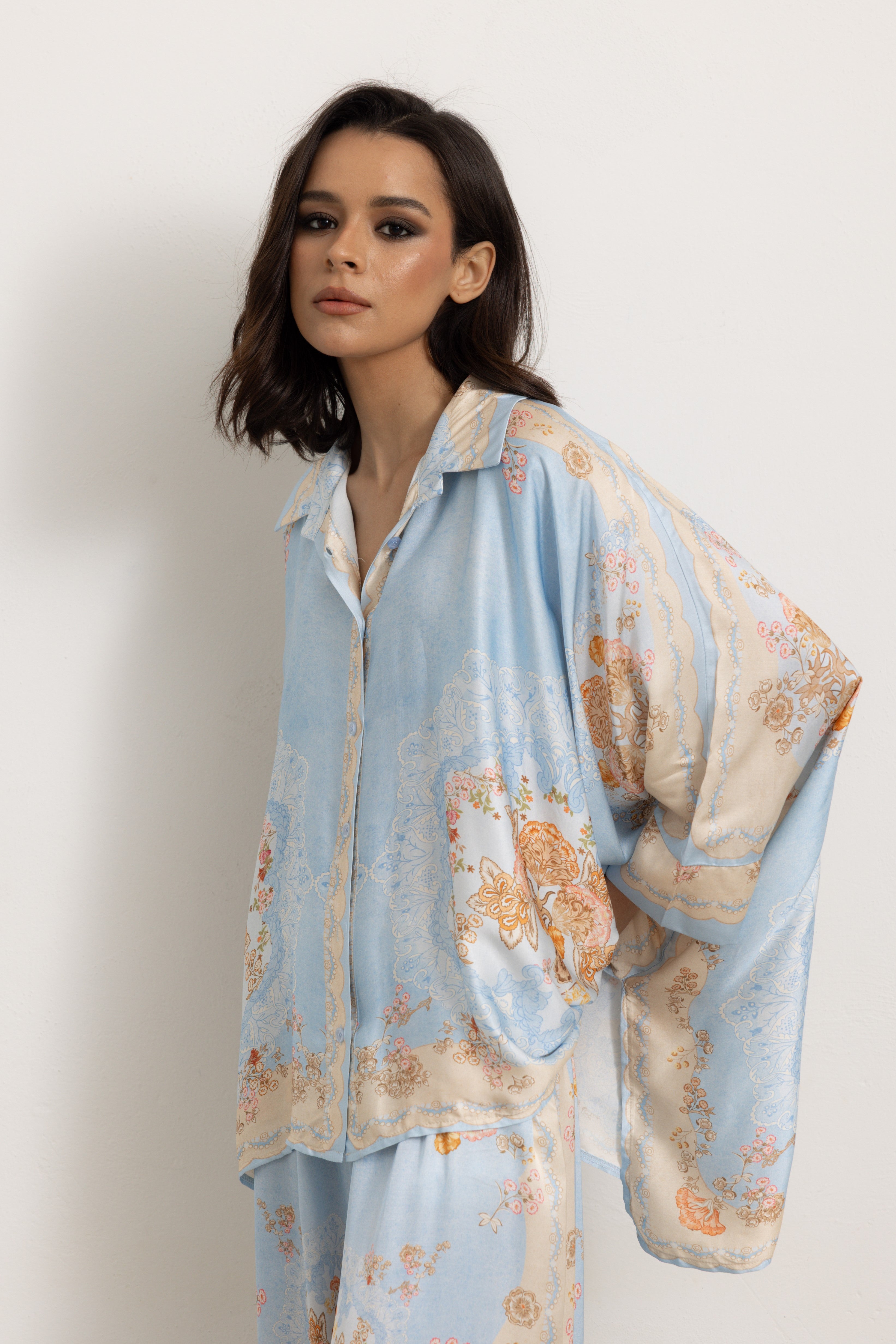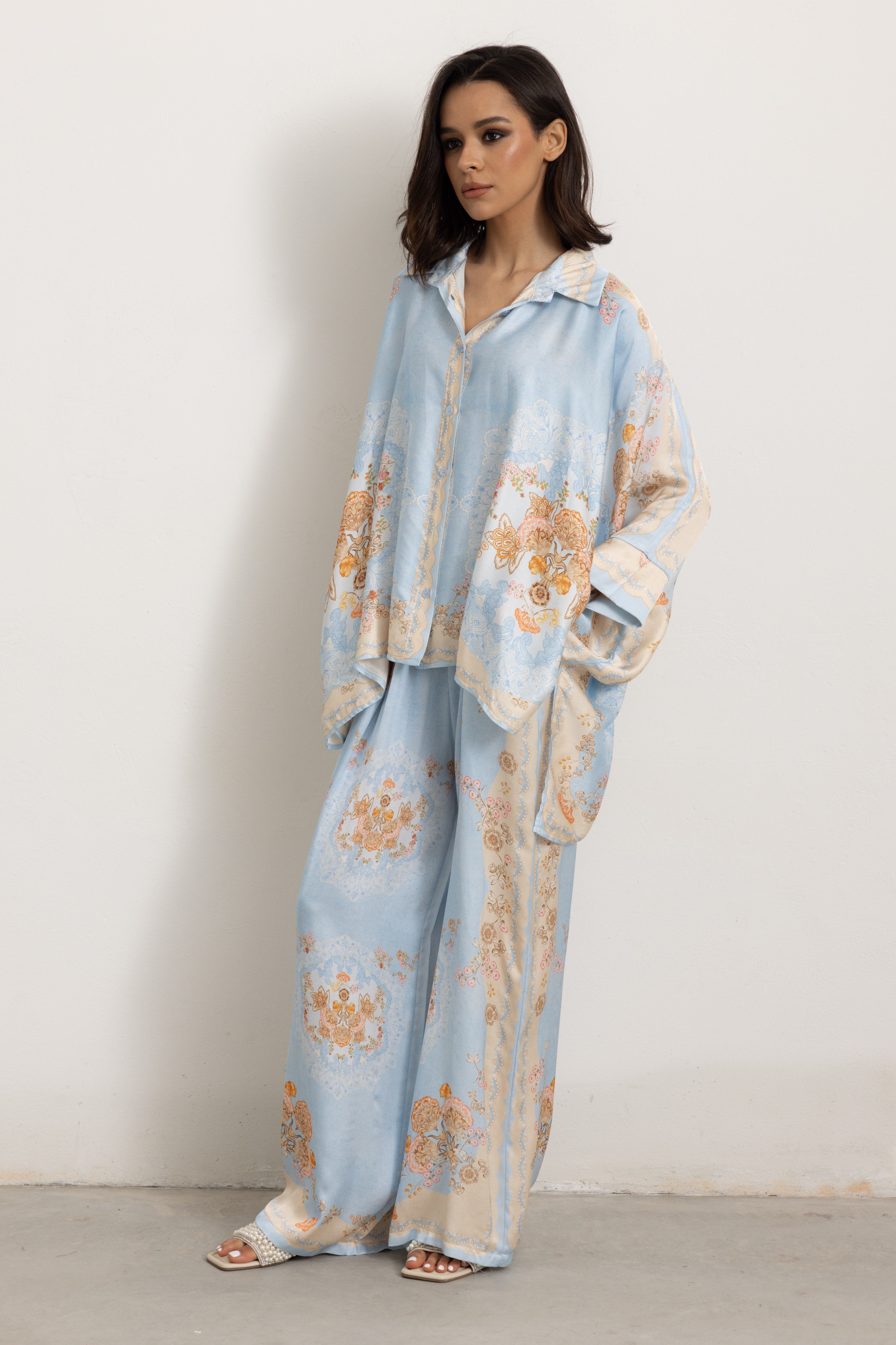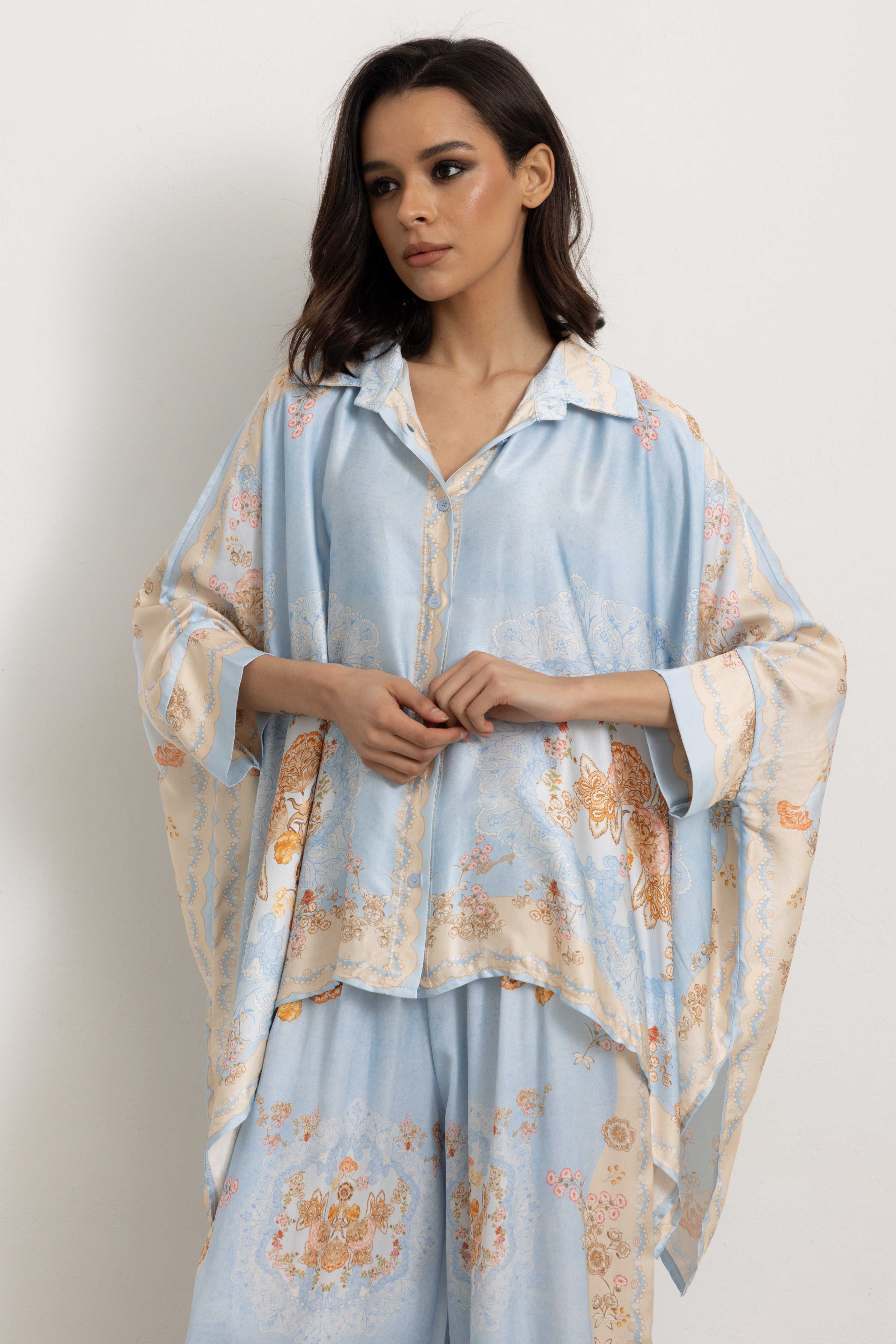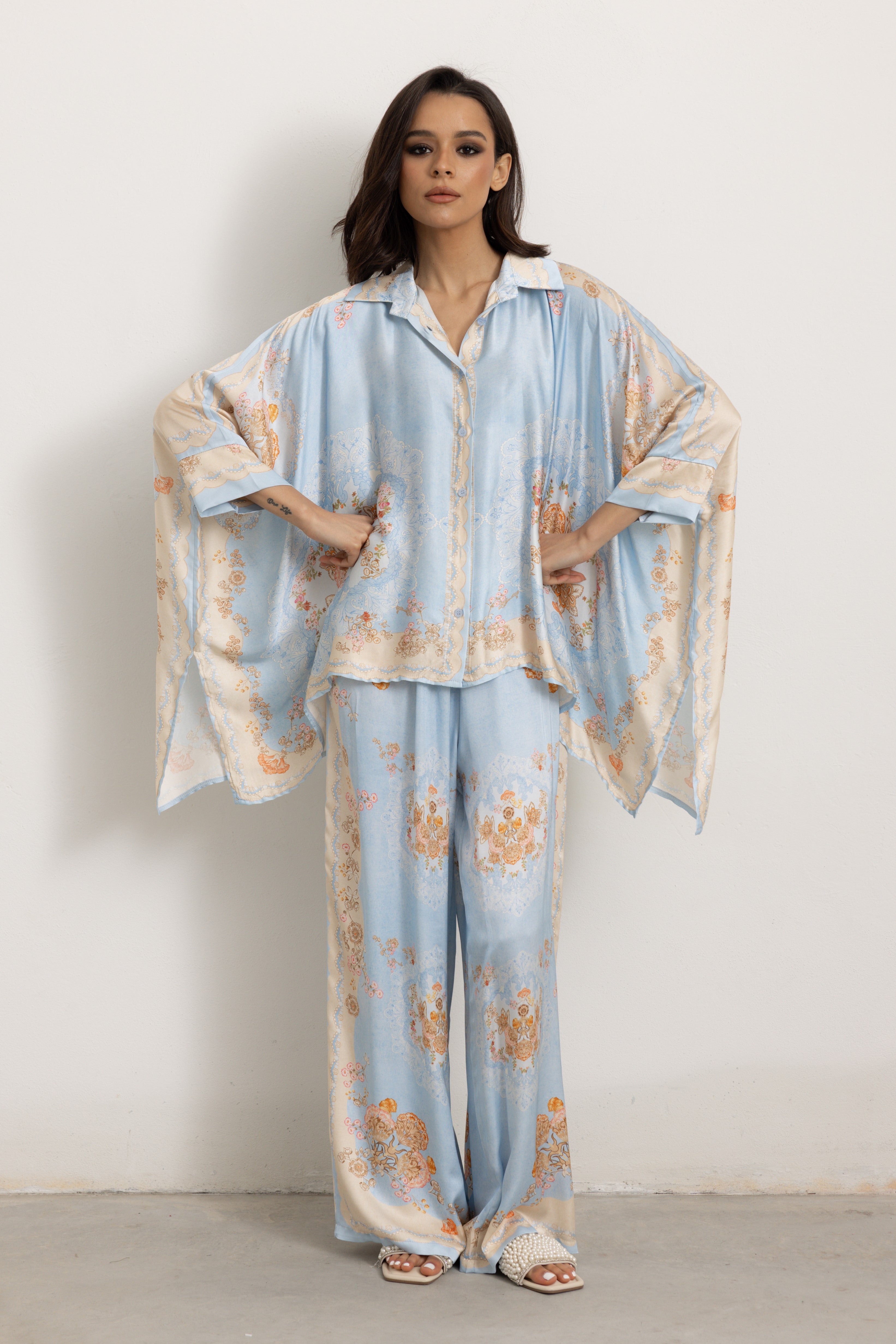 Il pantalone è elasticizzato in vita. La camicia si presenta molto ampia, leggera e fresca, ricorda un poncho con due spacchi laterali, creando un outfit sofisticato.