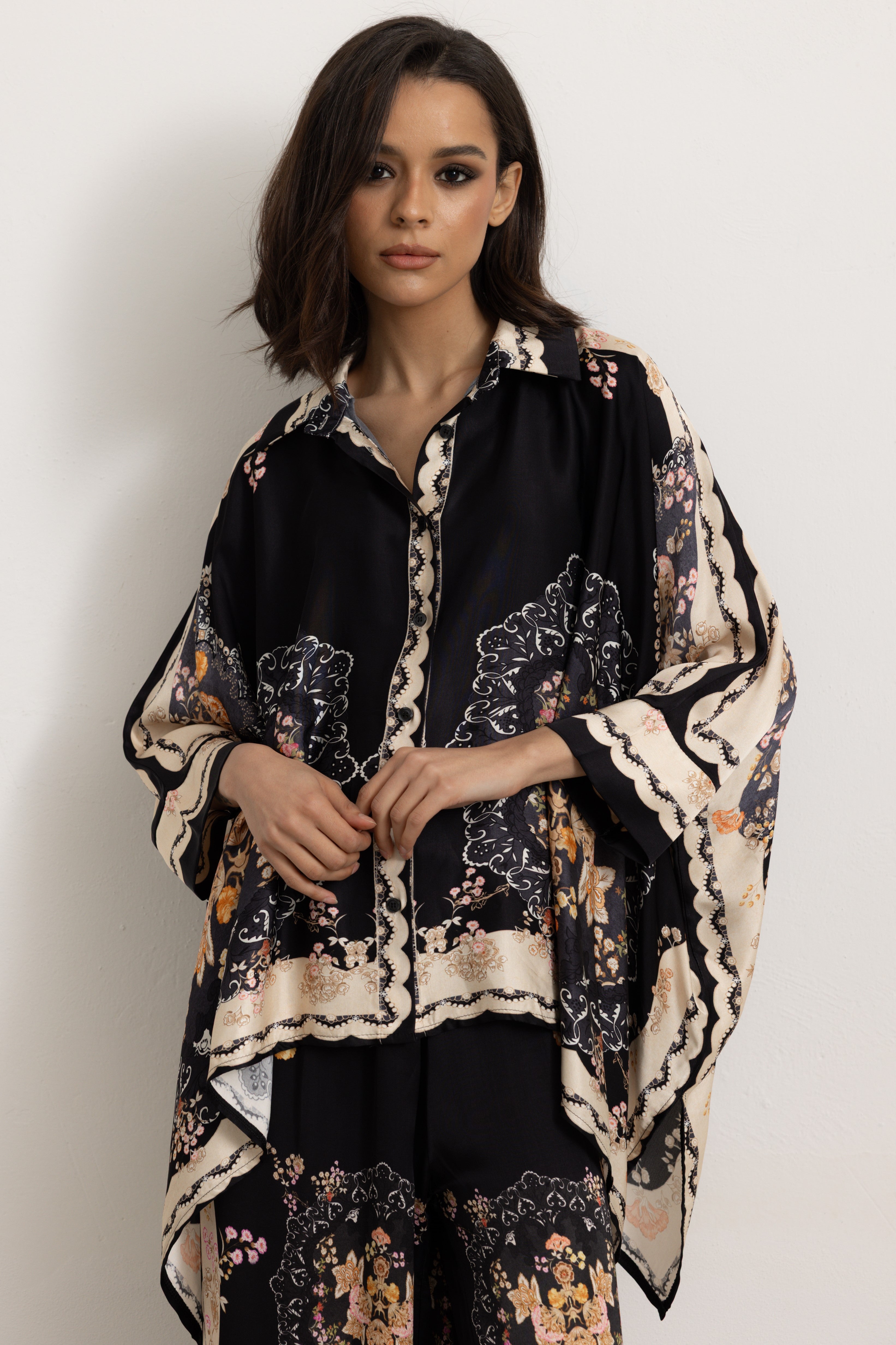 Il pantalone è elasticizzato in vita. La camicia si presenta molto ampia, leggera e fresca, ricorda un poncho con due spacchi laterali, creando un outfit sofisticato.