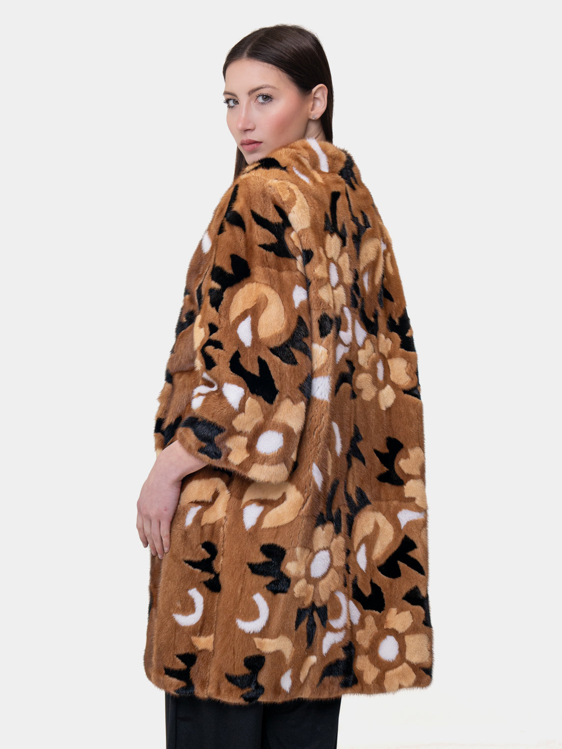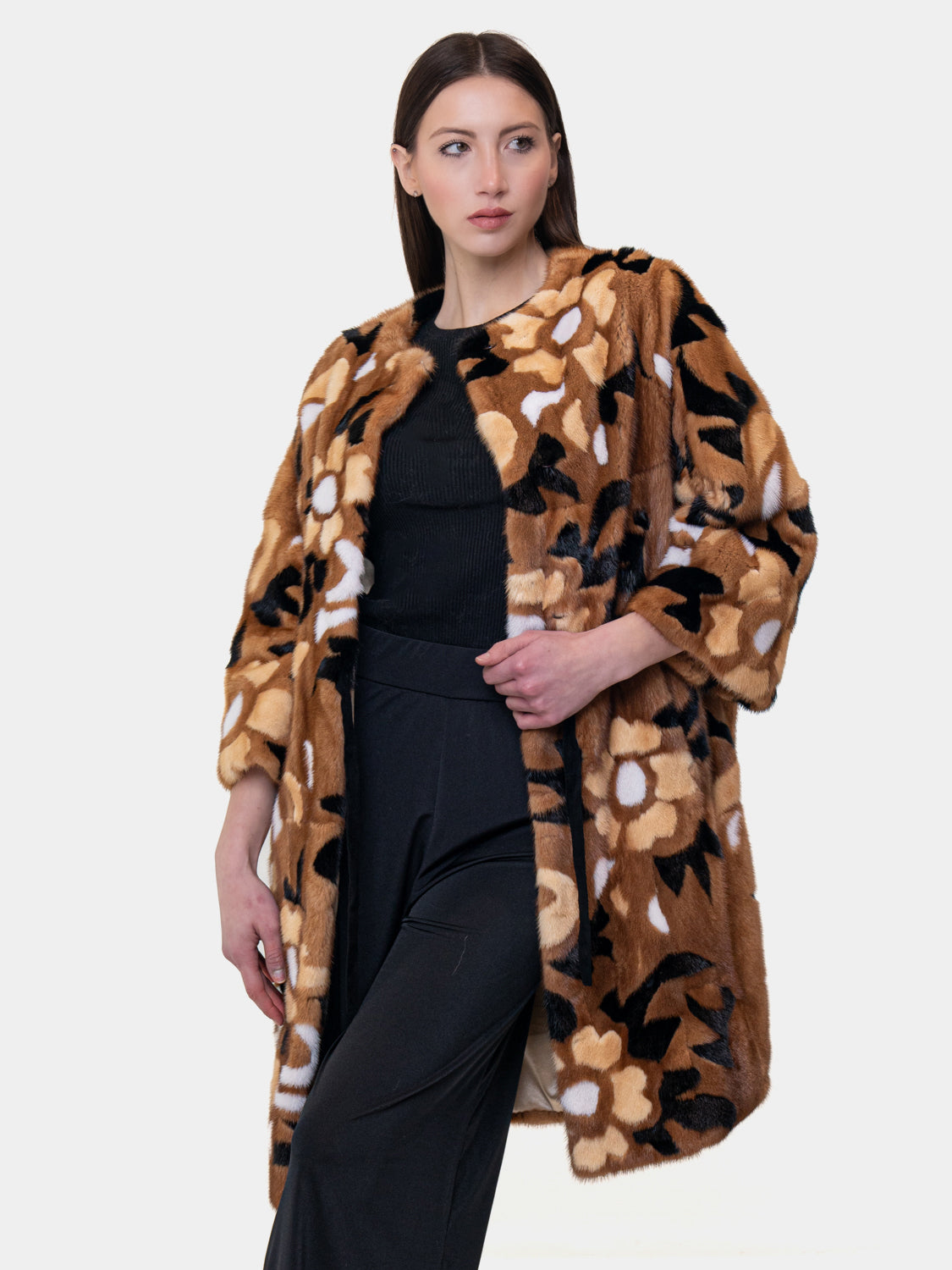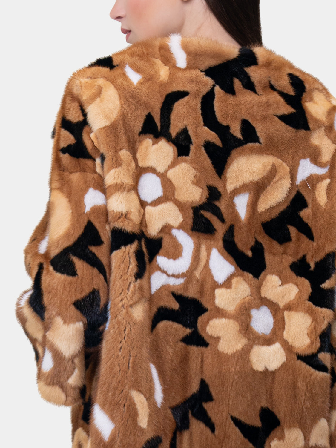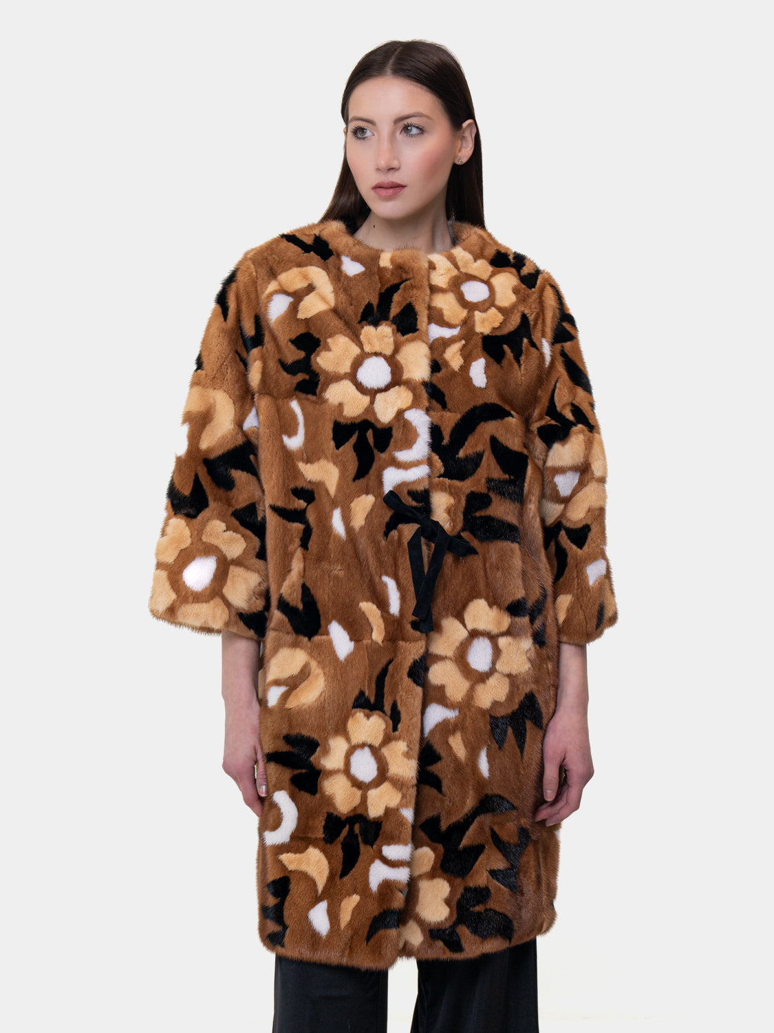 MA is the floral inlay that makes this coat a real object of desire. The reason, inspired by the period botanical illustrations, blossoms elegantly on the surface of the fur, creating a hypnotic contrast between the intense black background and the bright shades of the flowers. This precious processing, performed by hand with meticulous skill, requires hours of dedication and technical virtuosity to achieve a result of absolute perfection.