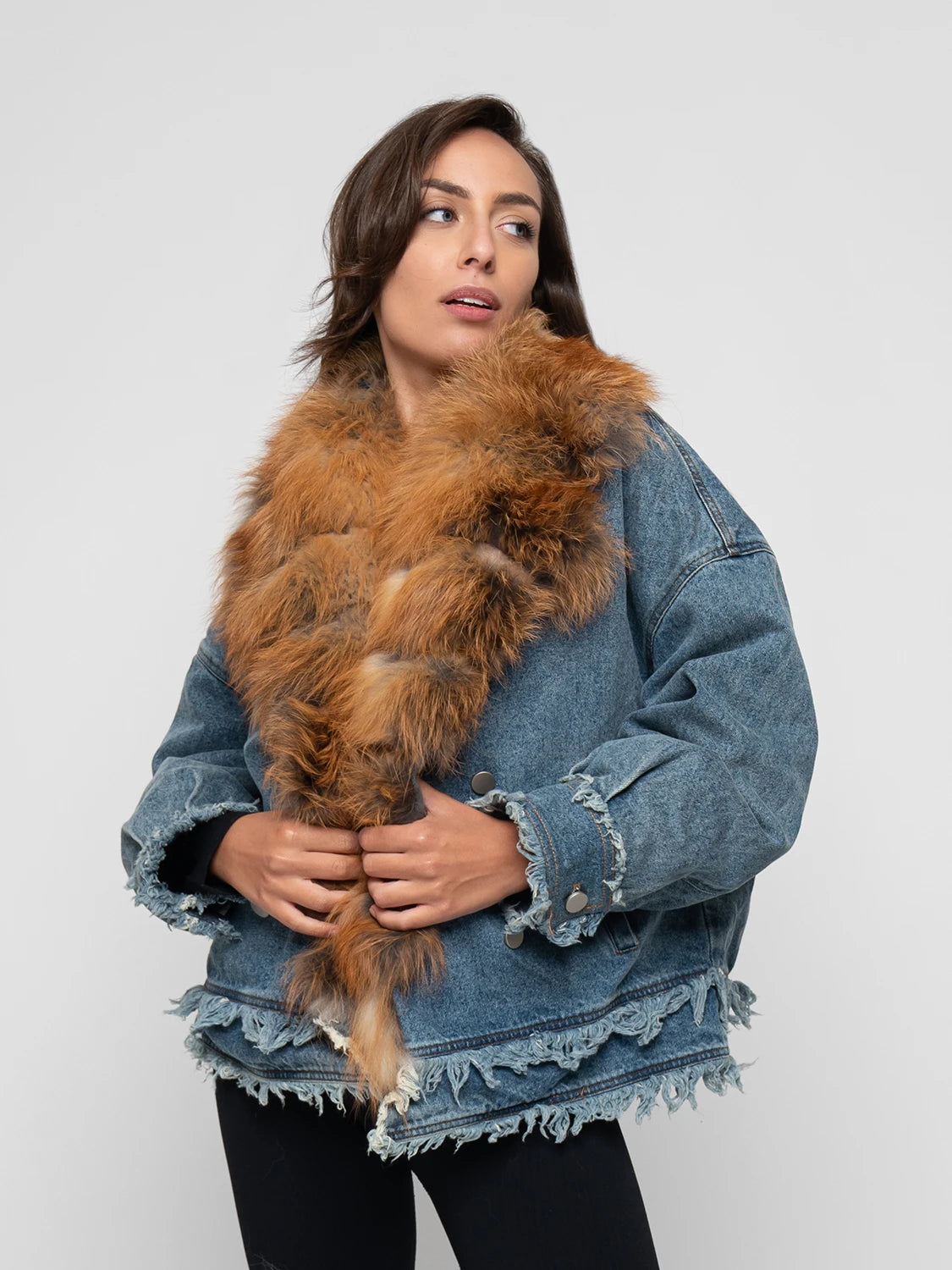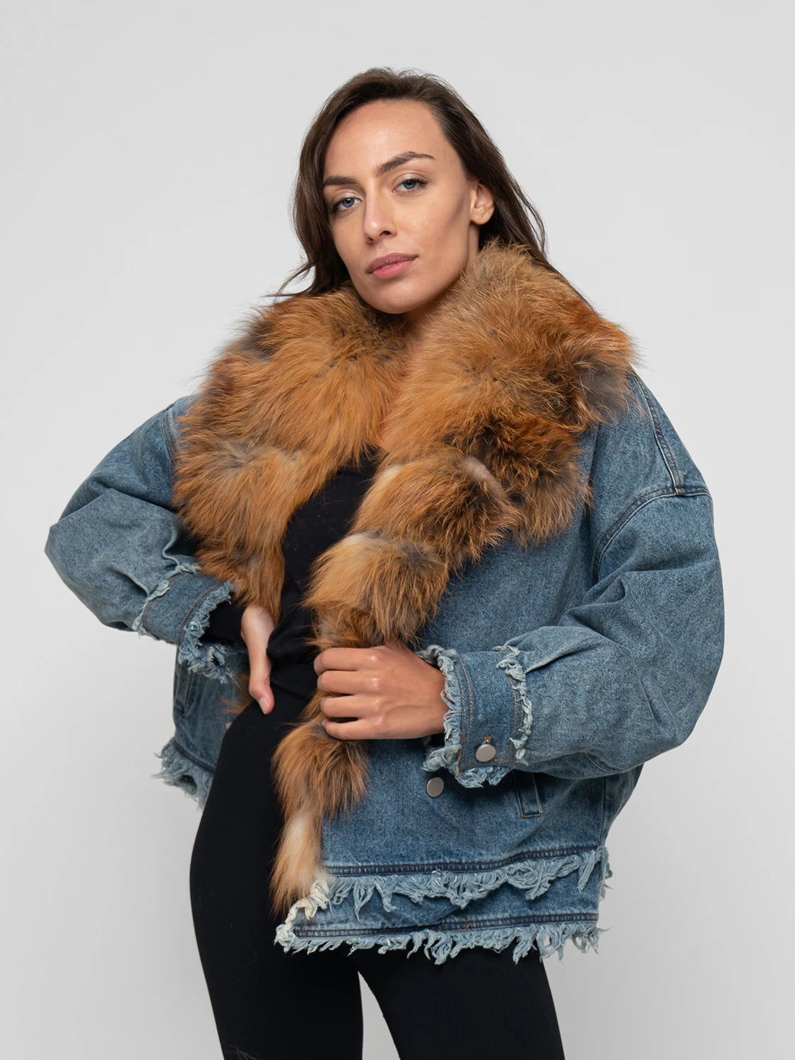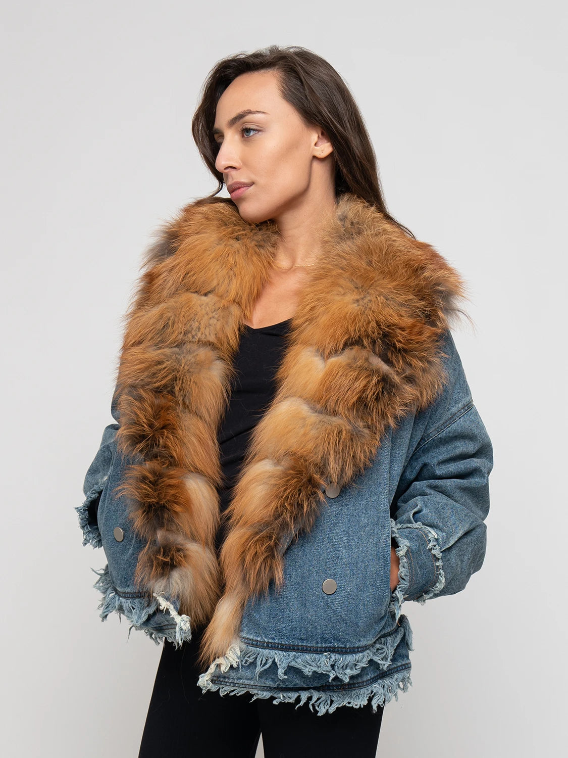 Hot denim jacket, entirely lined and padded. Borded by fox fur, available in several colors