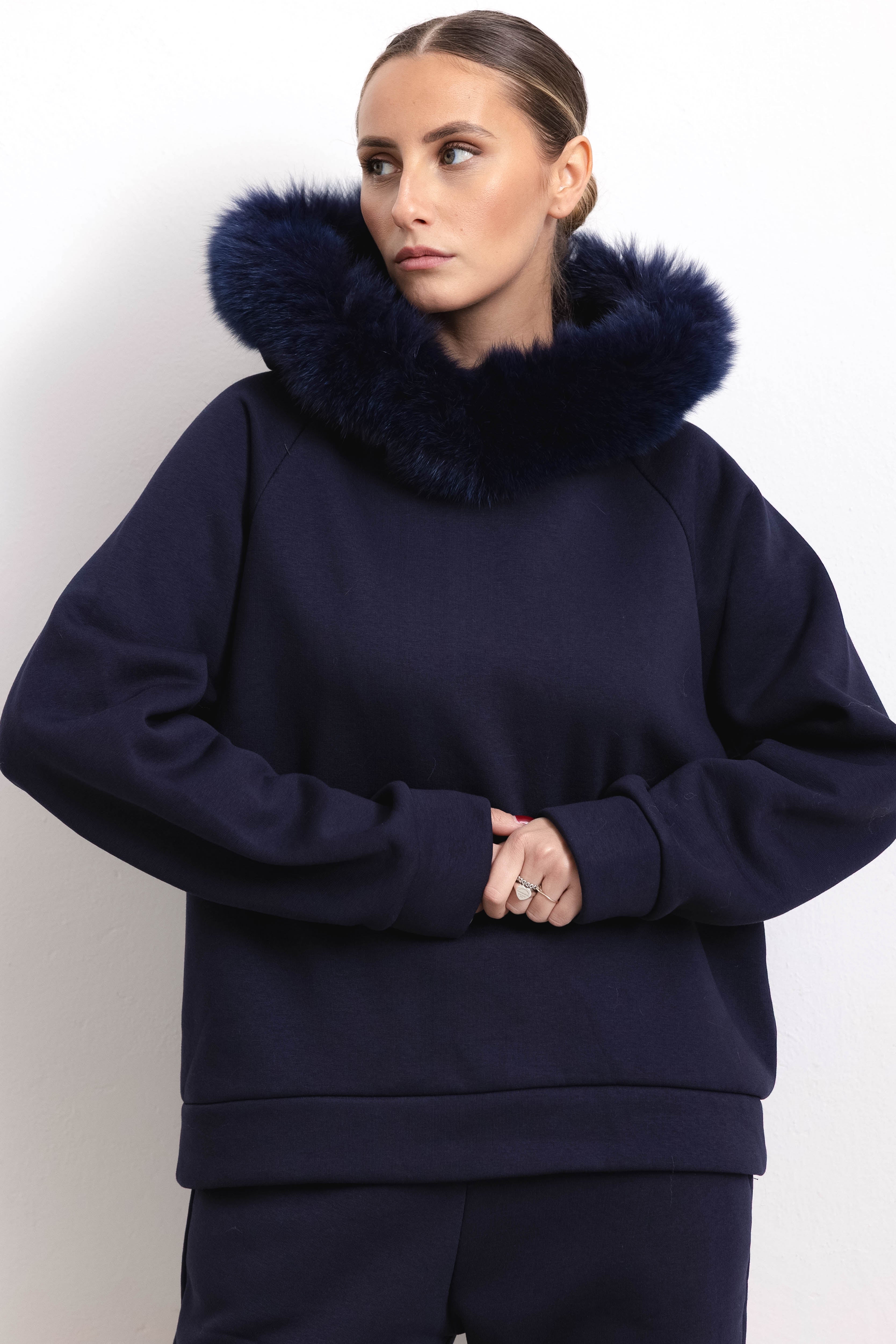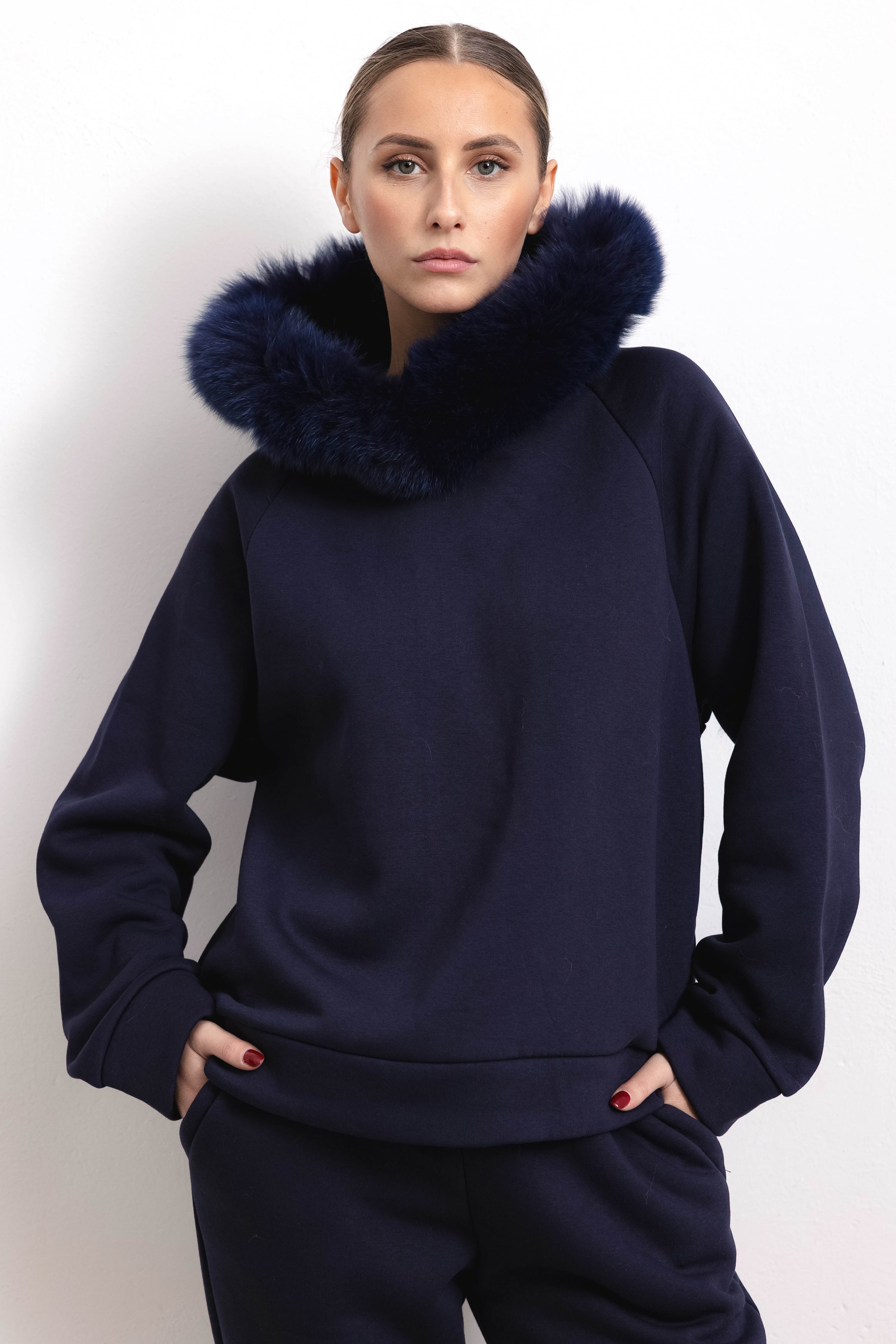 PORTO VENERE - Tuta con bordatura su cappuccio in volpe (Blu)
