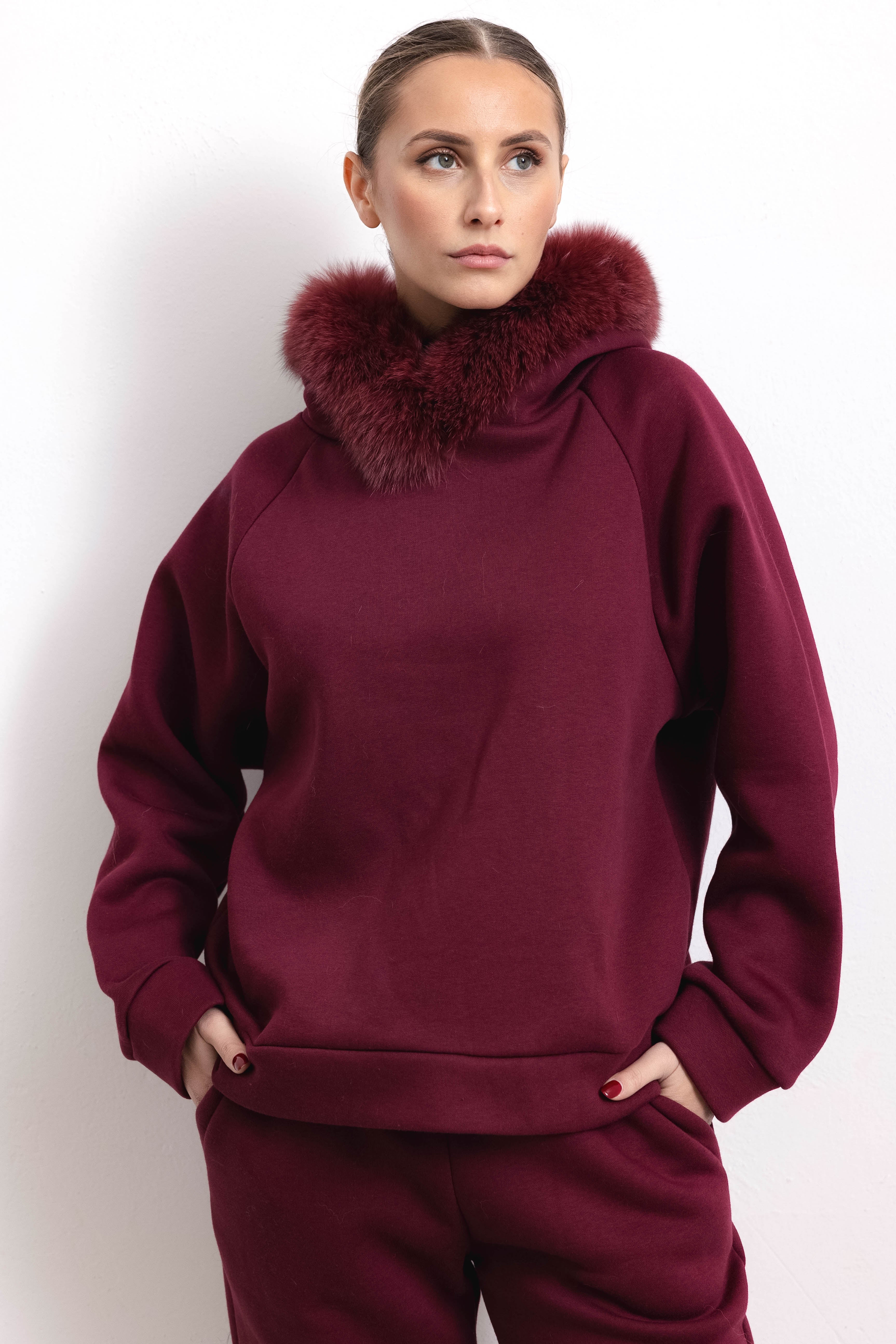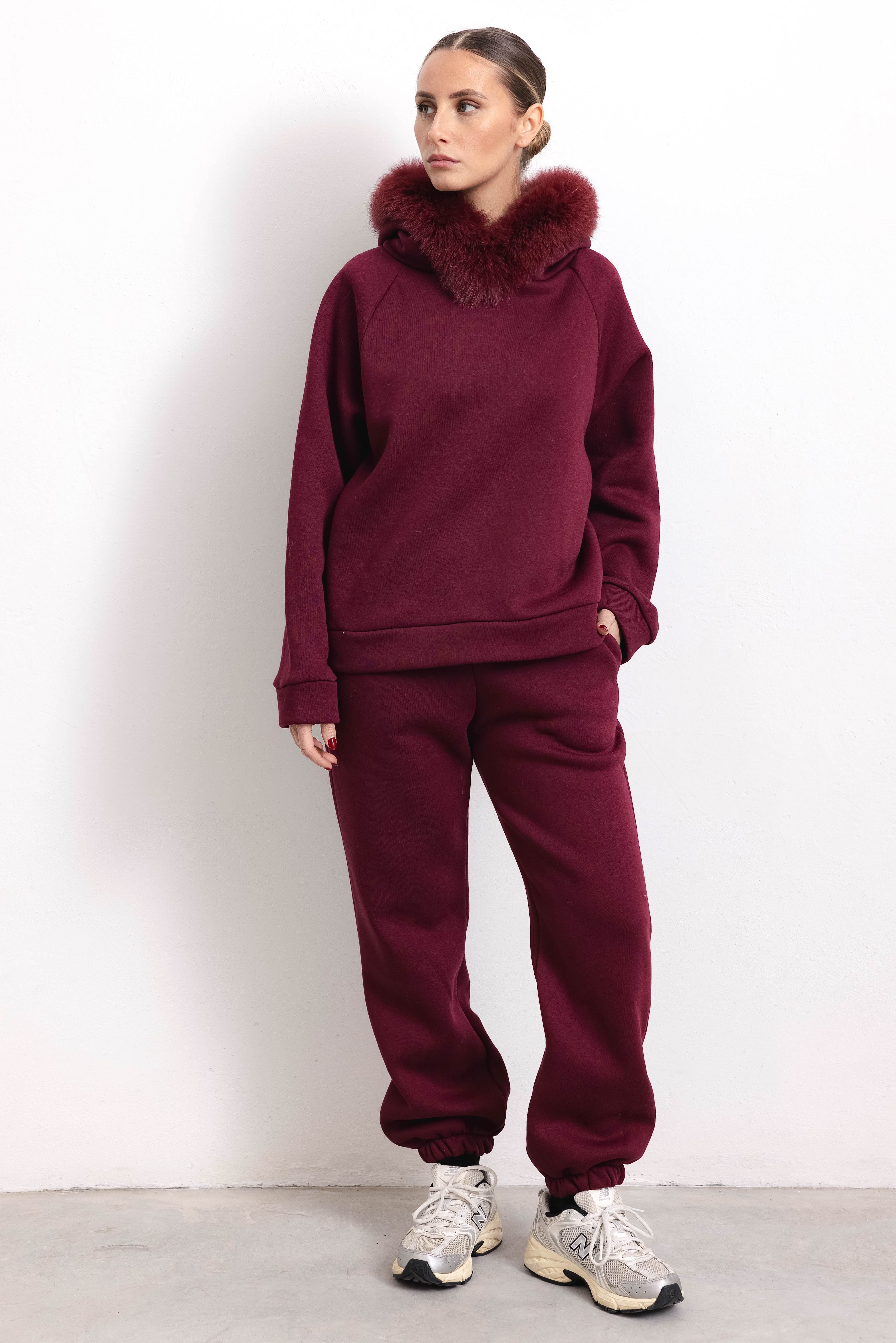 PORTO VENERE - Tuta con bordatura su cappuccio in volpe (Bordeaux)