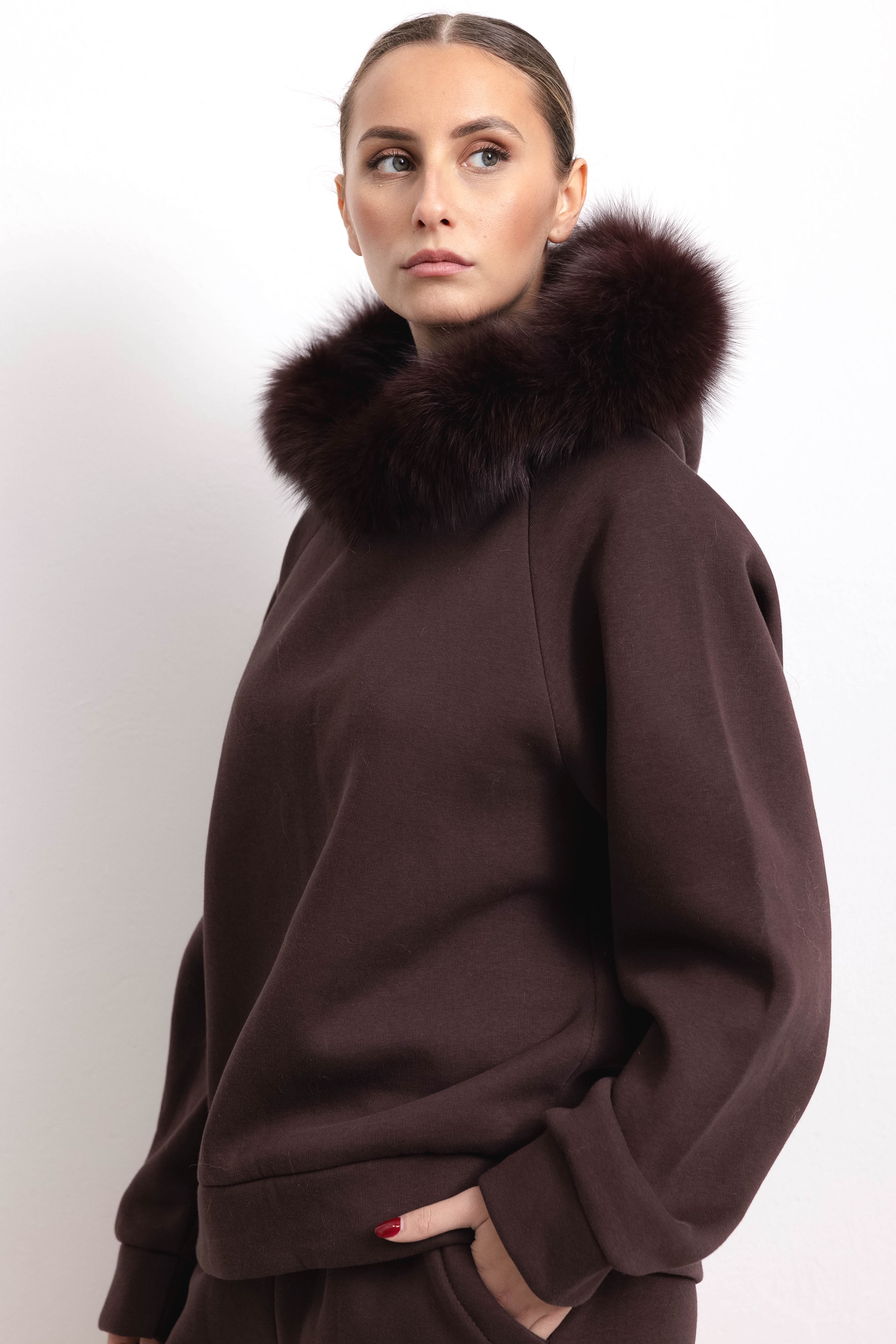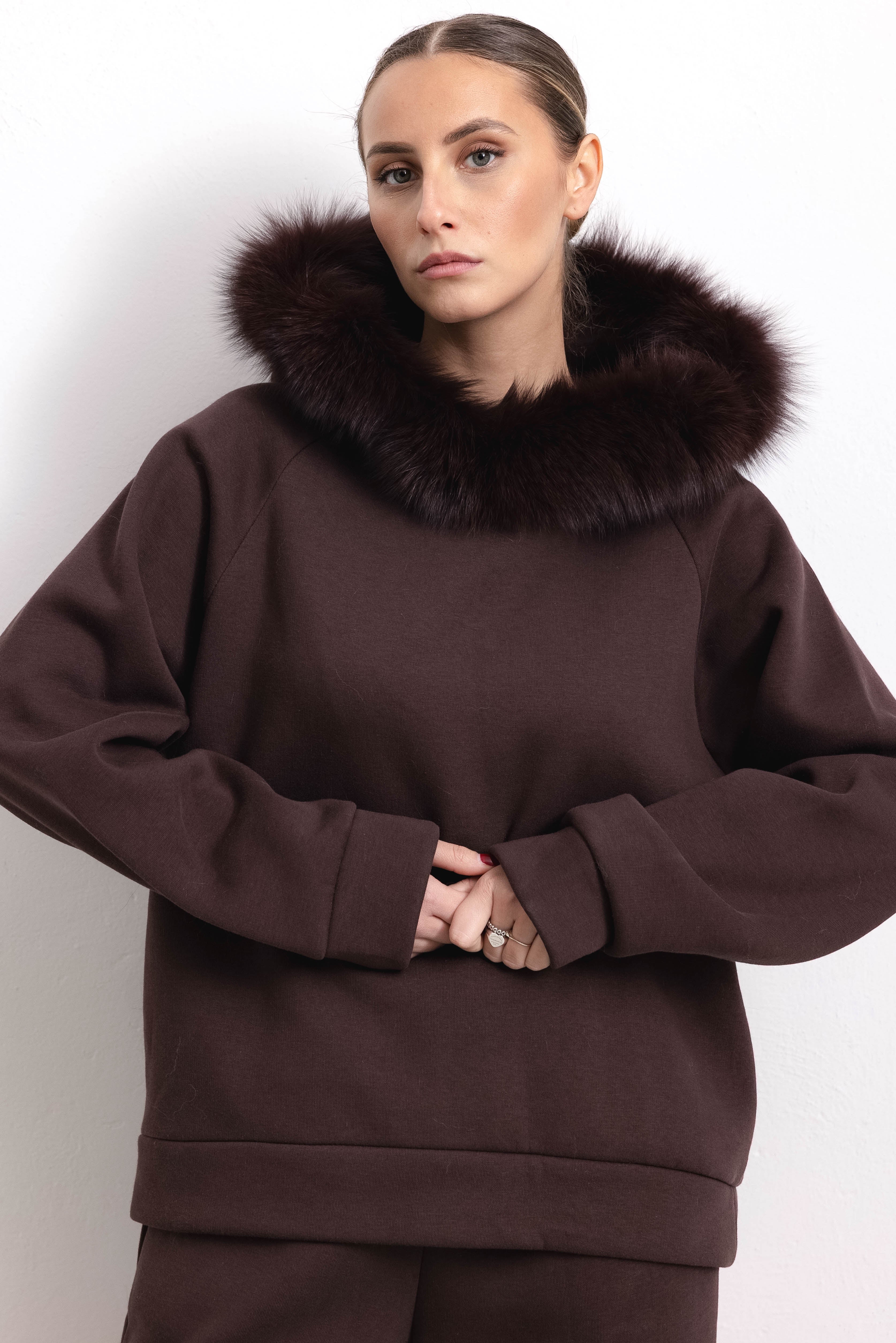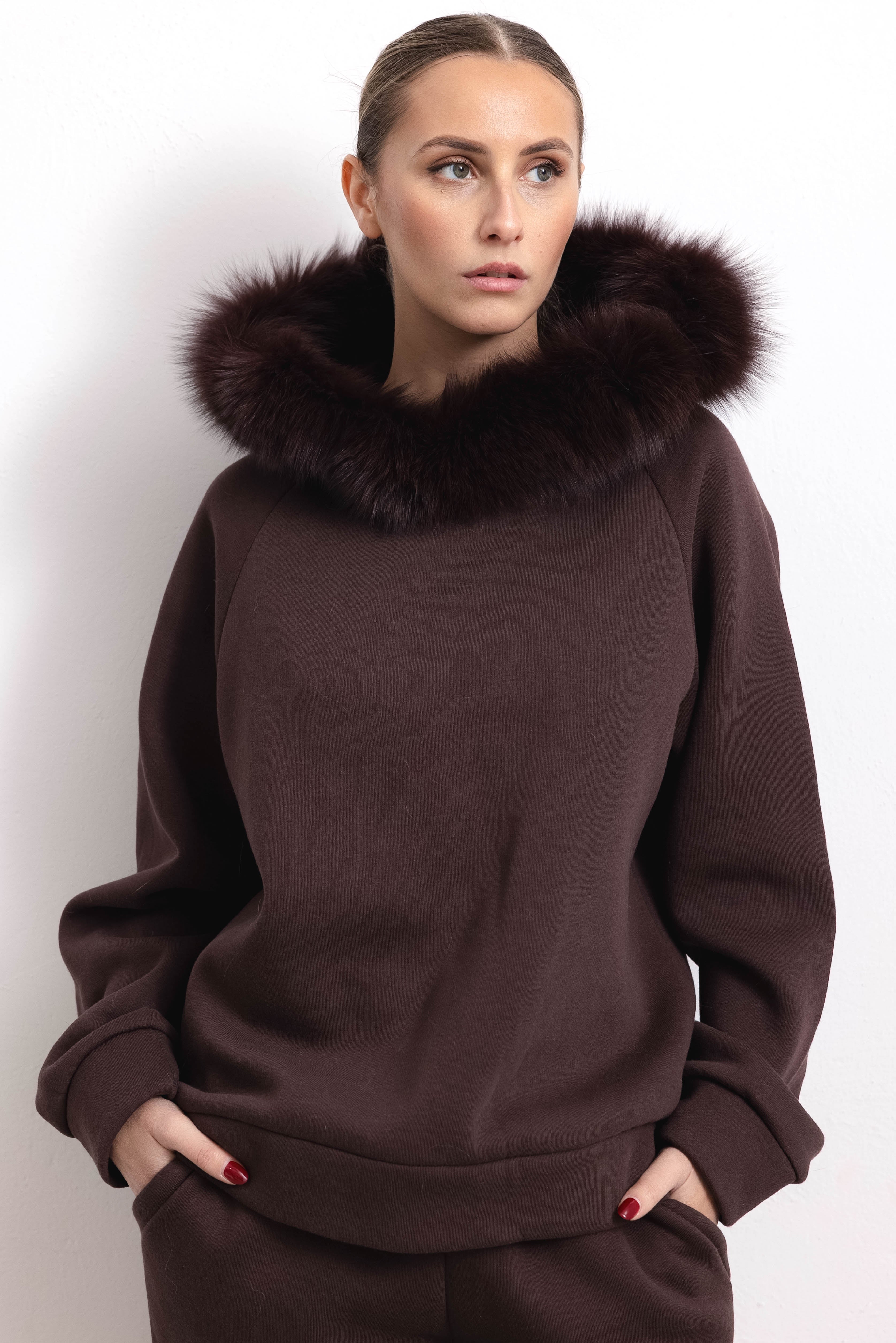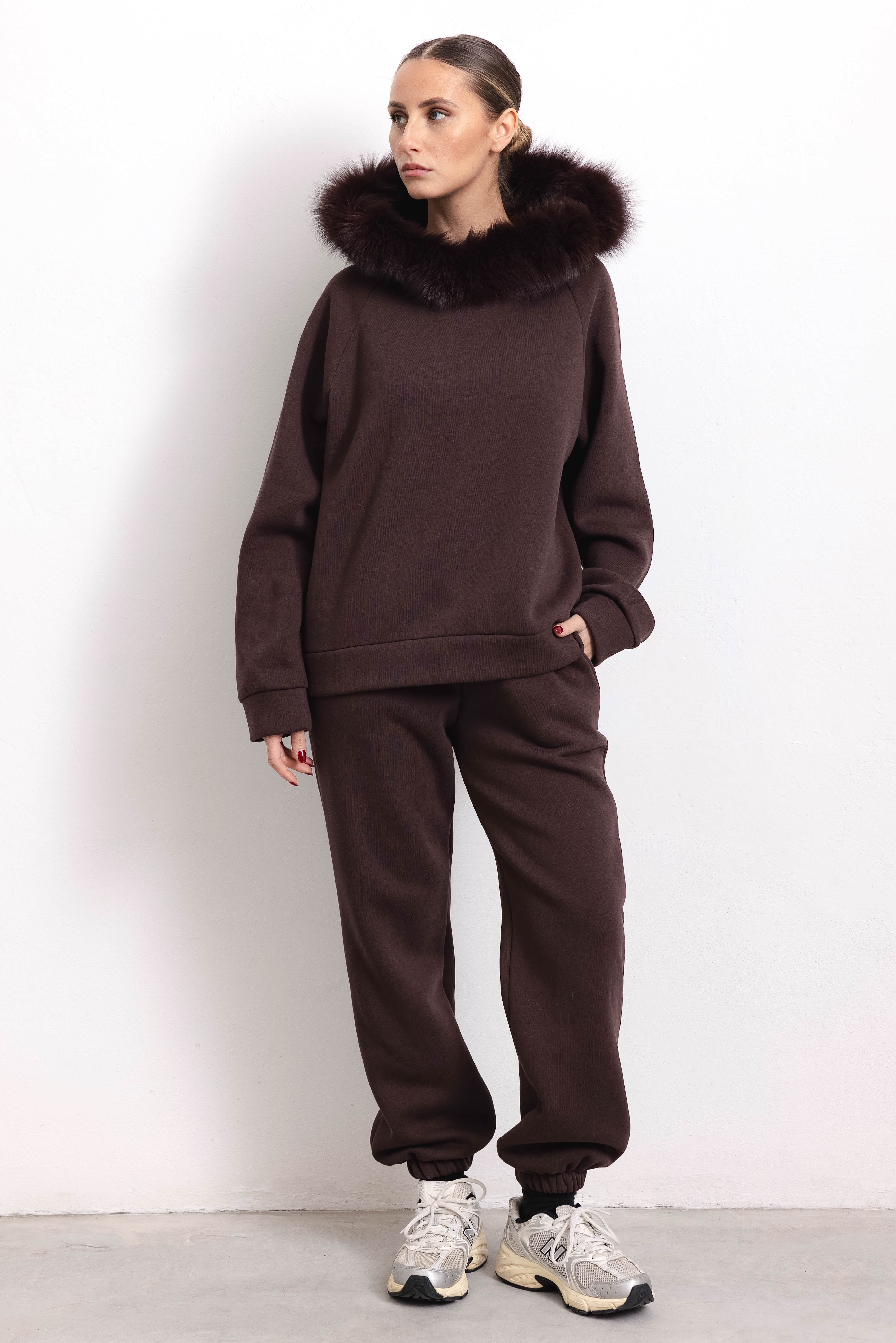 PORTO VENERE - Tuta con bordatura su cappuccio in volpe (Marrone)