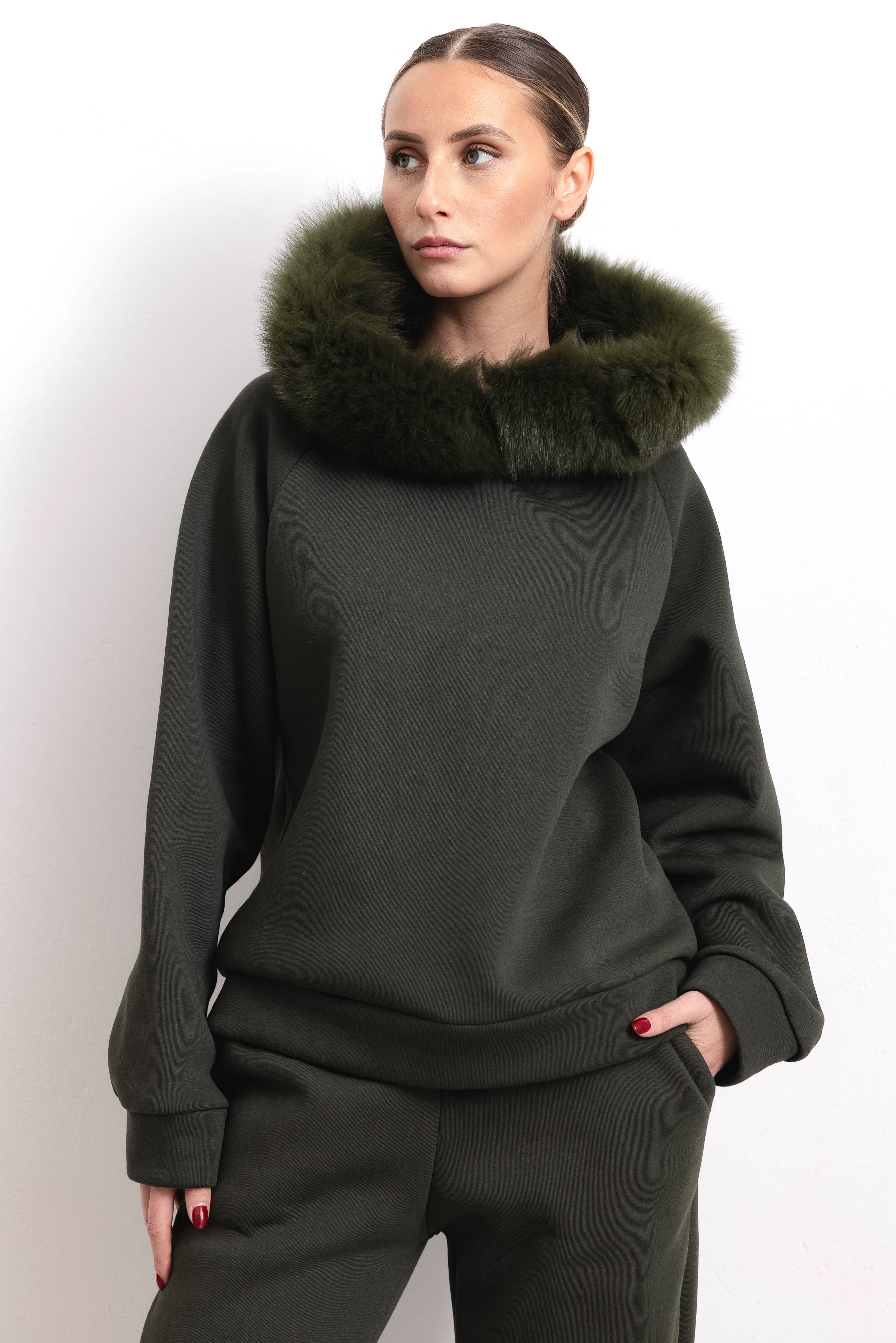 PORTO VENERE - Tuta con bordatura su cappuccio in volpe (Verde)