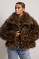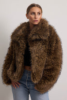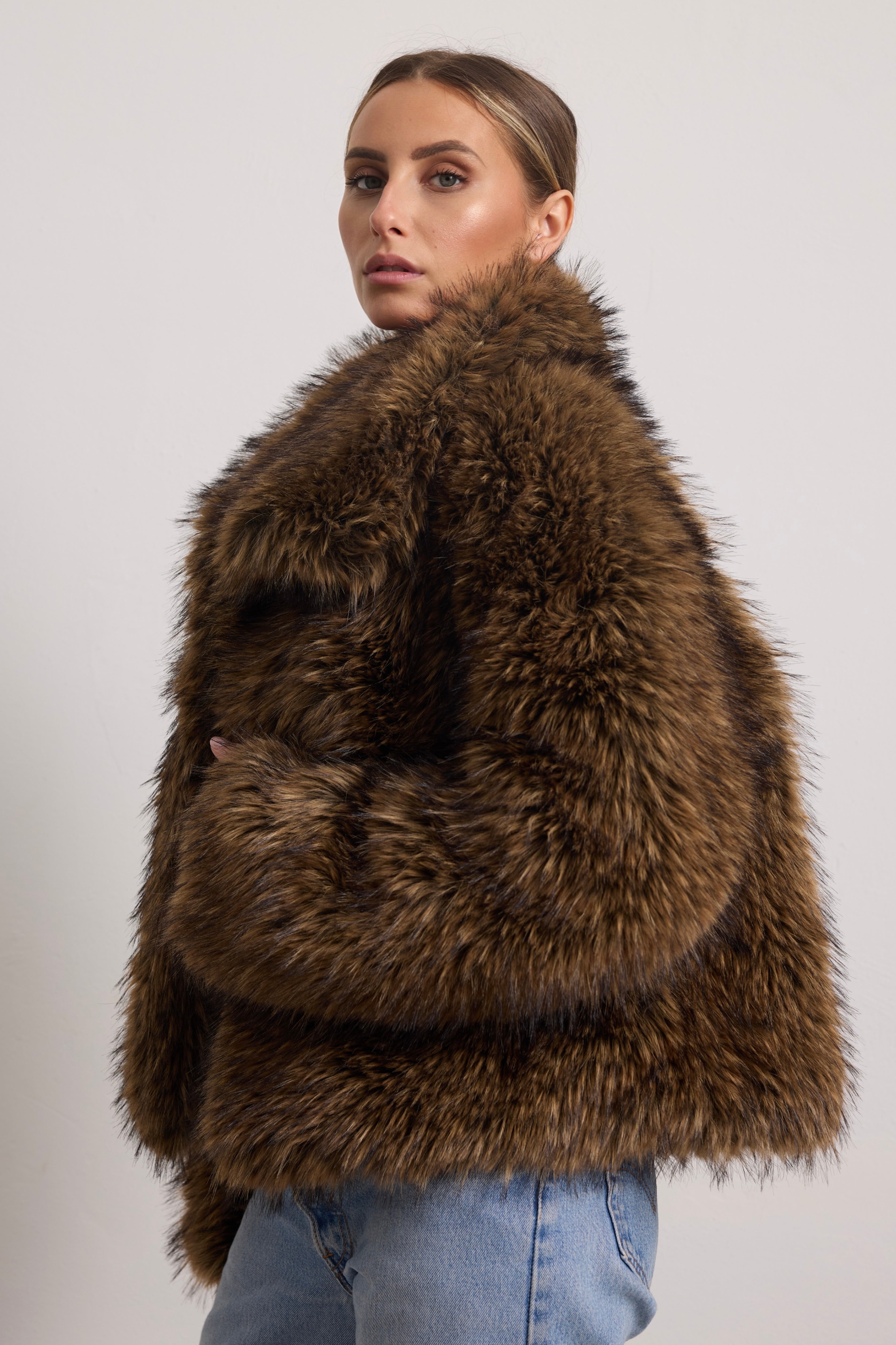 Giacchino corto in ecopelliccia con ampio collo e manica regolare.
