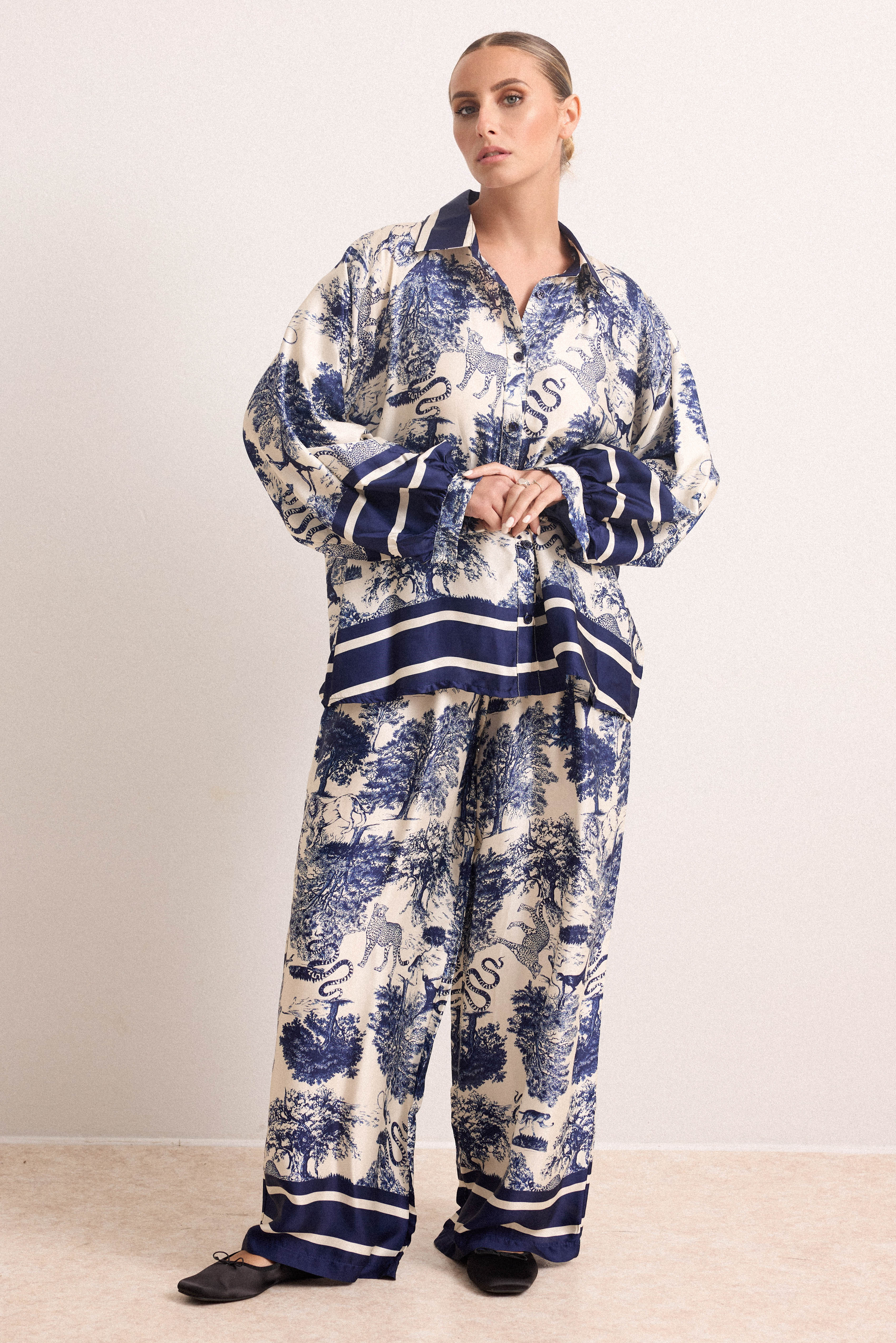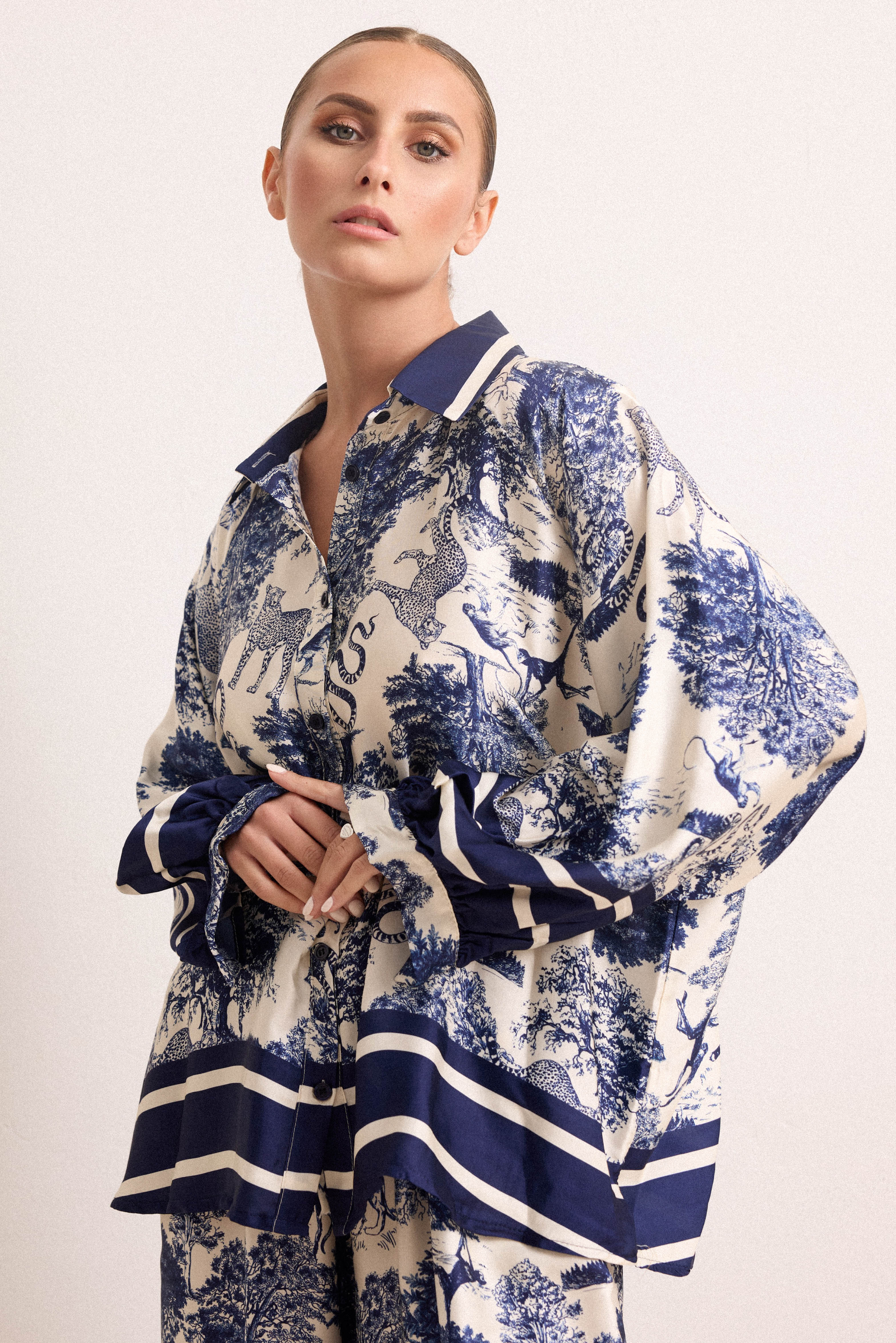 Completo composto da ampia camicia oversize dalle linee morbide, con bottoni centrali, colletto classico e maniche lunghe.