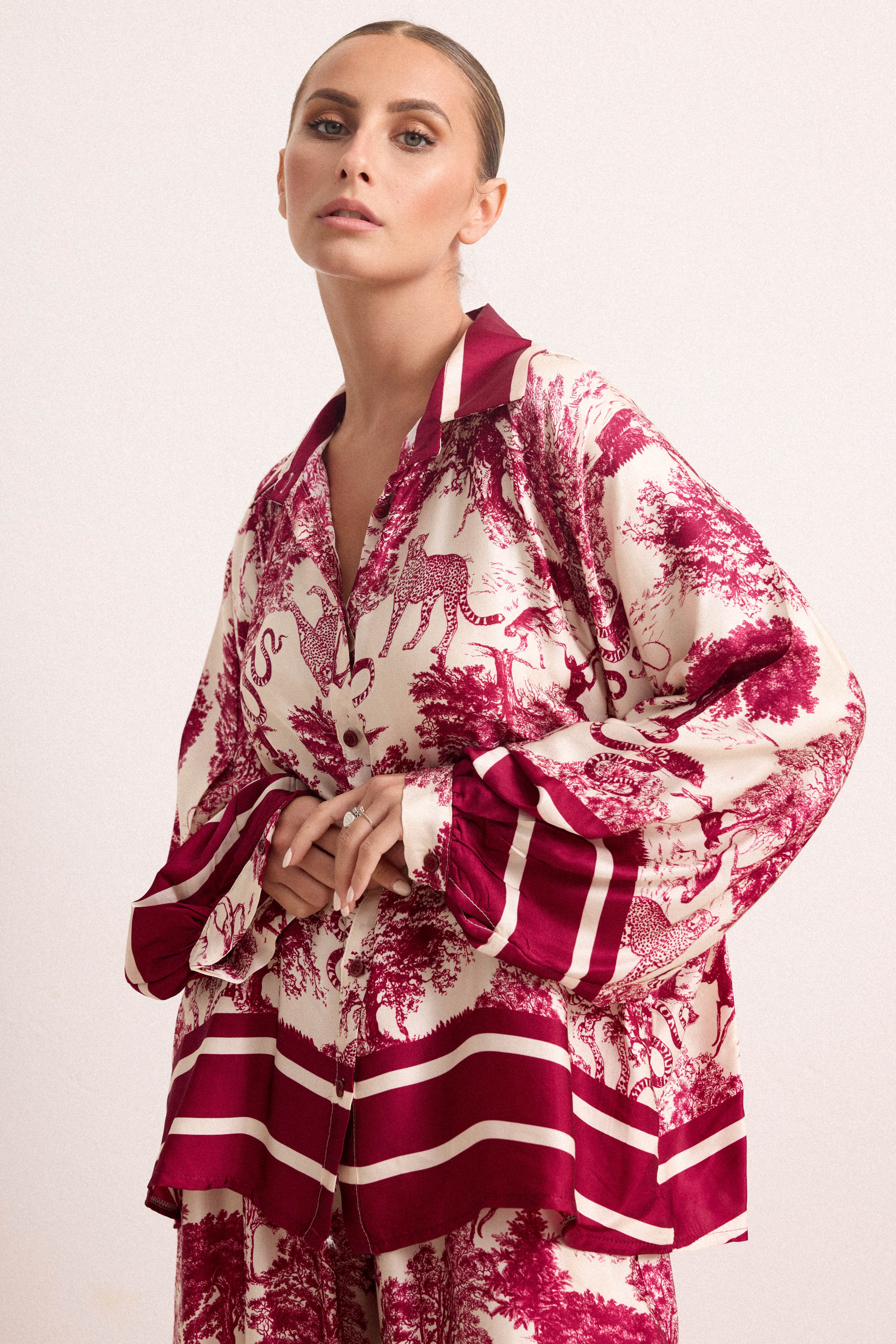 Completo composto da ampia camicia oversize dalle linee morbide, con bottoni centrali, colletto classico e maniche lunghe.