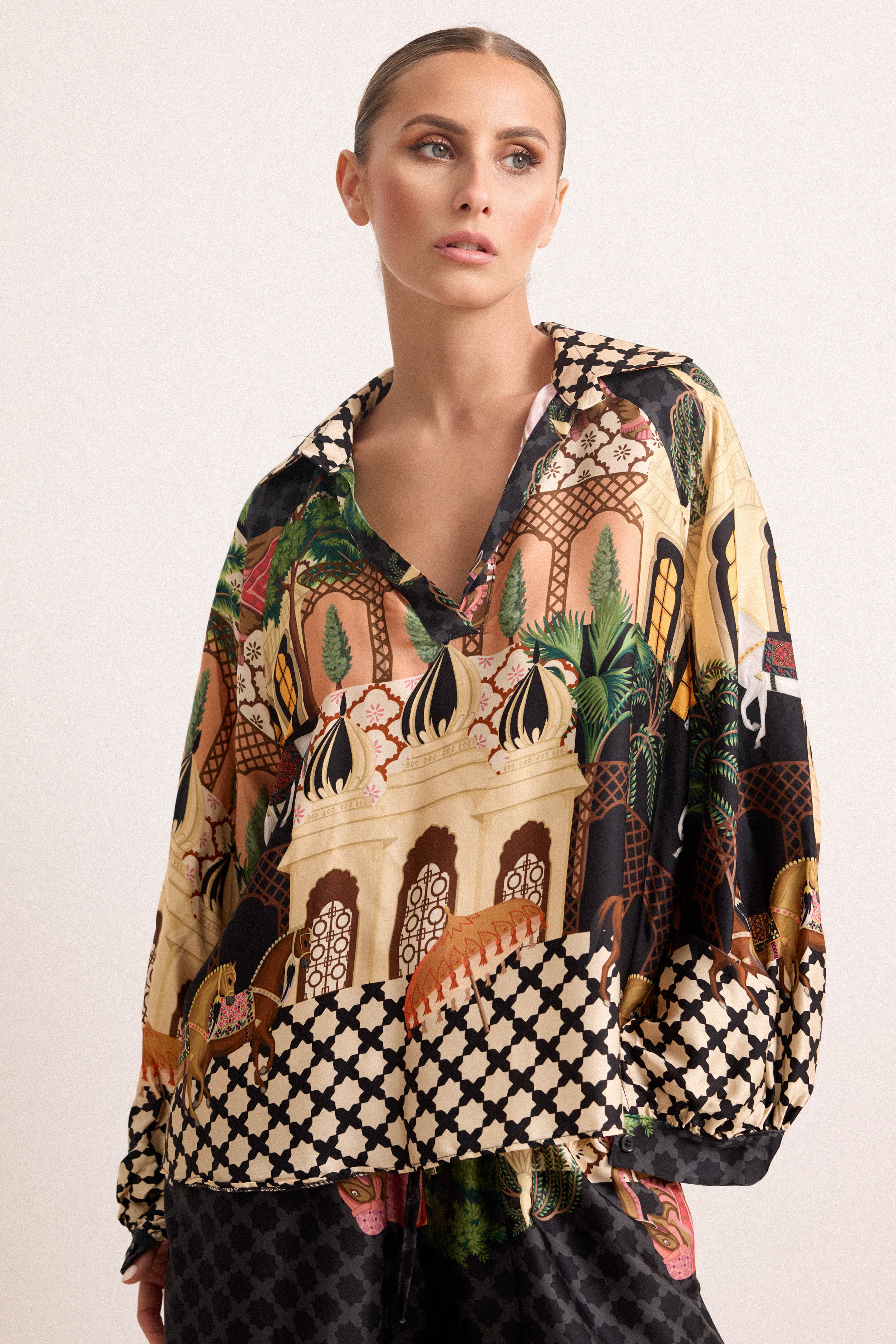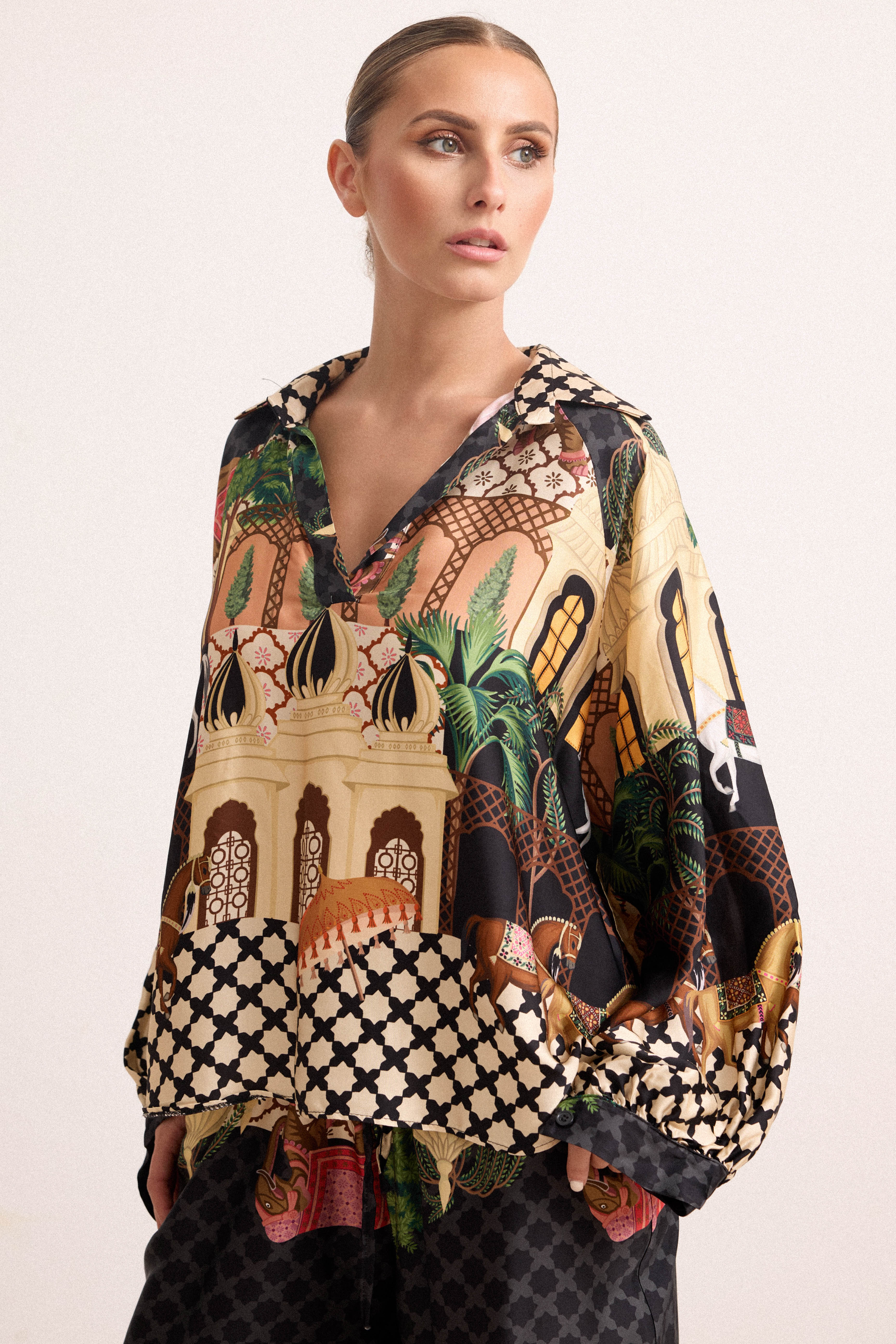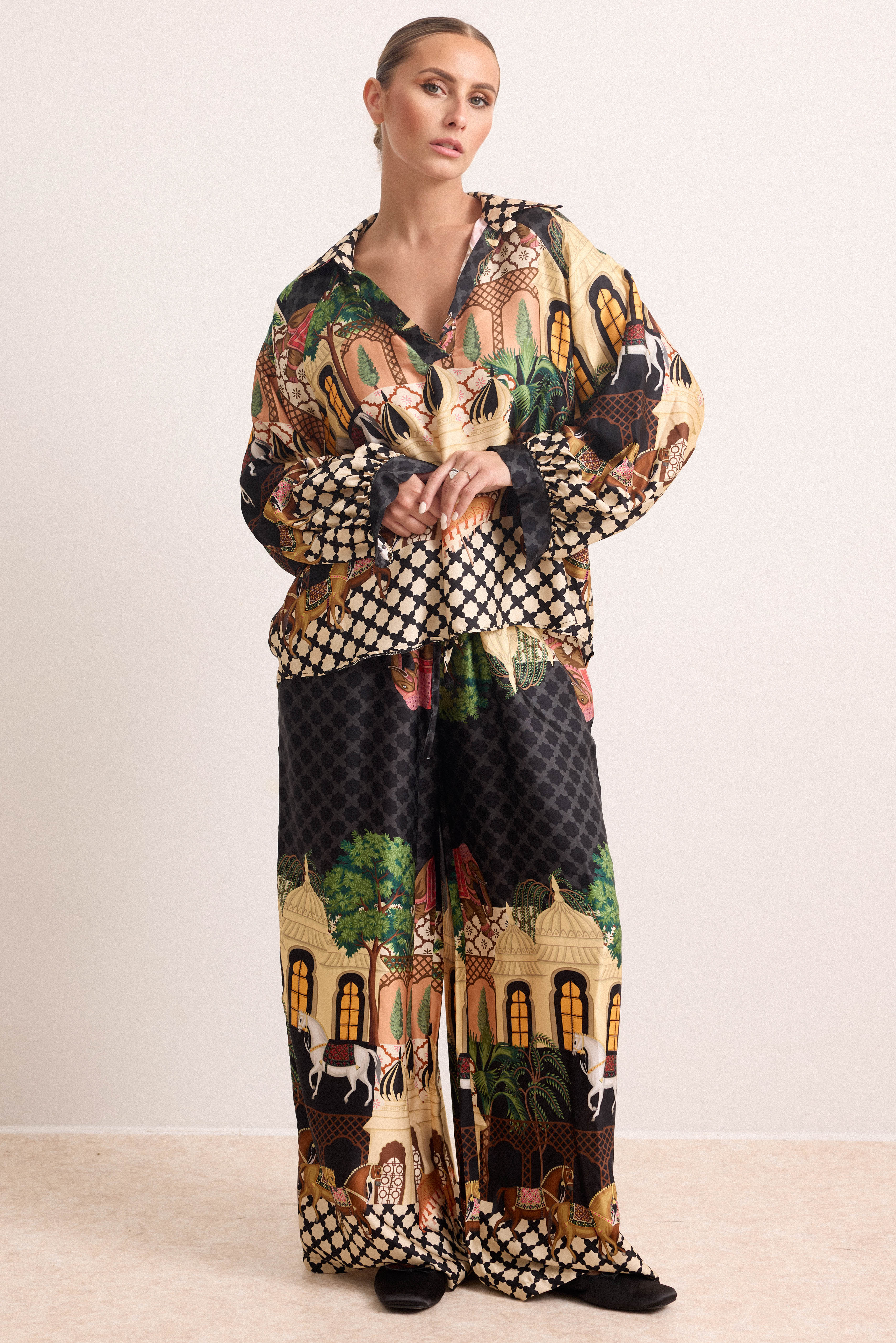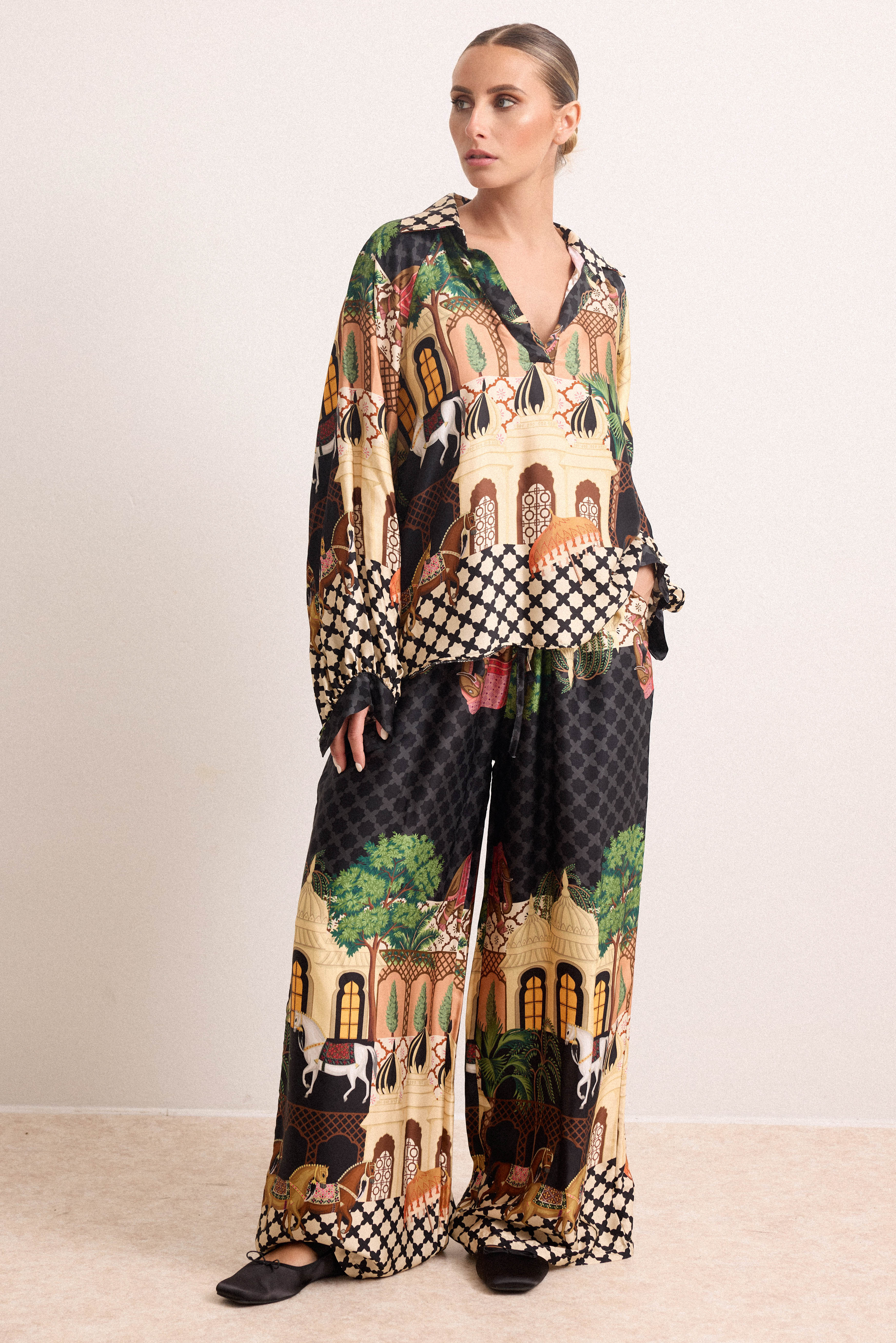 Completo comodo e fresco, composto da camicia con colletto a V ed ampio pantalone elasticizzato in vita.