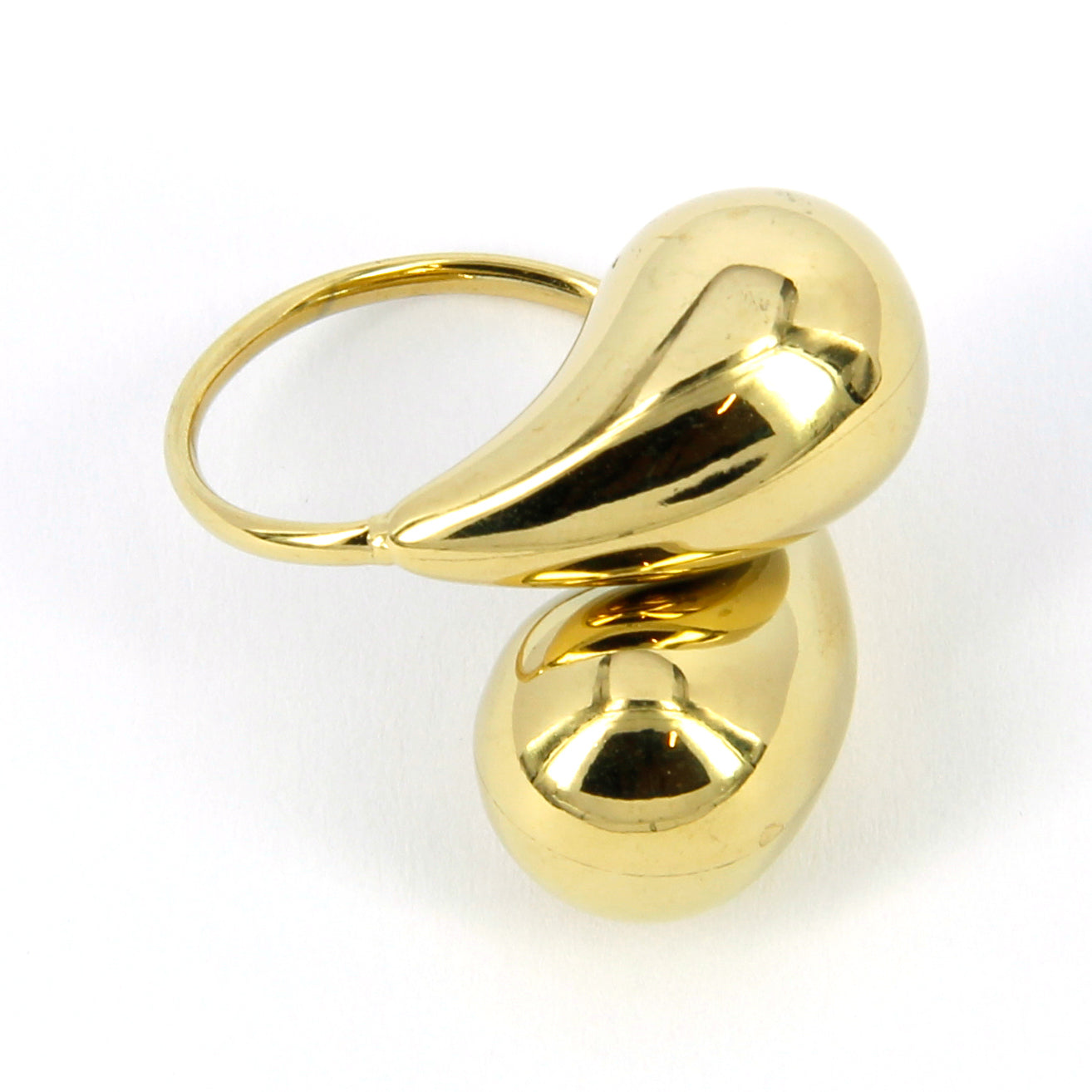 This contemporary ring has a bold and sculptural design that captures the eye with its organic and fluid forms. The central element of the ring is composed of two interconnected drop shapes, which seem to be enveloped and merged harmoniously.