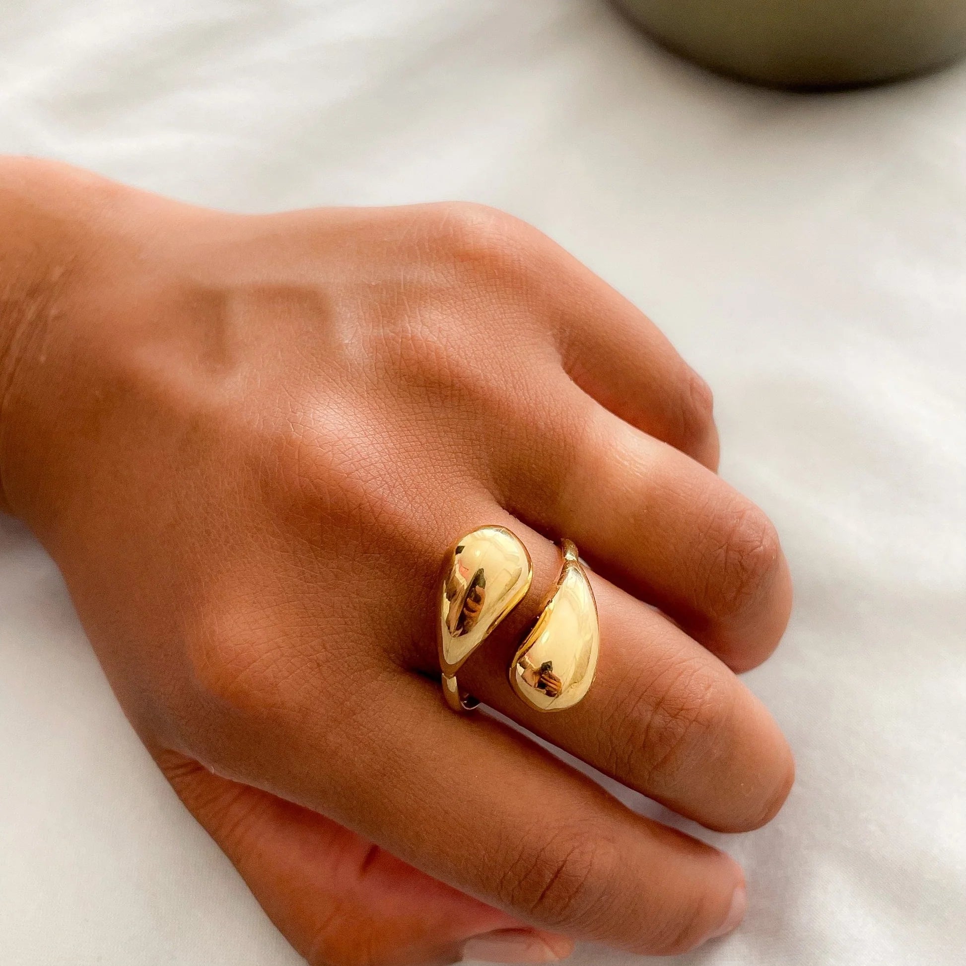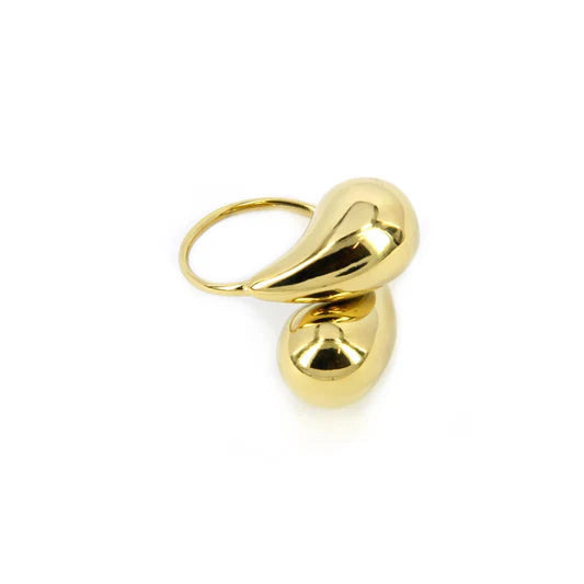 The ring of the ring is thin and minimal, allowing the sculptural shapes of the drops to be the focal point of design. This design choice creates a visual balance and guarantees that attention is concentrated on the central elements.