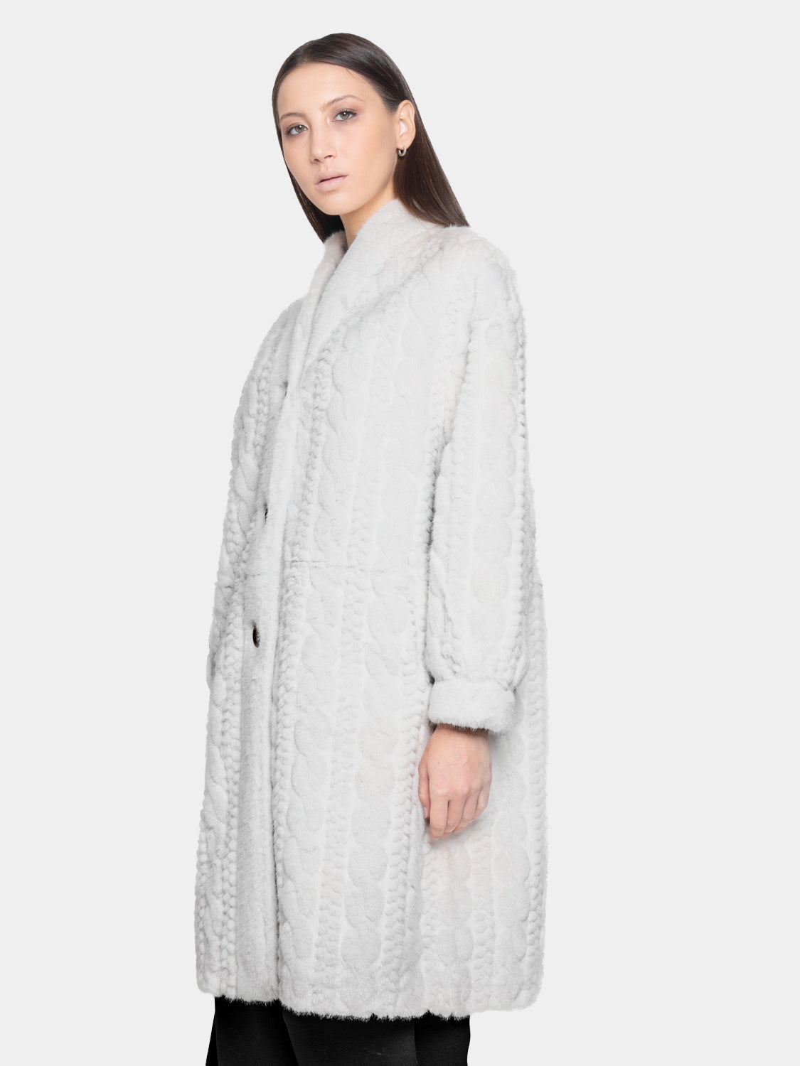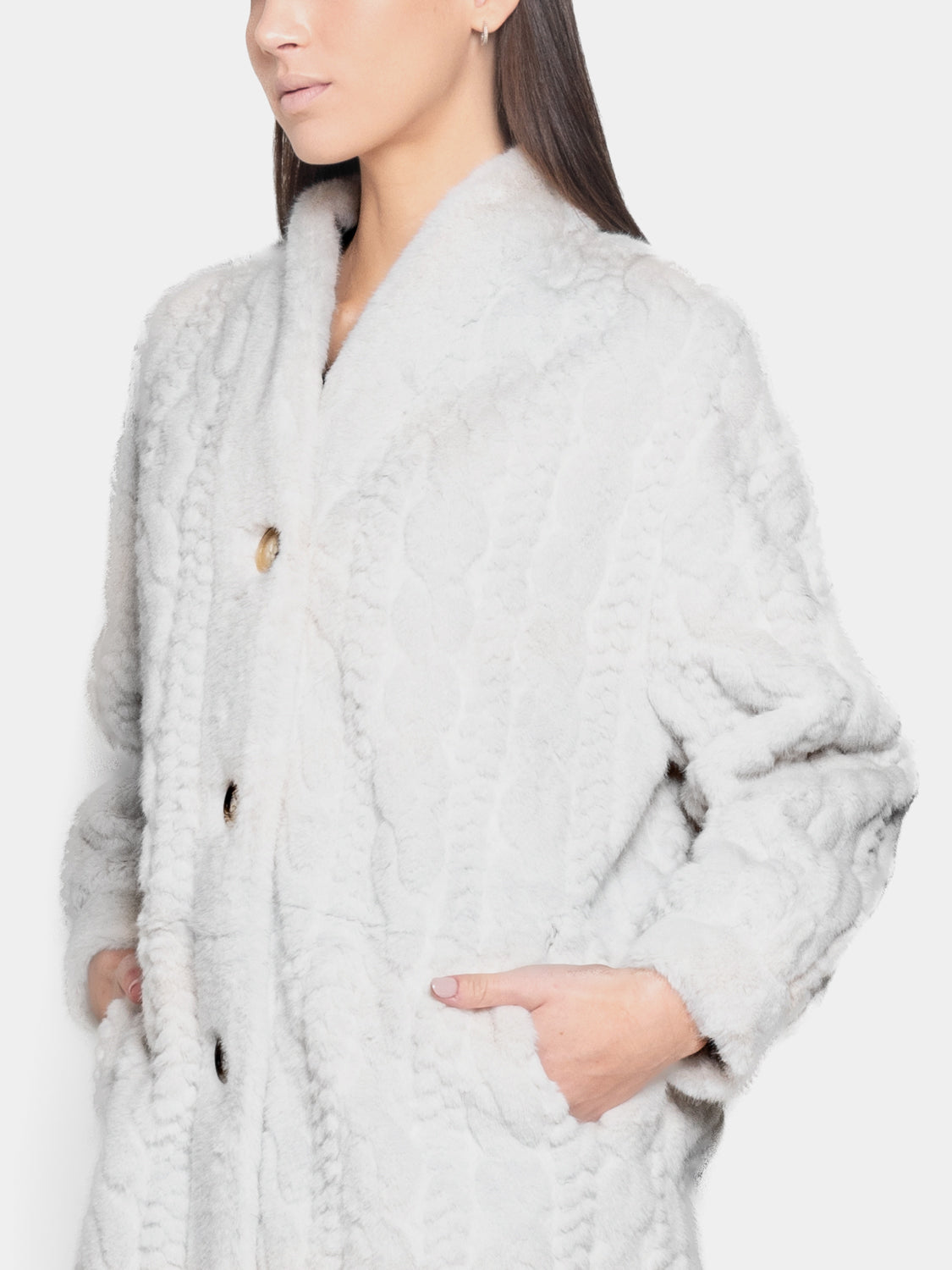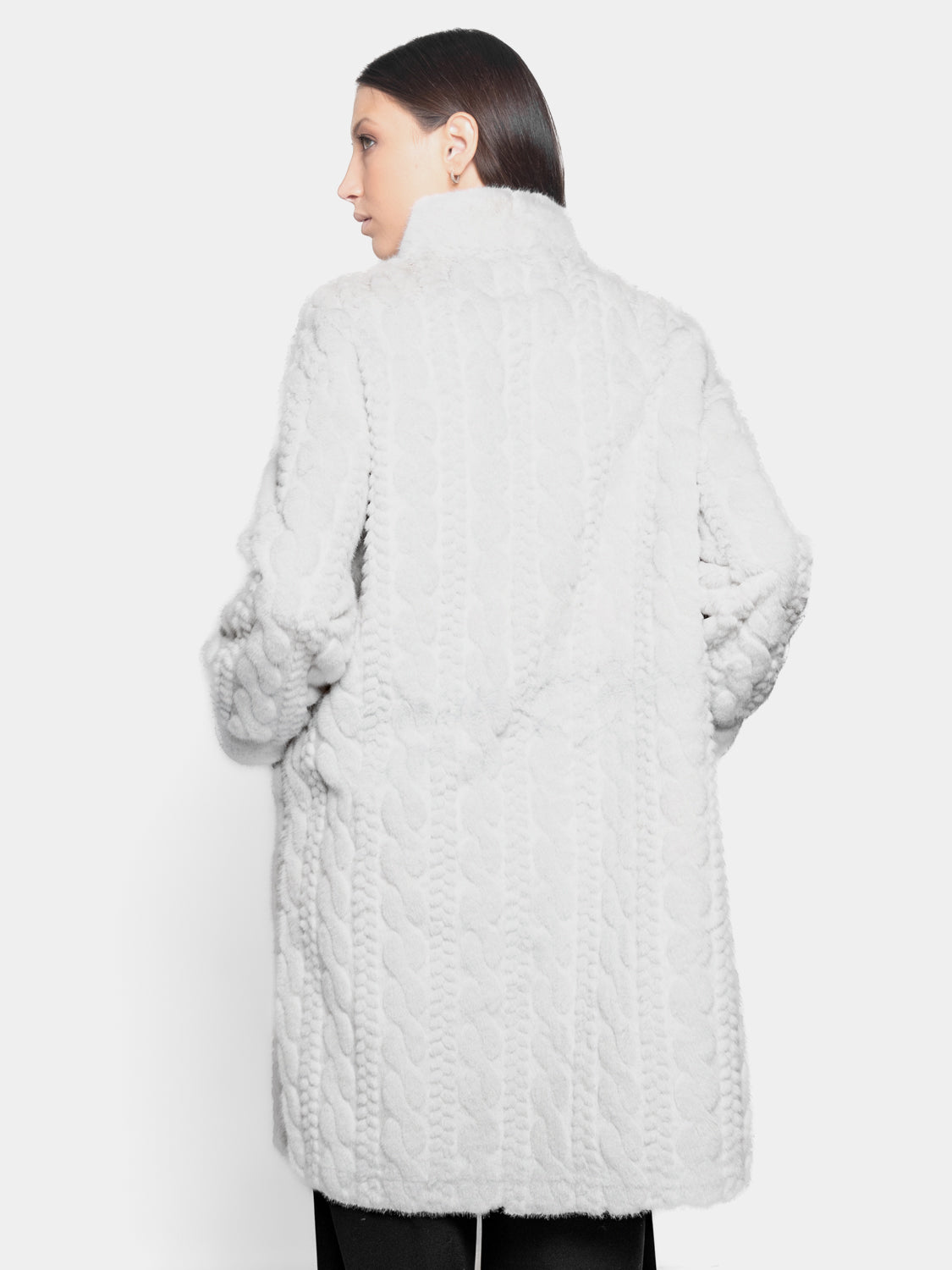Elegance and modernity meet in this refined eco -leather coat, which comes with class to the length of the knee. The relief motifs give the fabric a unique and three -dimensional charm, while the central buttons with luxurious finish create a perfect contrast with the essential design. The cutting with V -neck enhances the figure and adds a touch of femininity, completed by the retractable pockets that maintain a clean and sophisticated line. This coat is ideal for those looking for a versatile and at the same time sought after Outerwear.