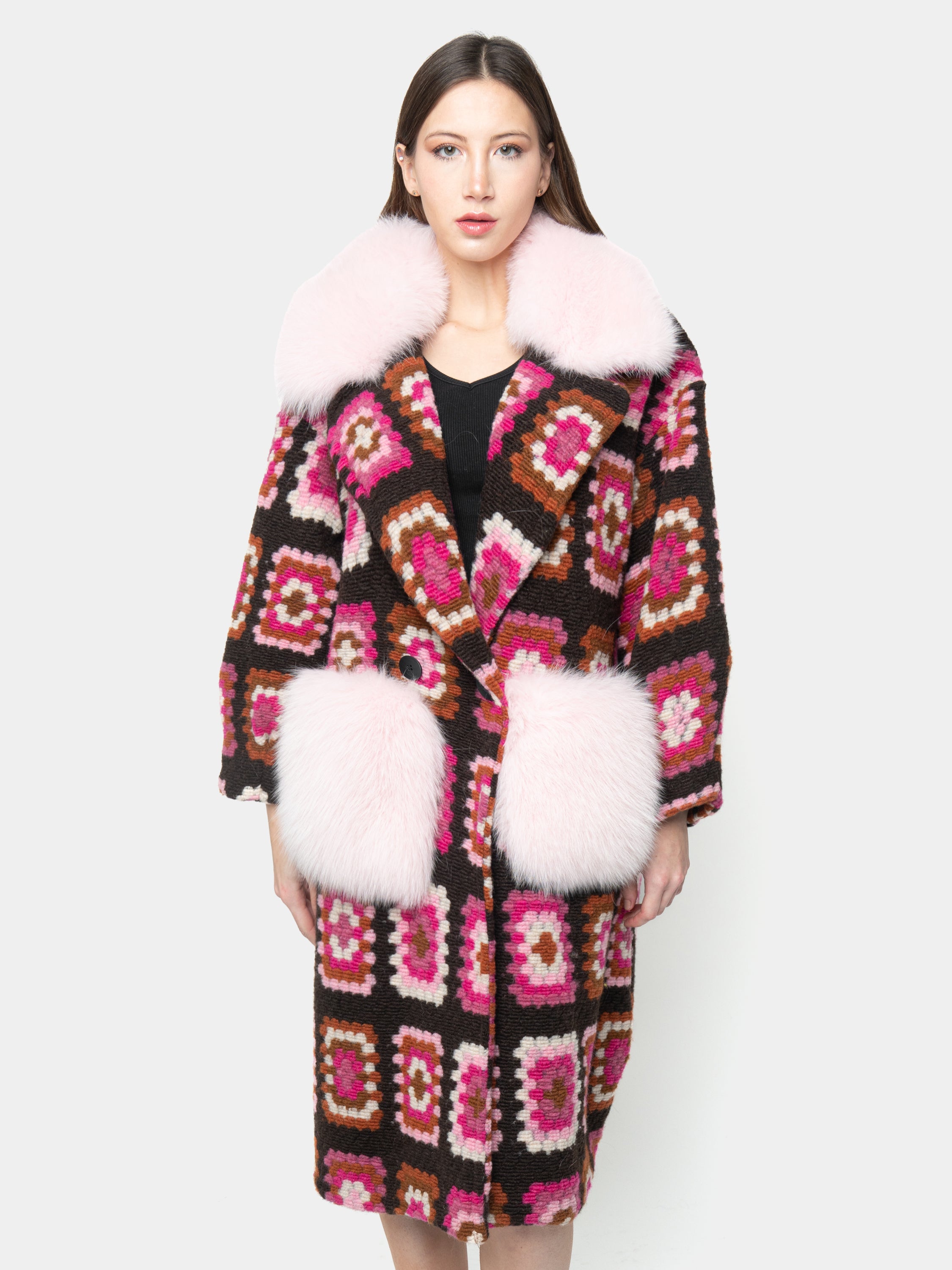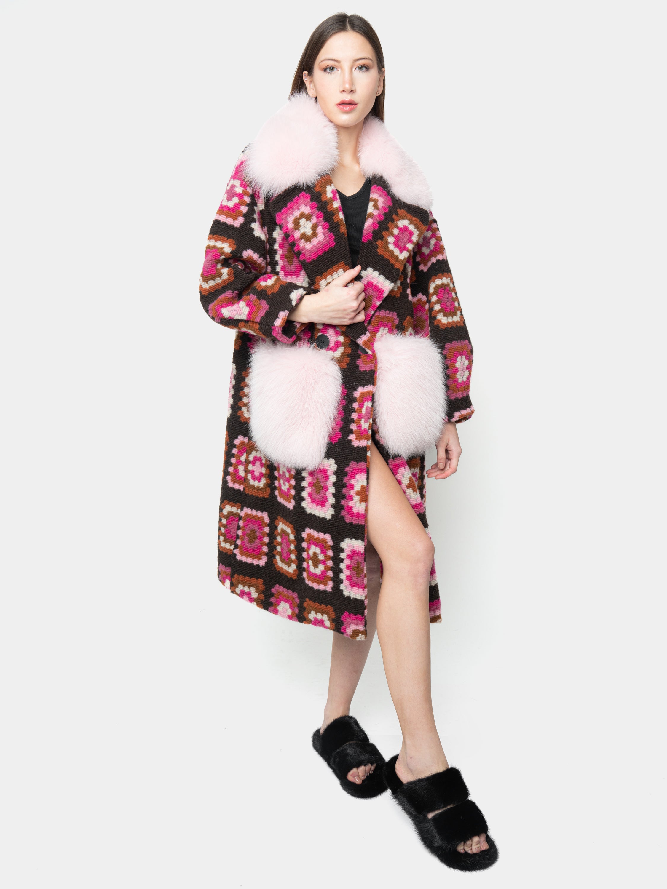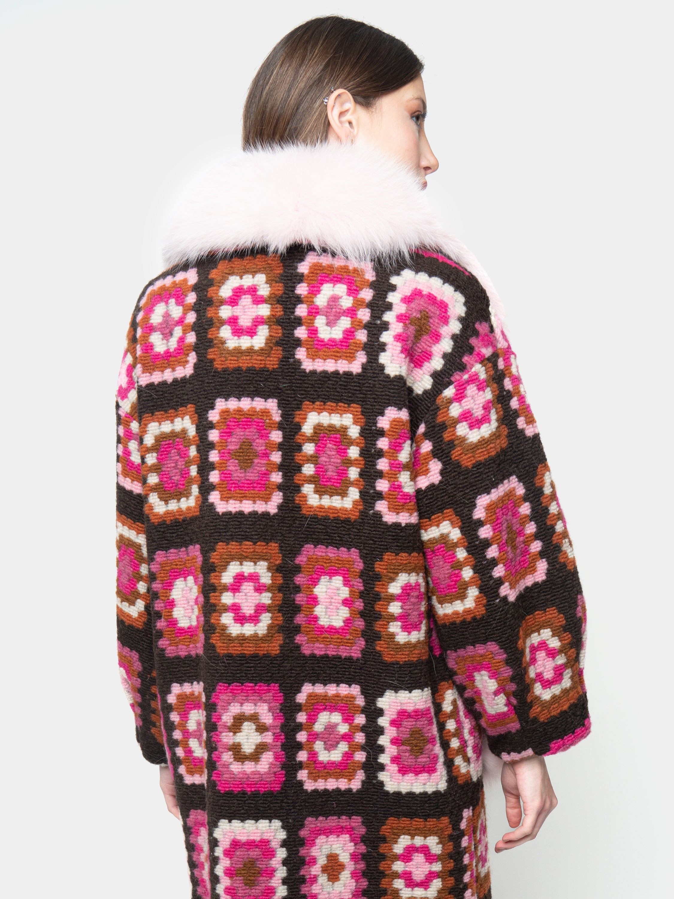 Stockholm Crochet - Coat with pockets and fox neck bordering (fuchsia/brown)