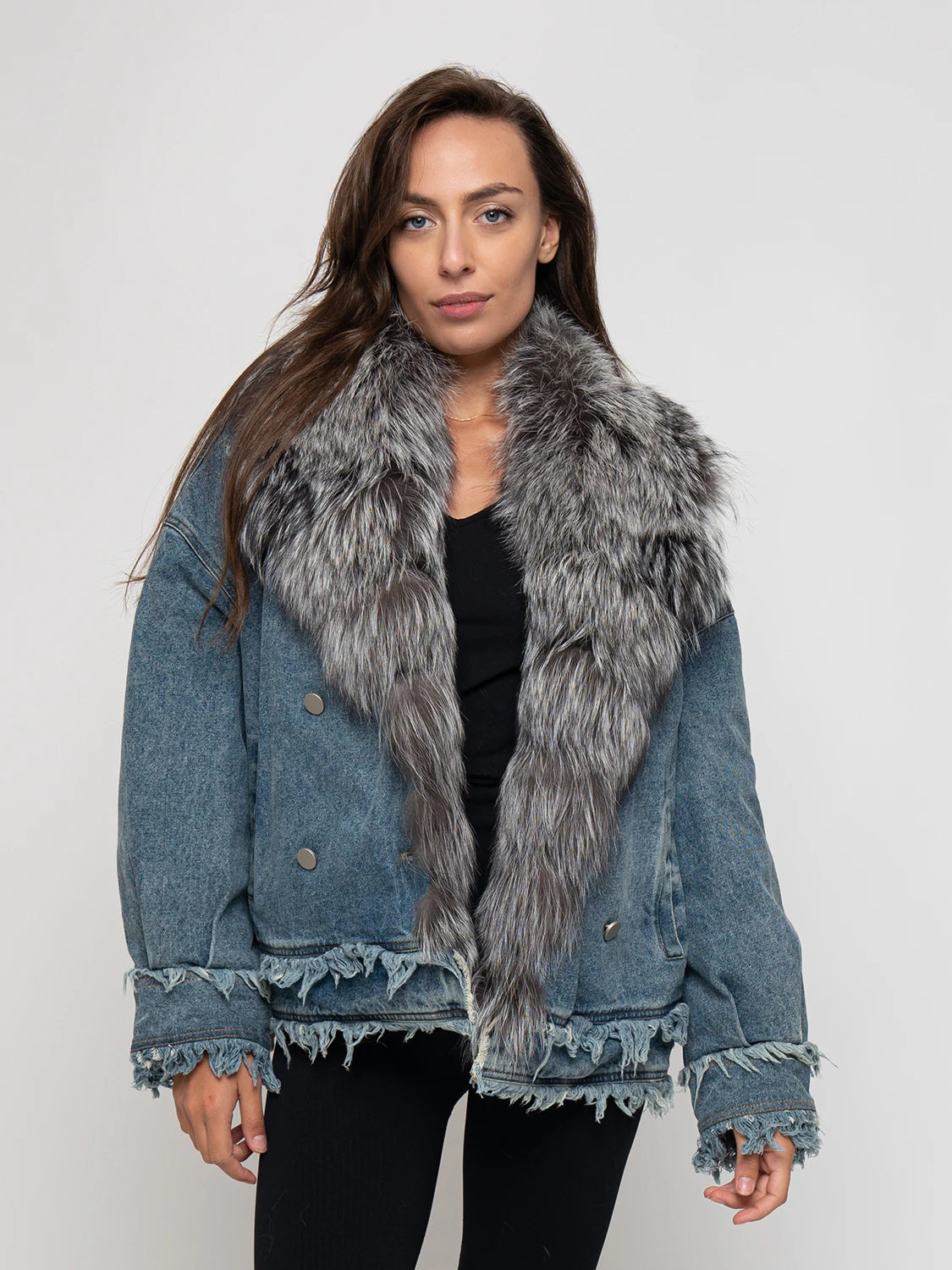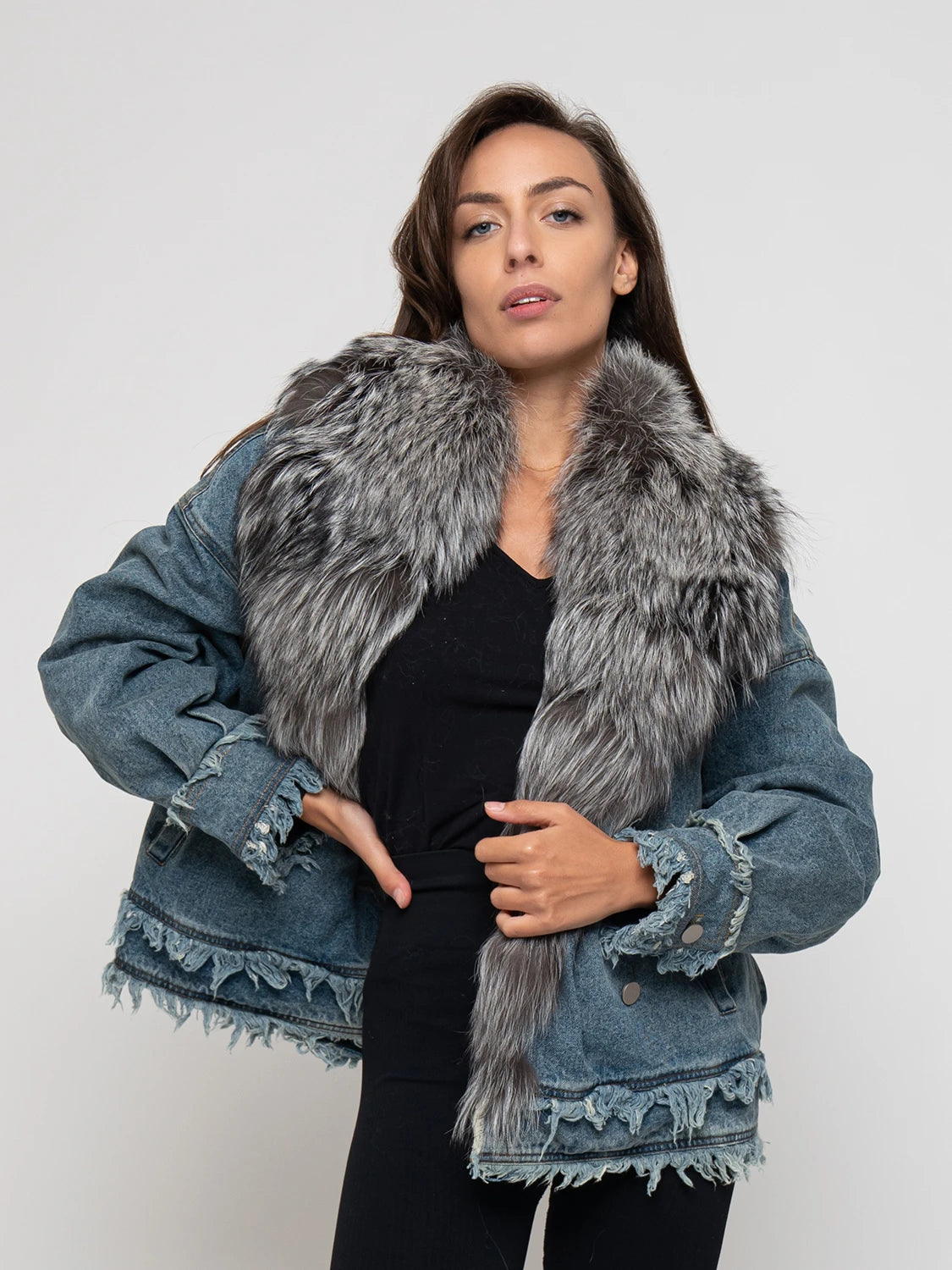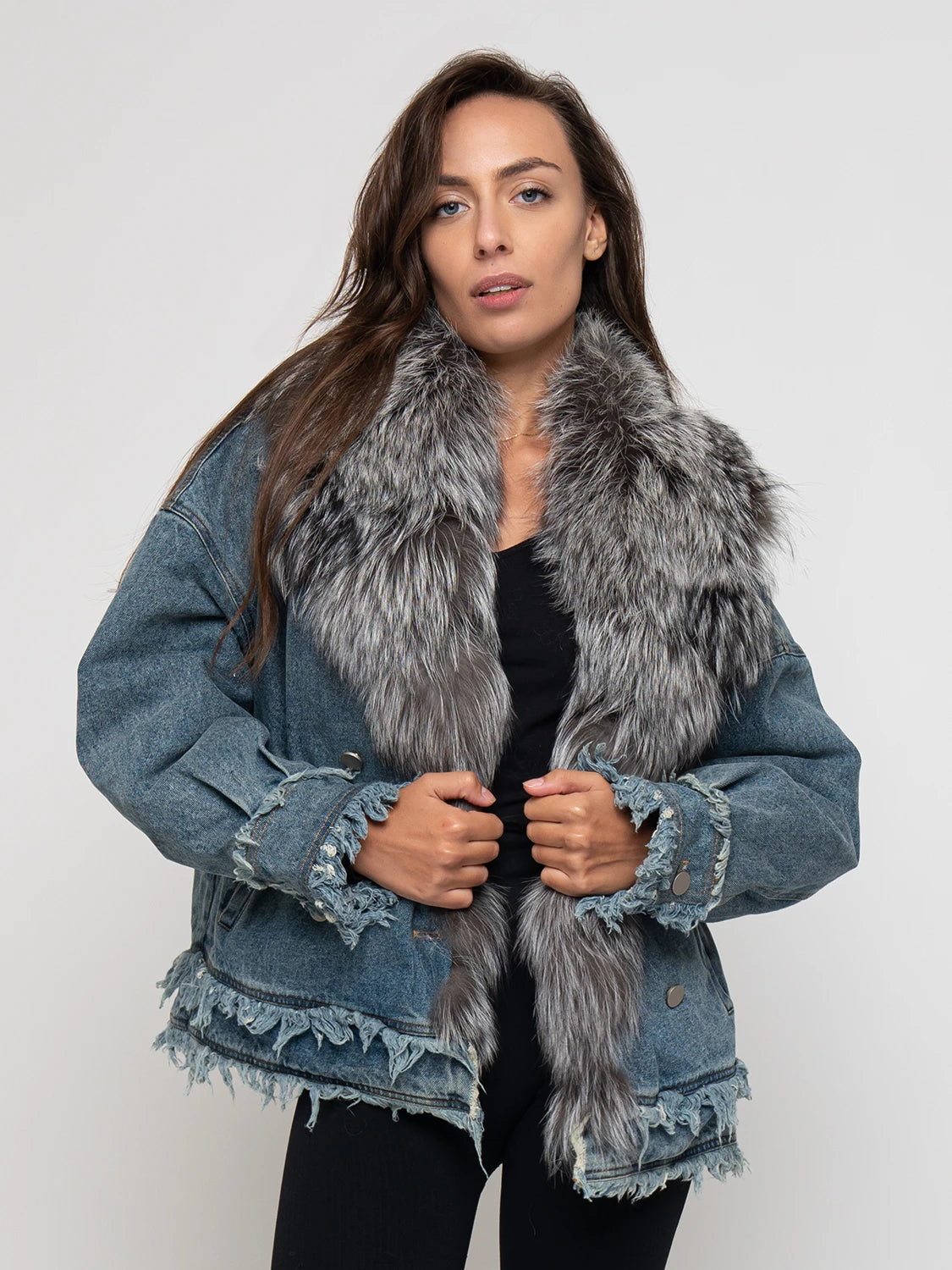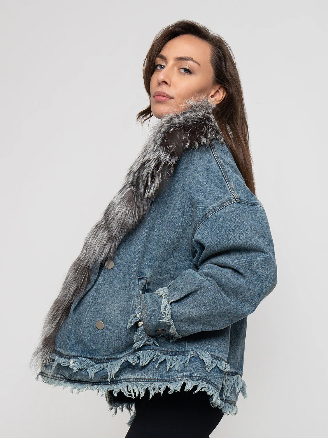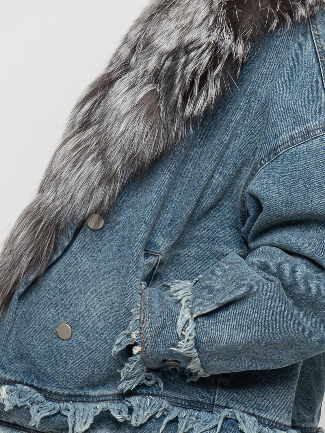 Hot denim jacket, entirely lined and padded. Bordered by fox fur, available in several colors.