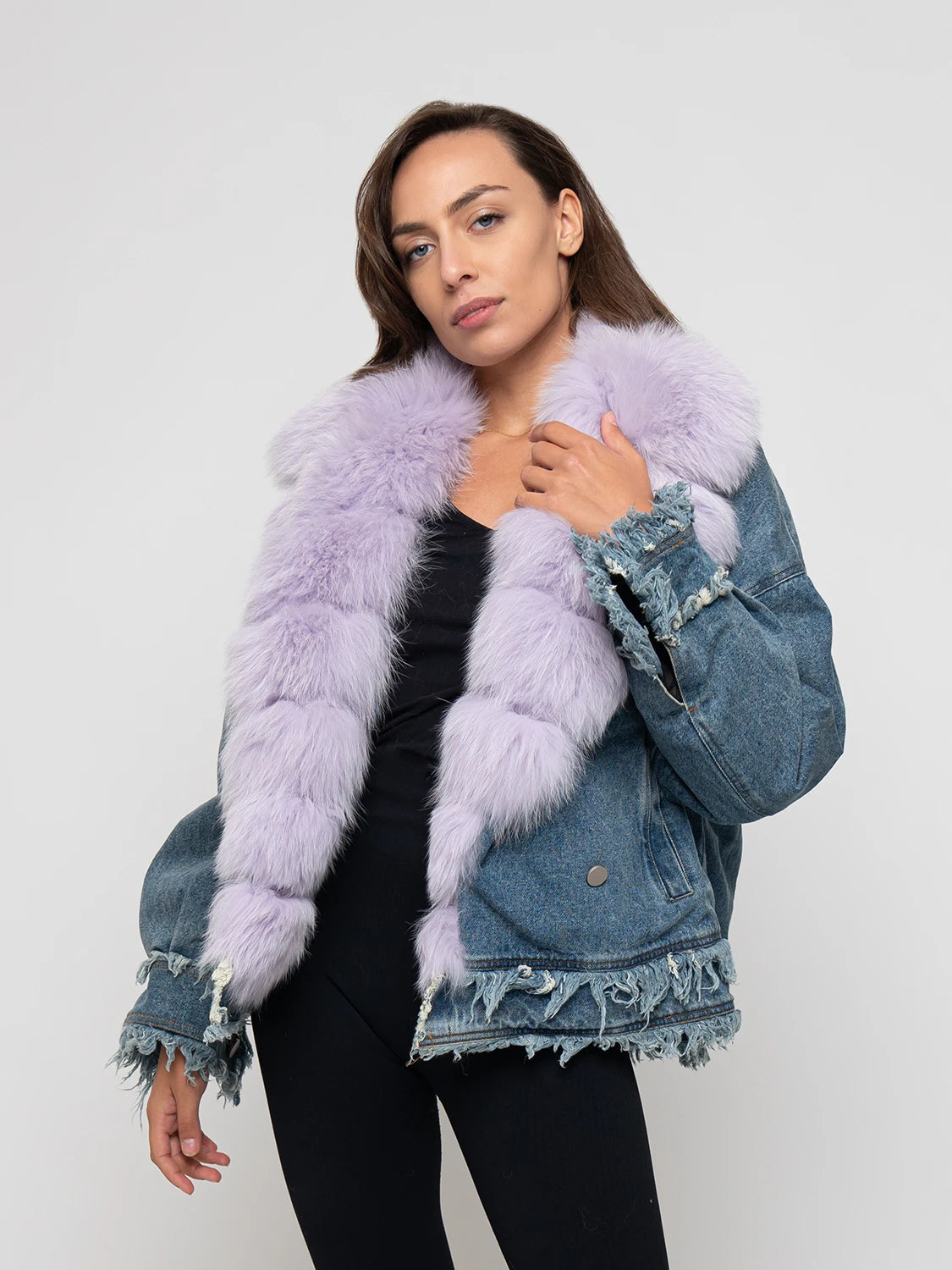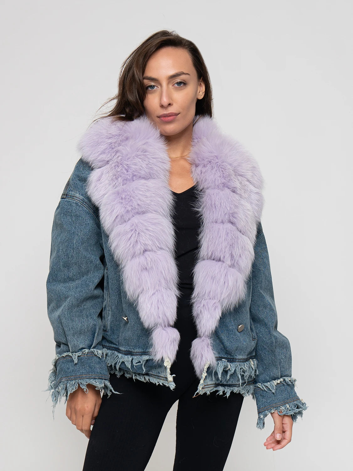 Hot denim jacket, entirely lined and padded. Borded by fox fur, available in several colors