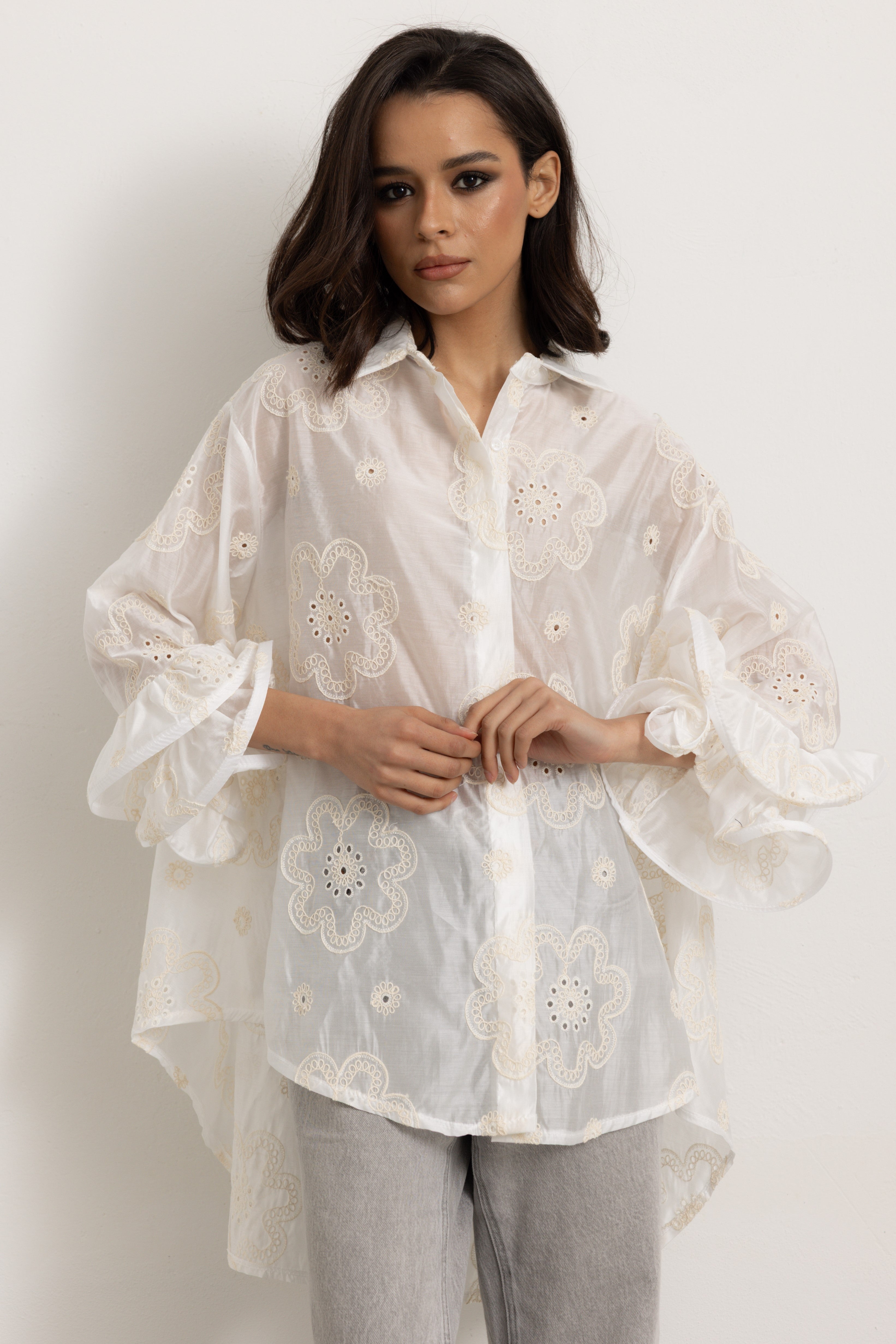 • Maniche Volant: le maniche volant di questa camicia sono una celebrazione della femminilità. Realizzate con una cura minuziosa, presentano morbide onde di tessuto che cadono leggermente sopra il gomito, creando un movimento fluido e romantico. Le pieghe sono sapientemente progettate per dare volume senza appesantire la silhouette, aggiungendo un tocco di drammaticità sofisticata ad ogni gesto.