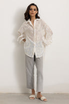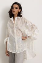 La Camicia con Maniche Volant è un capolavoro sartoriale, pensata per la donna moderna che desidera un tocco di eleganza e freschezza nel suo guardaroba. Questa camicia è l'essenza del lusso discreto e della raffinatezza, un pezzo unico che non passa inosservato.