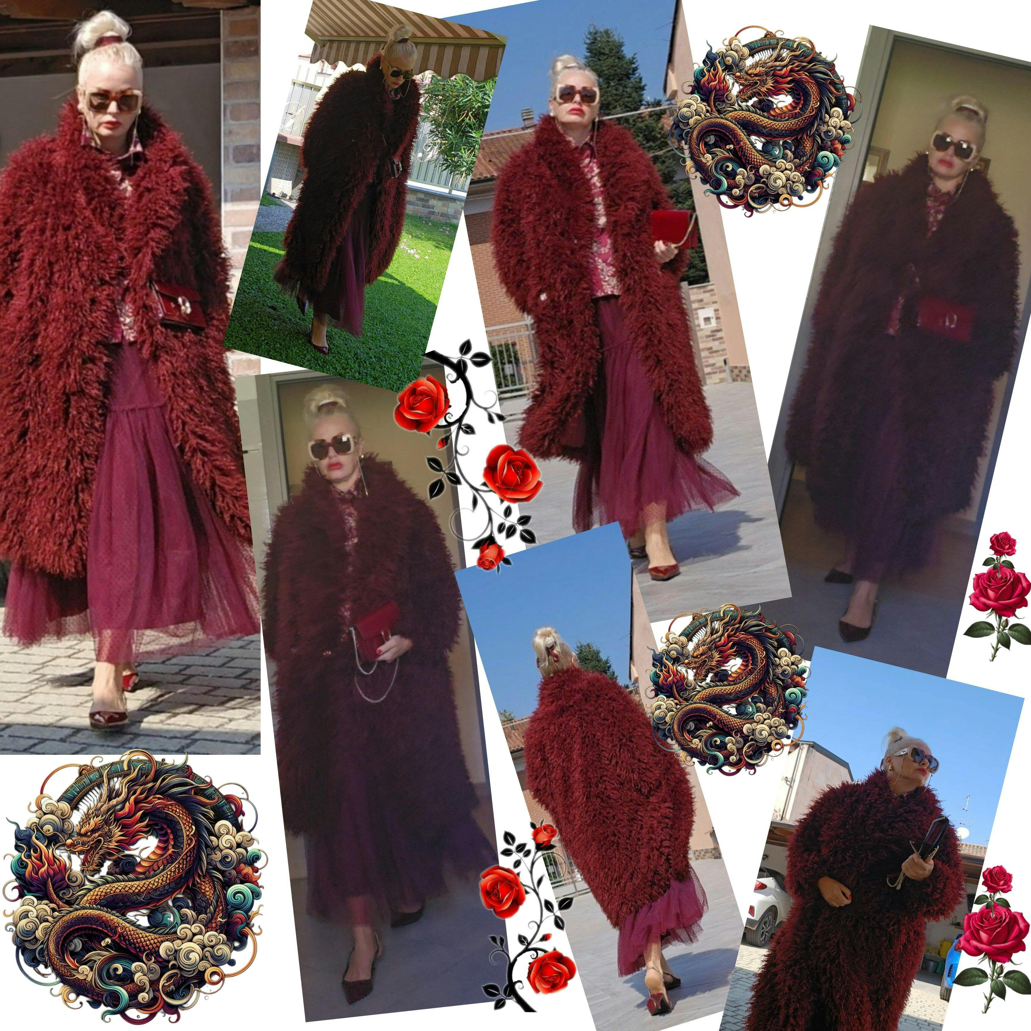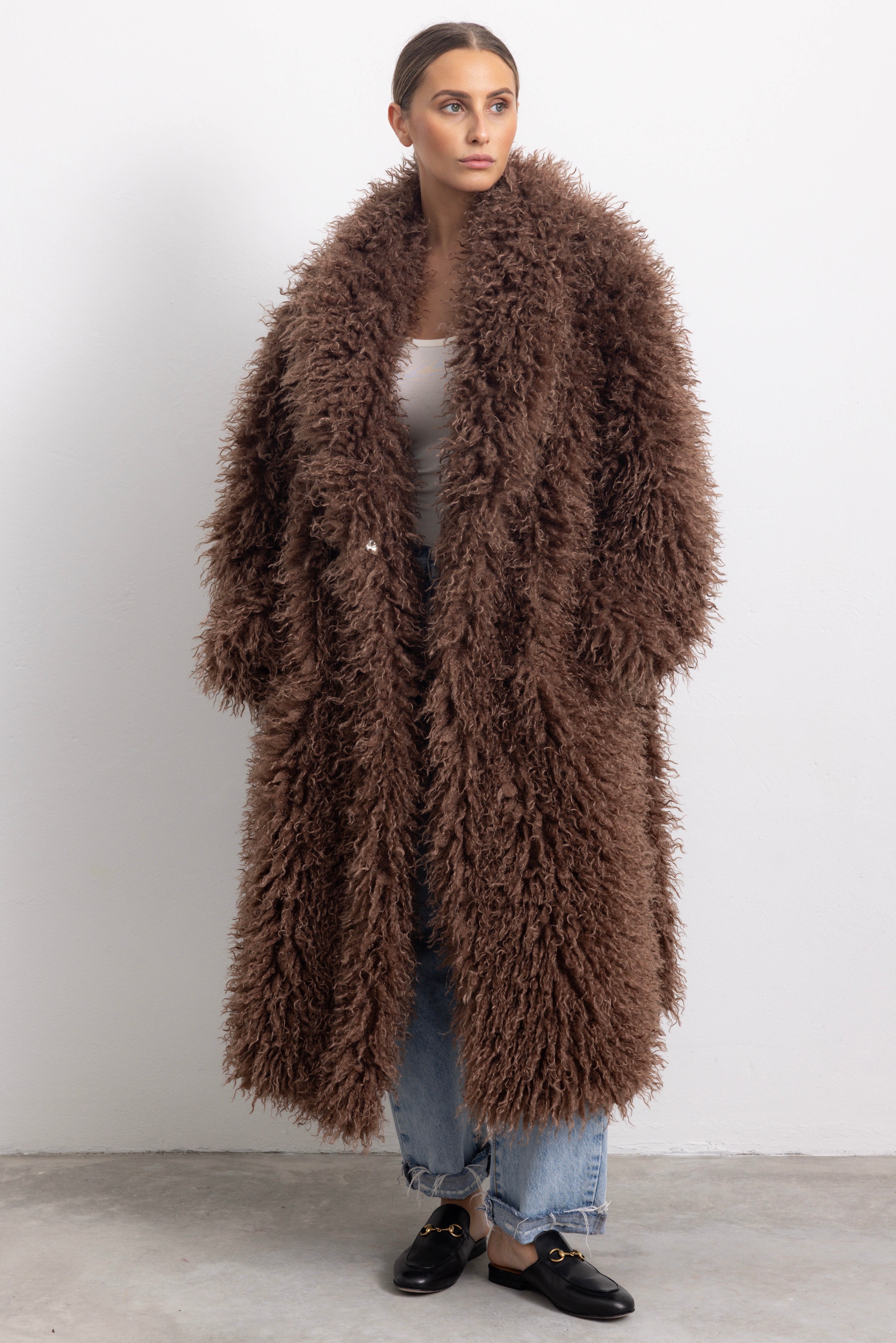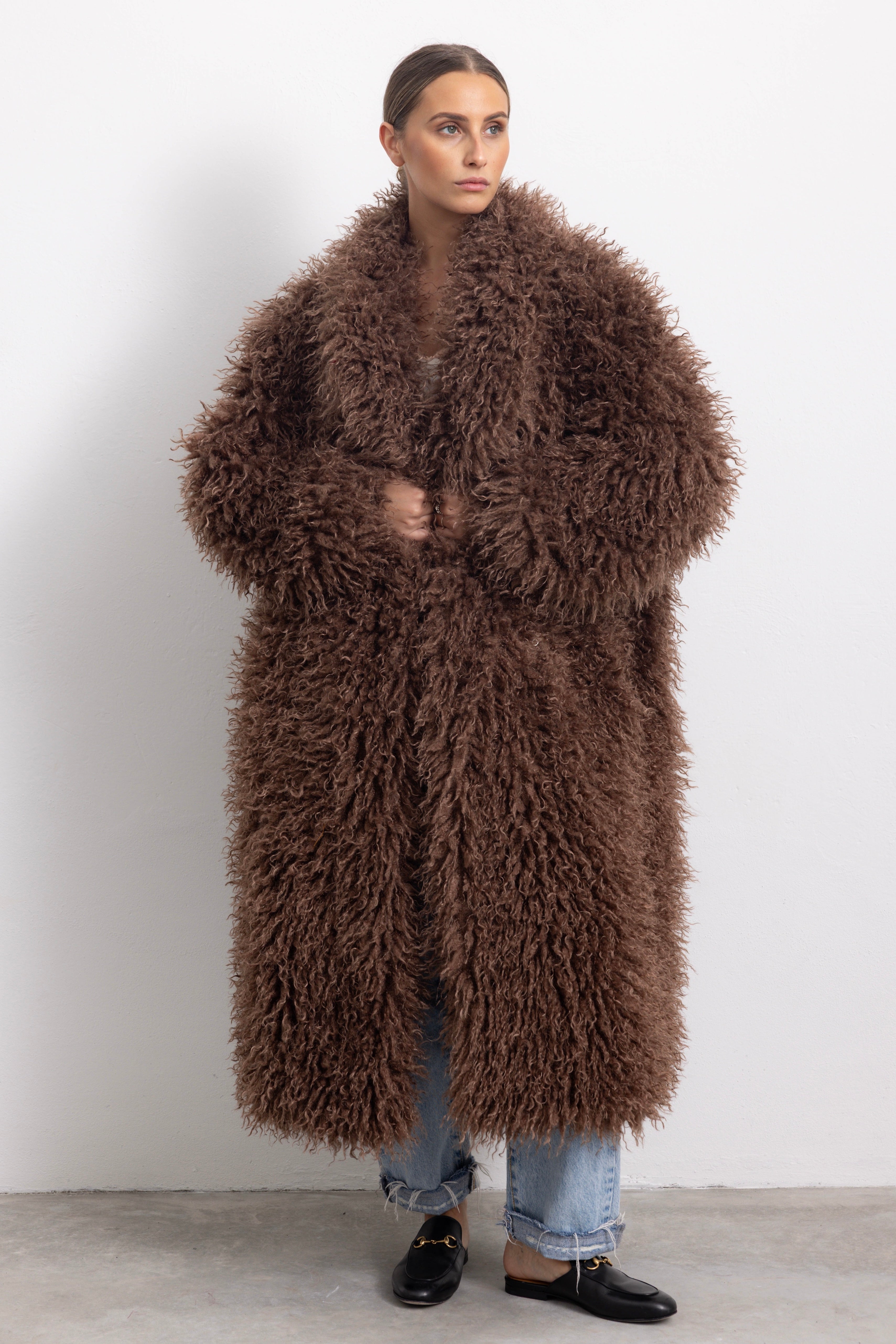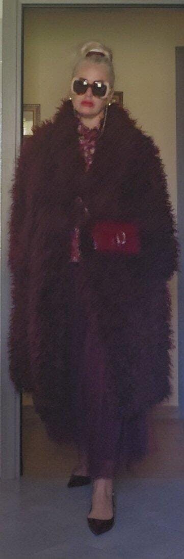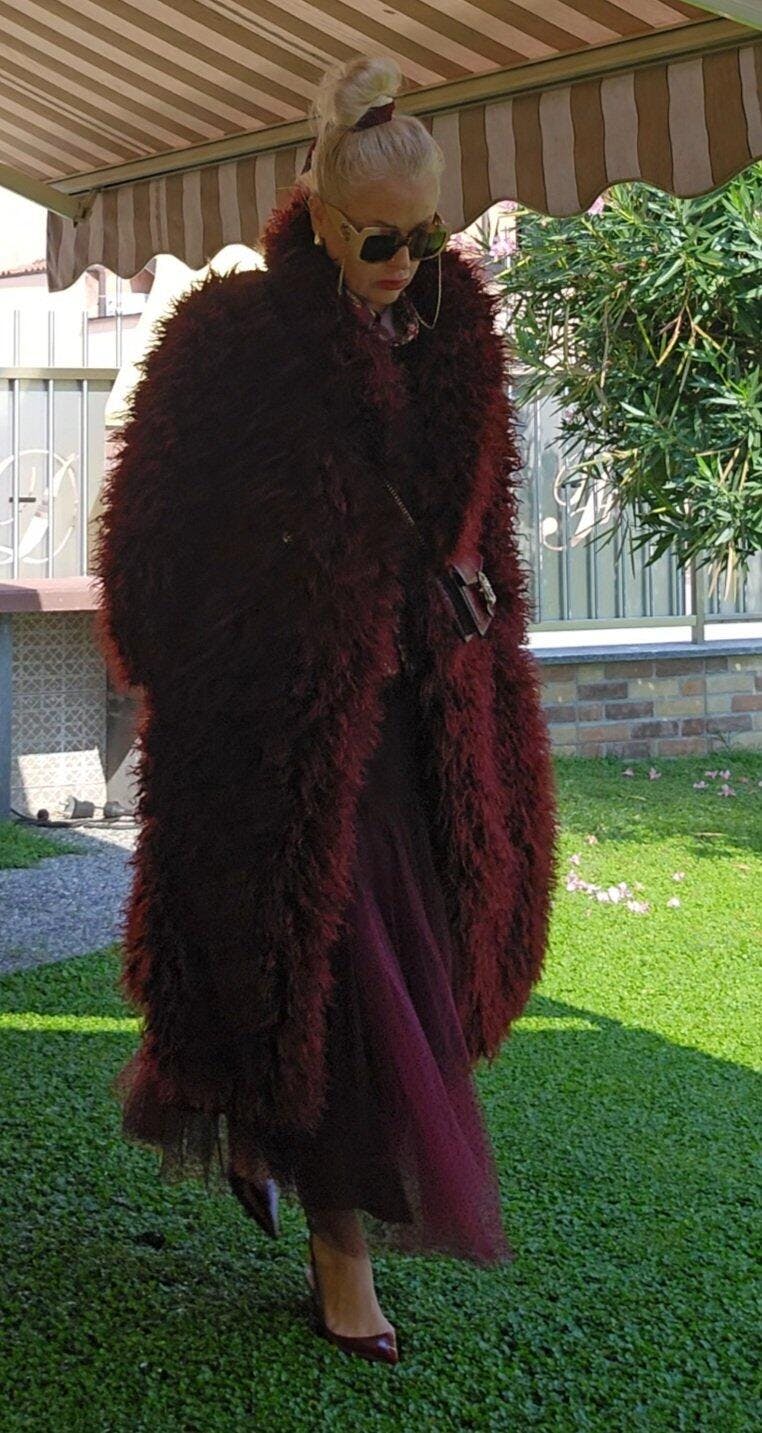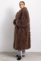 Cappotto lungo oversize in folta ecopelliccia con collo reverse e manica ampia.