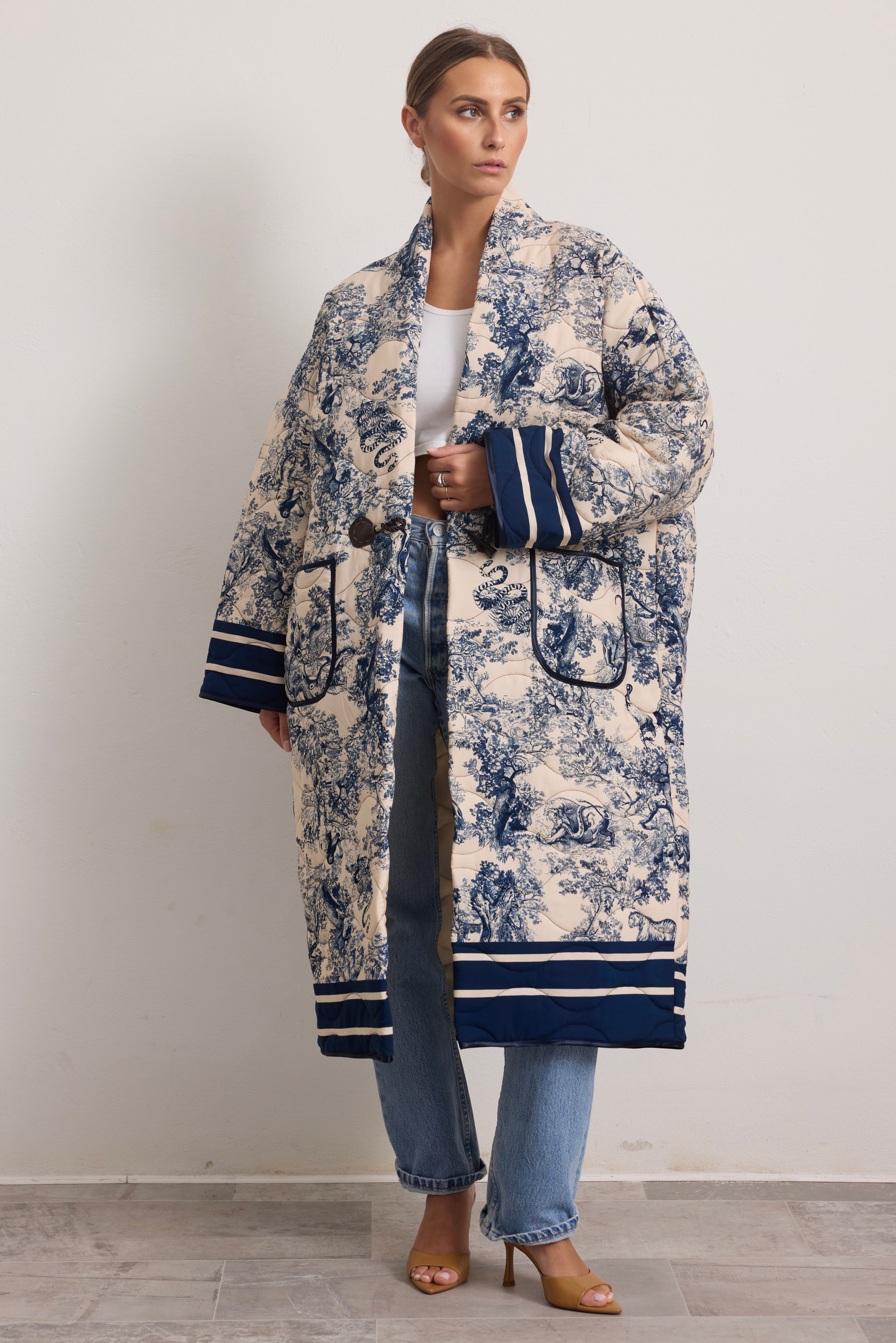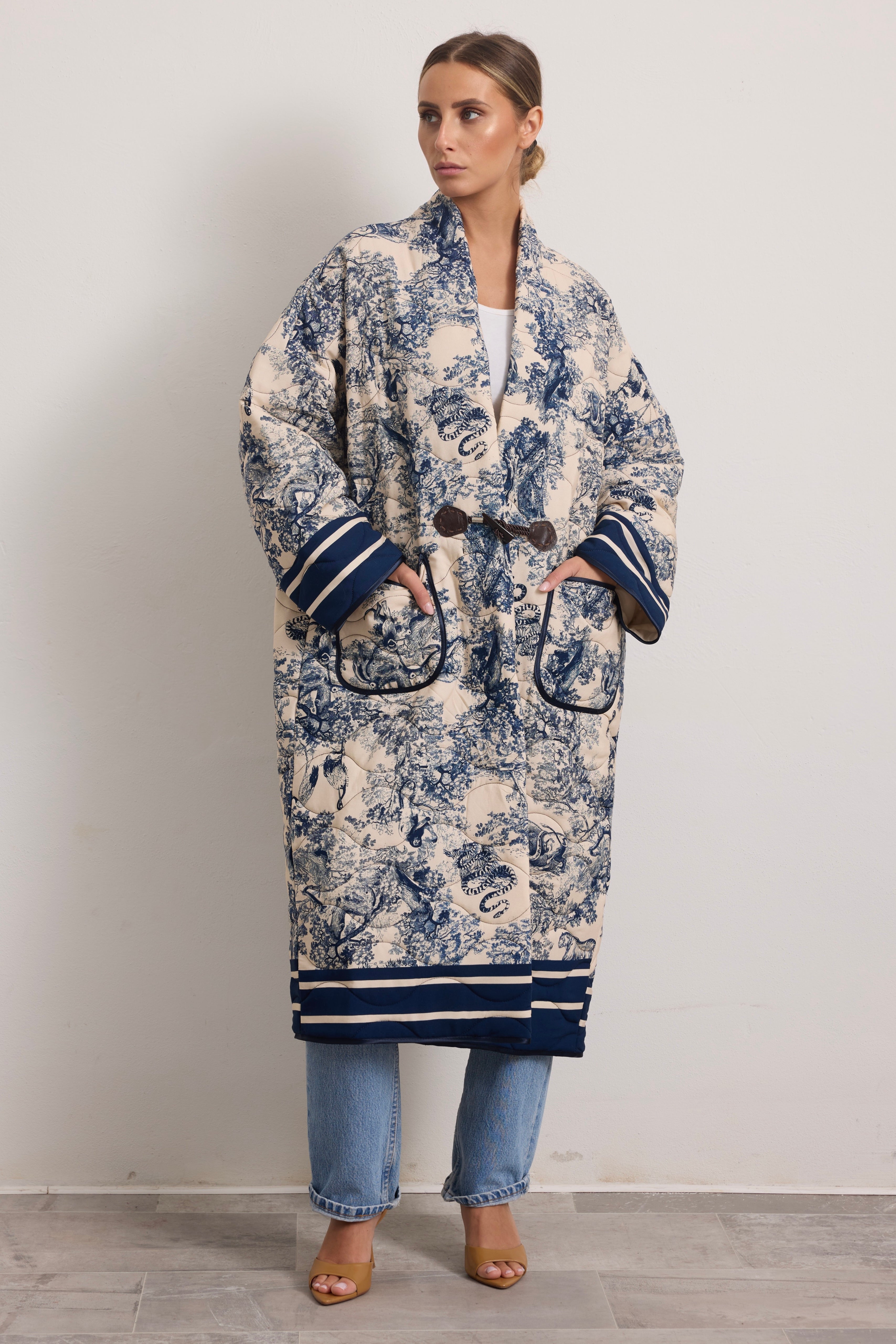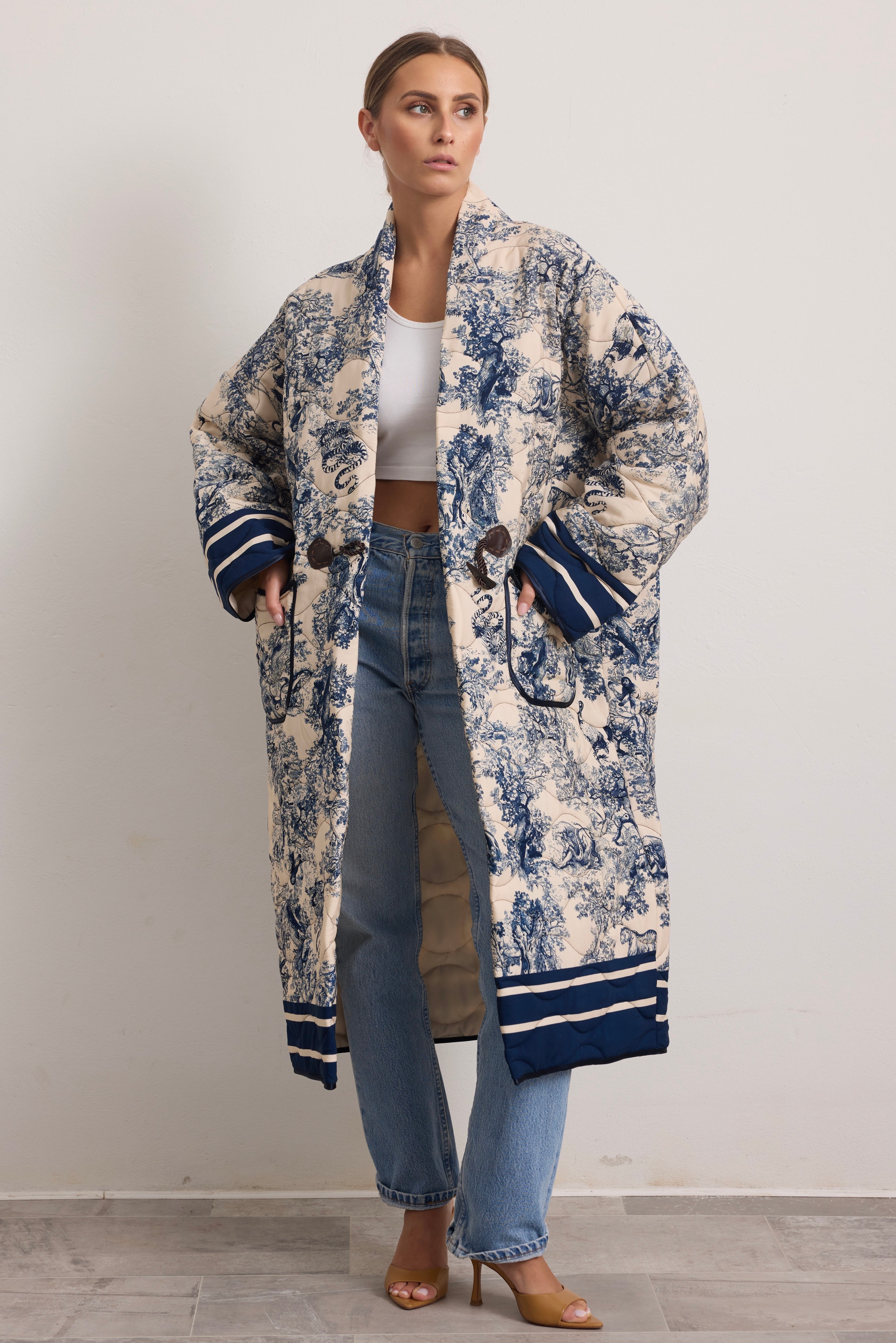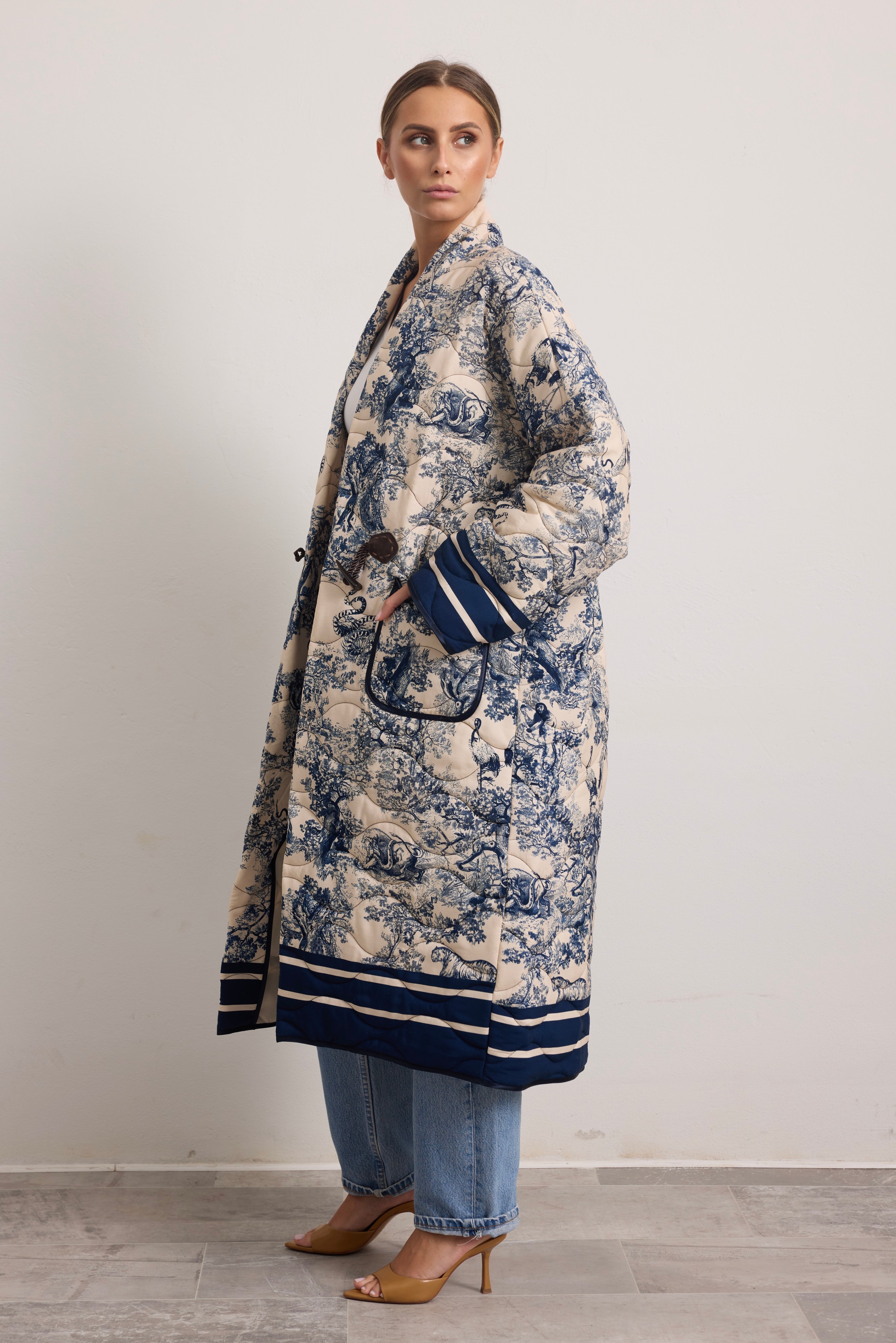 Cappottino trapuntato lungo over con tasche frontali e classica chiusura con alamaro centrale.