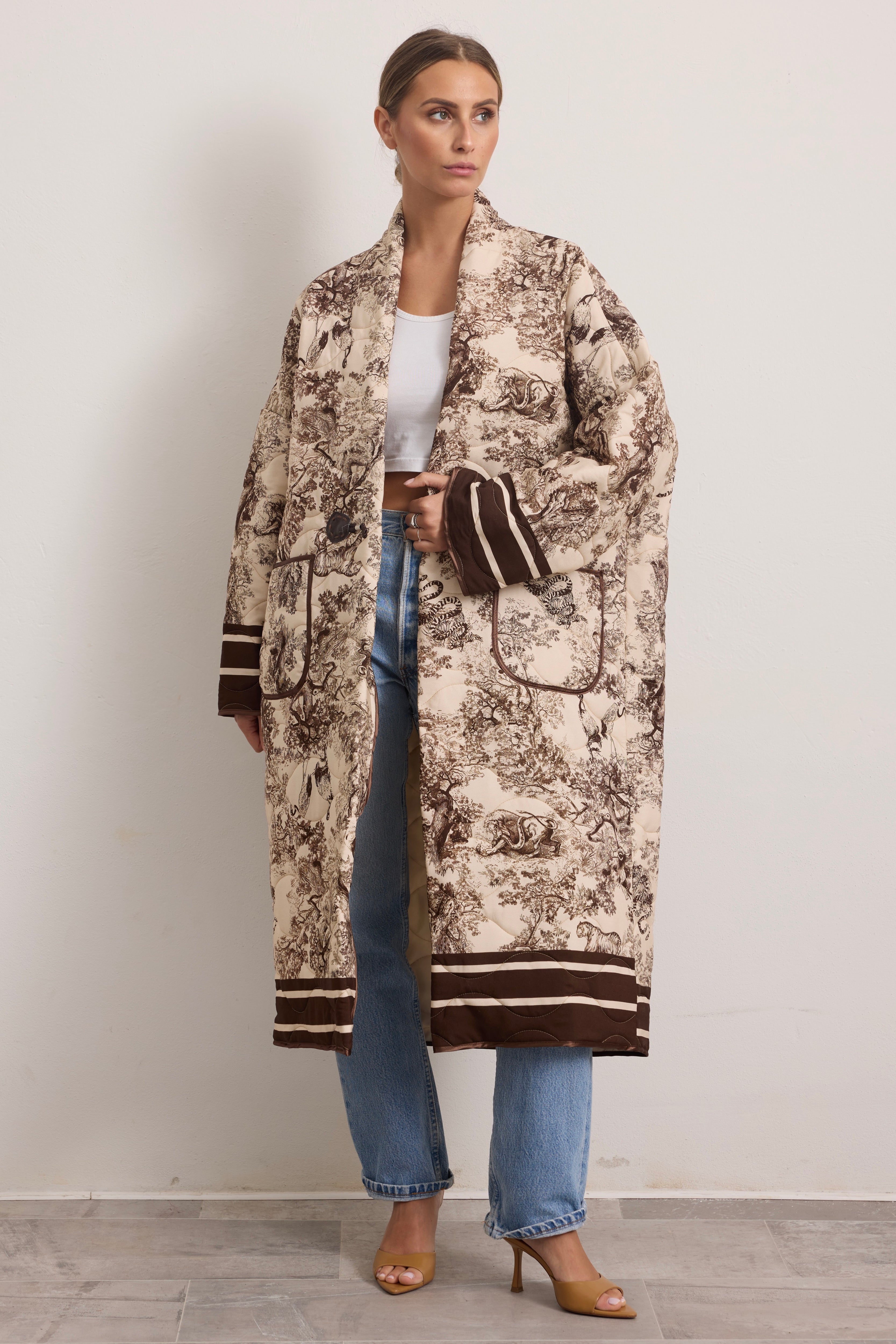 Cappottino trapuntato lungo over con tasche frontali e classica chiusura con alamaro centrale.