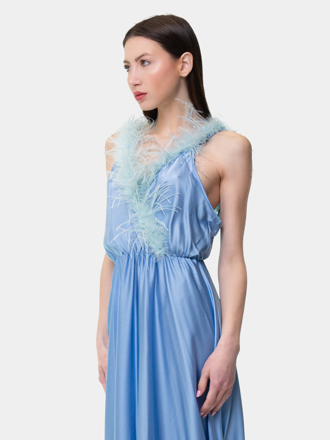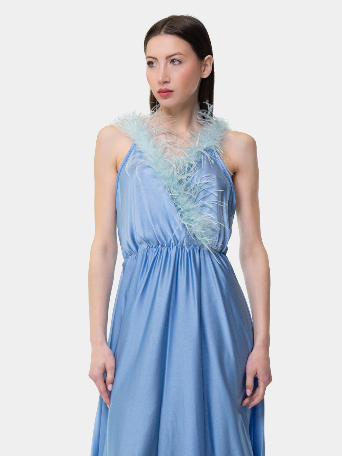 Pietrasanta - Long dress with bordering on a neckline in Marabù (Celeste)