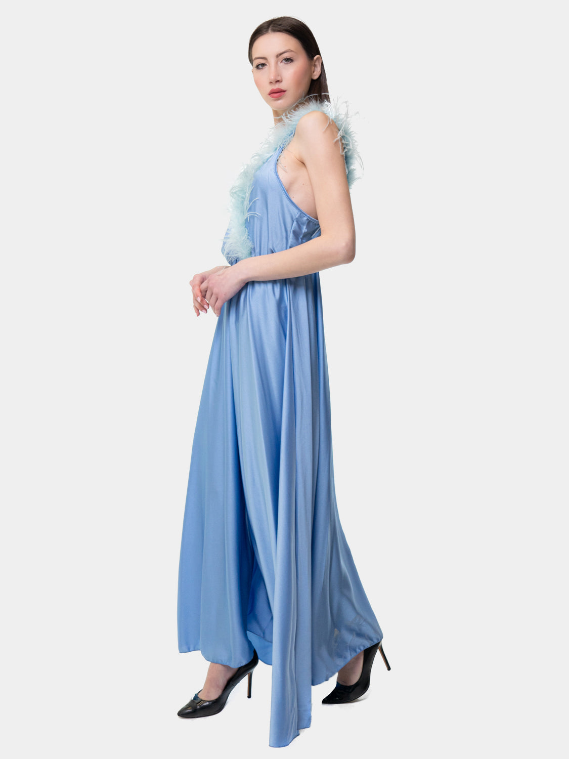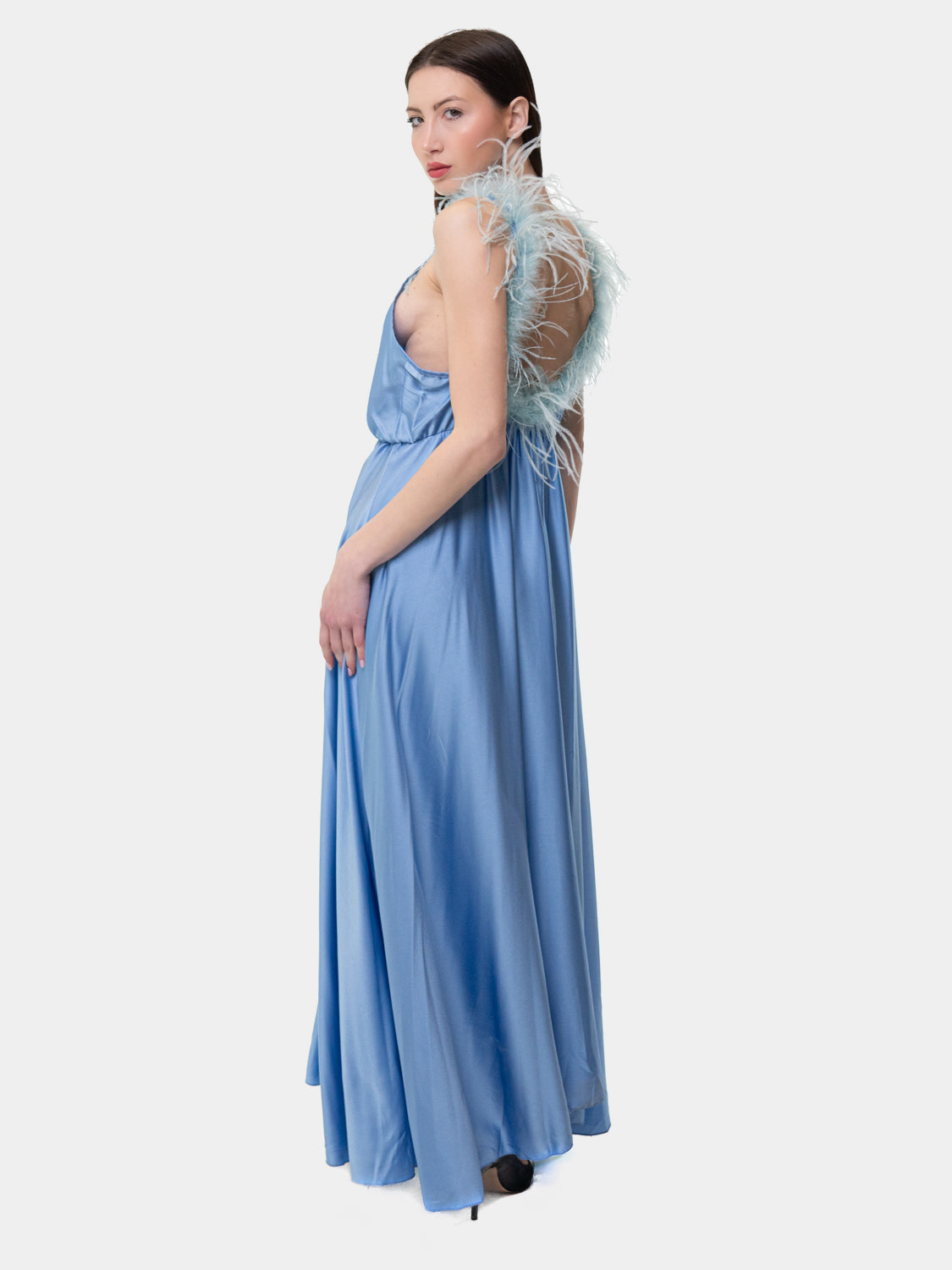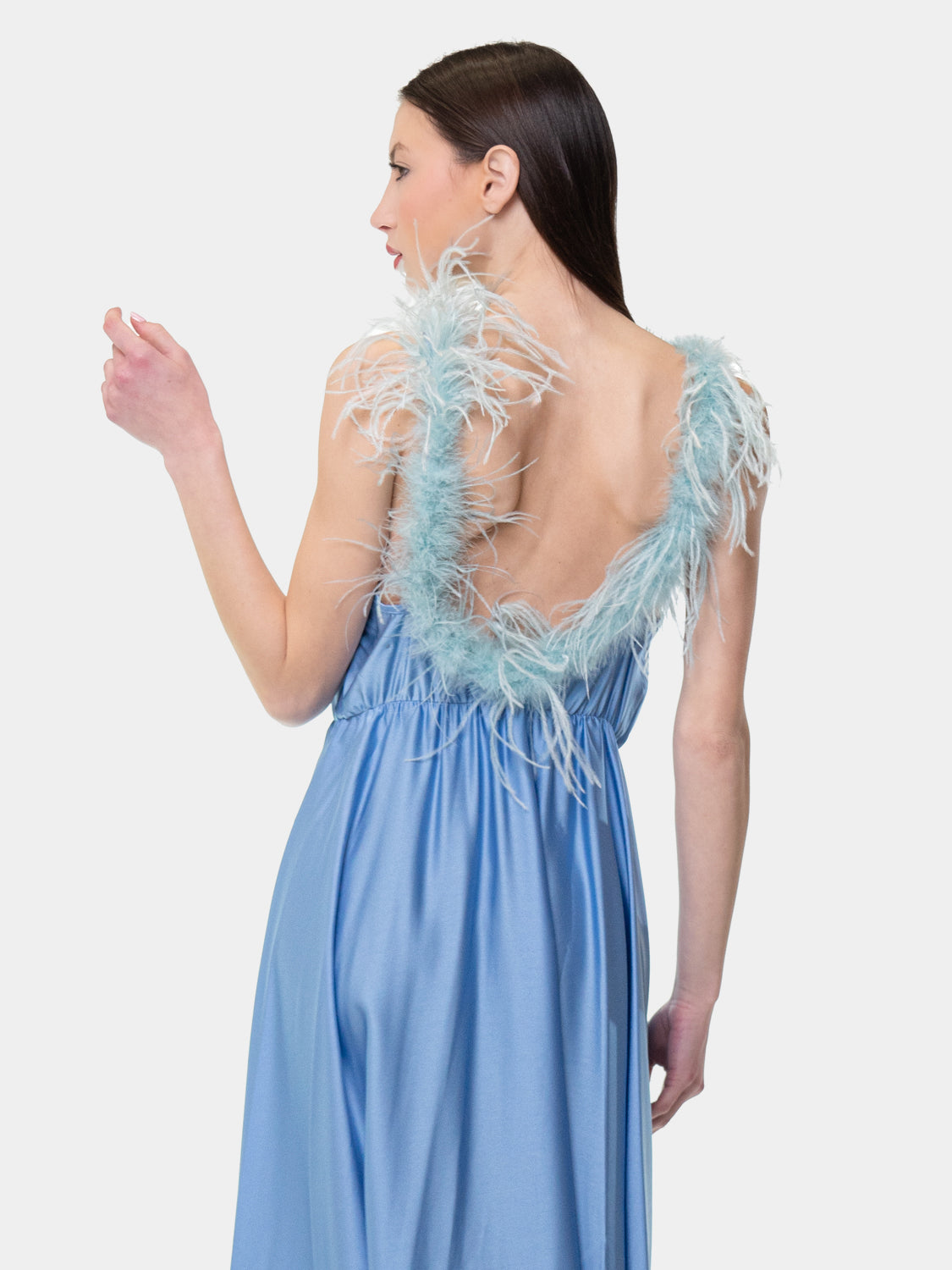 Elisabetta Panerai's extra luxury dress, long and fresh, with disconnects both in front and behind, the back is discovered and every detail is enriched by marabù feathers that follow the upper line of the dress