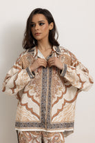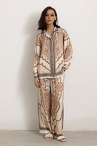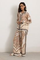 Coordinato fantasia, con pantalone a palazzo e camicia.