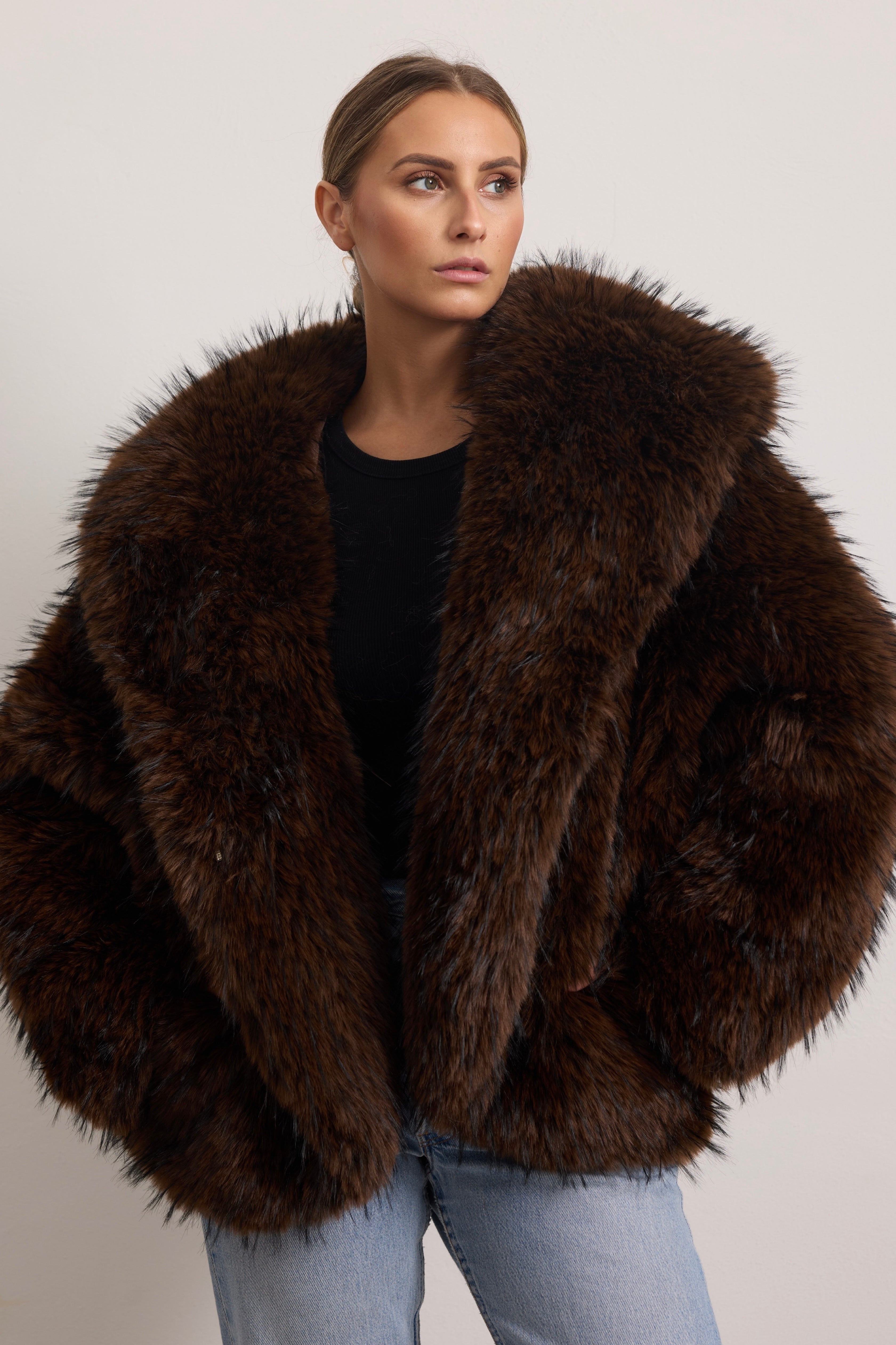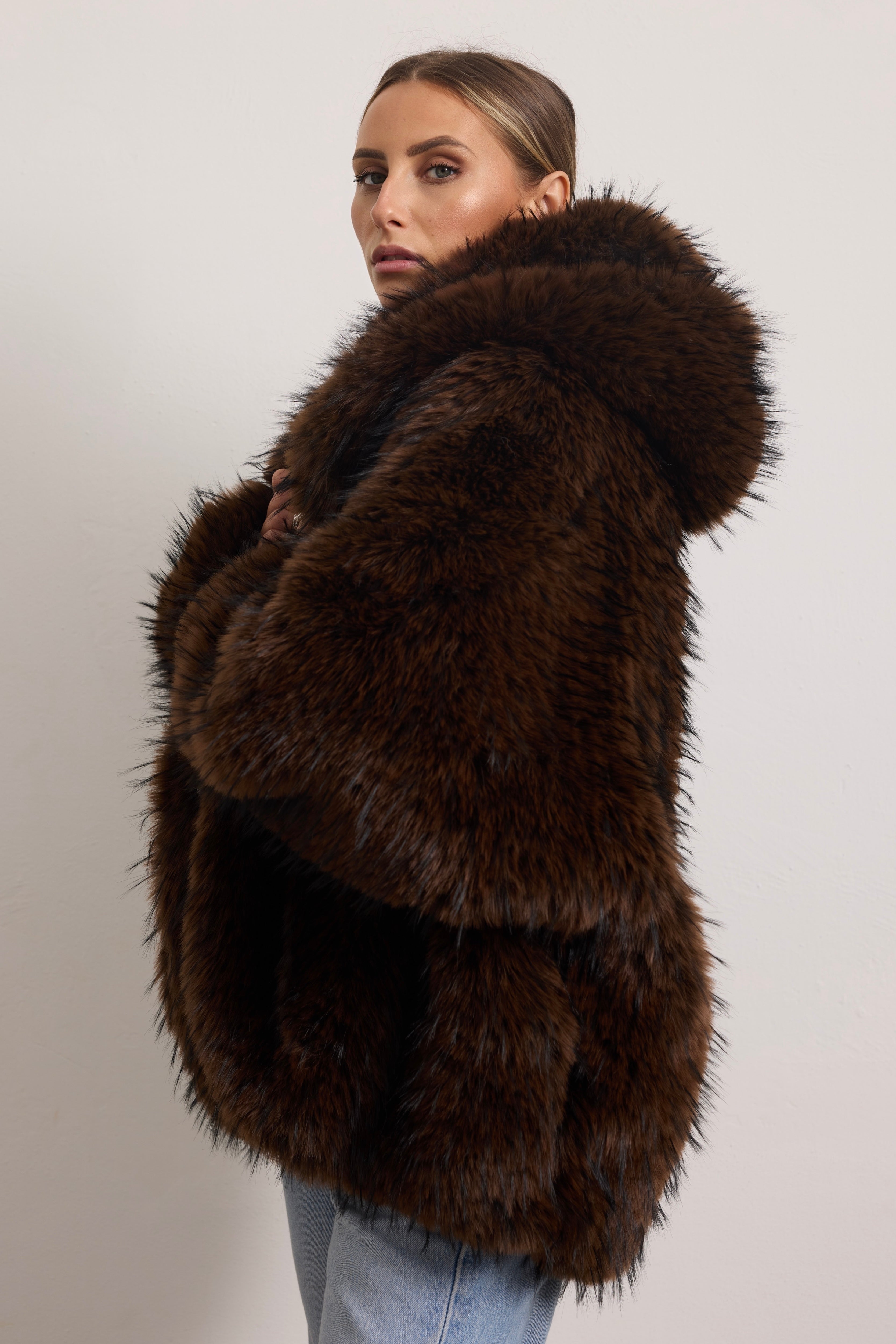 Giacca oversize in folta e morbida ecopelliccia con cappuccio e manica ampia.