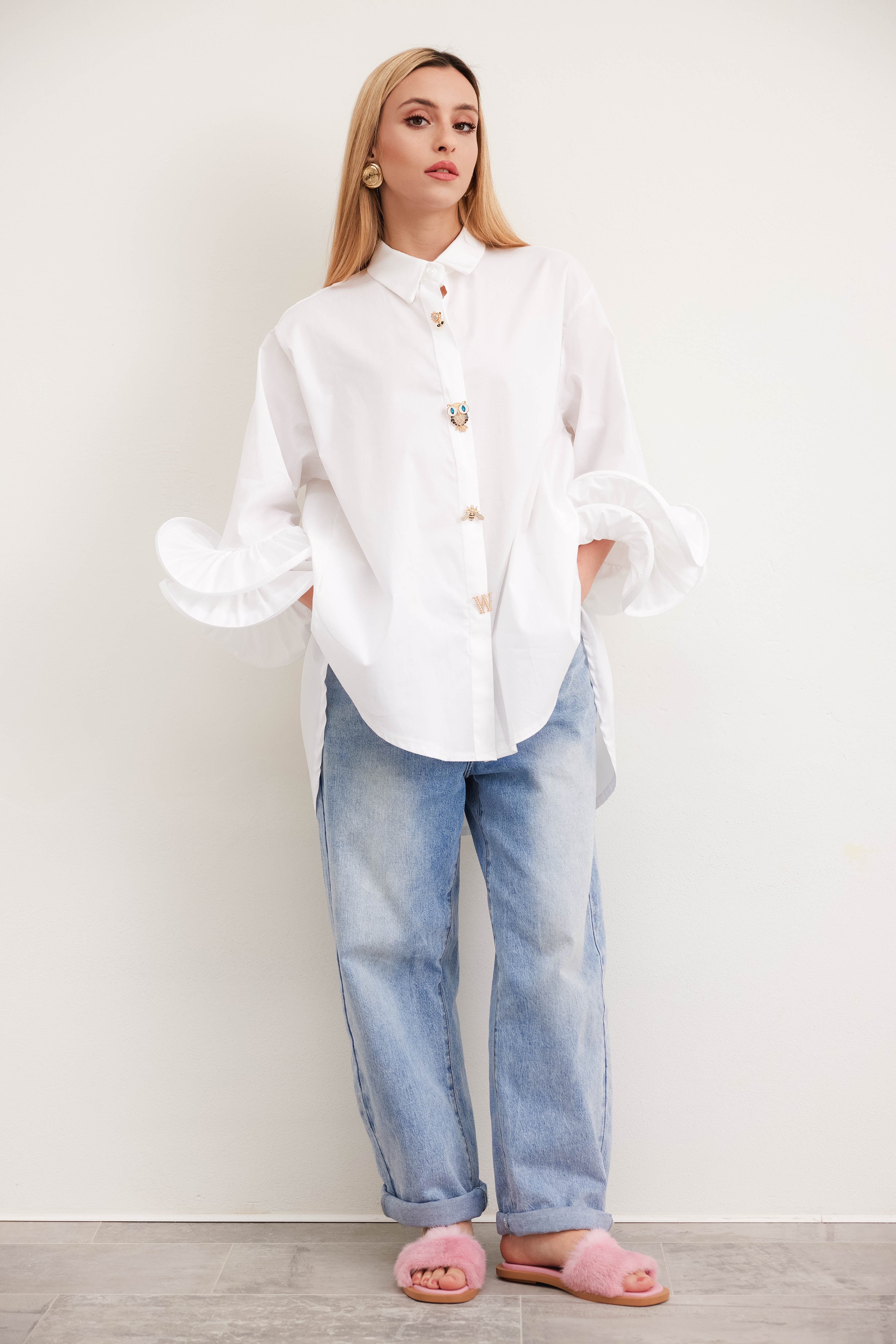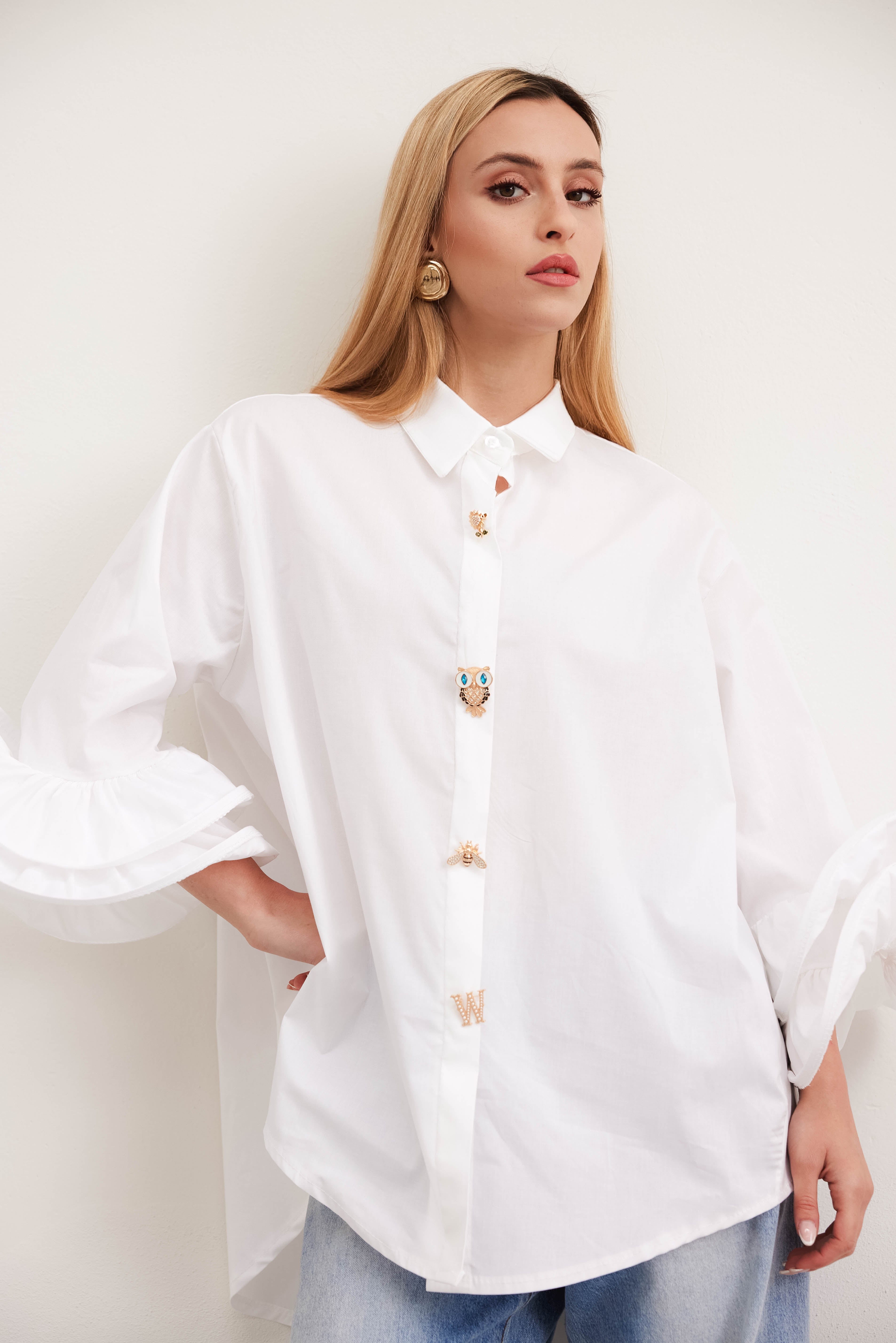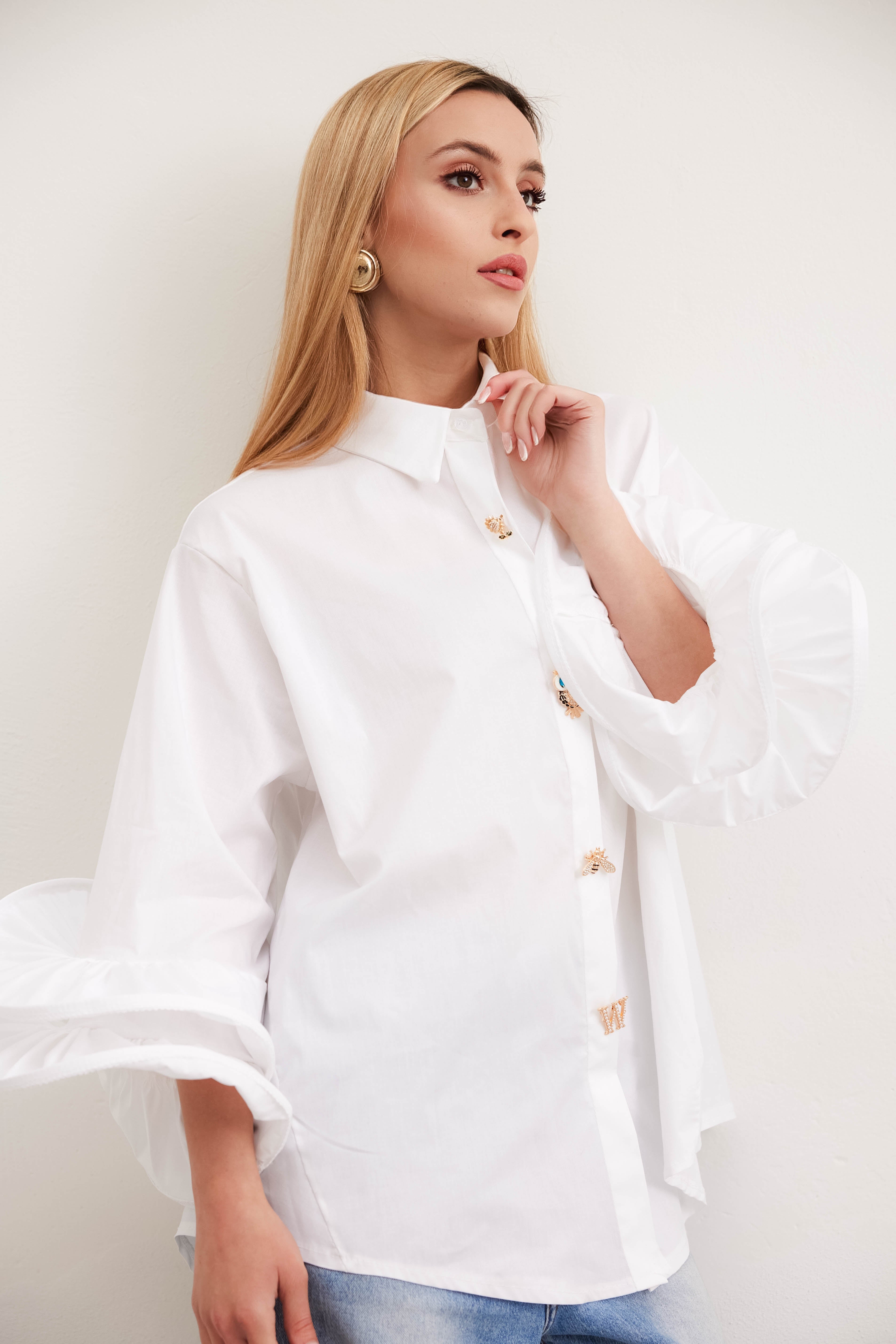 The shirt with Volant sleeves is a sartorial masterpiece, designed for the modern woman who wants a touch of elegance and freshness in her wardrobe. This shirt is the essence of discreet luxury and refinement, a unique piece that does not go unnoticed.