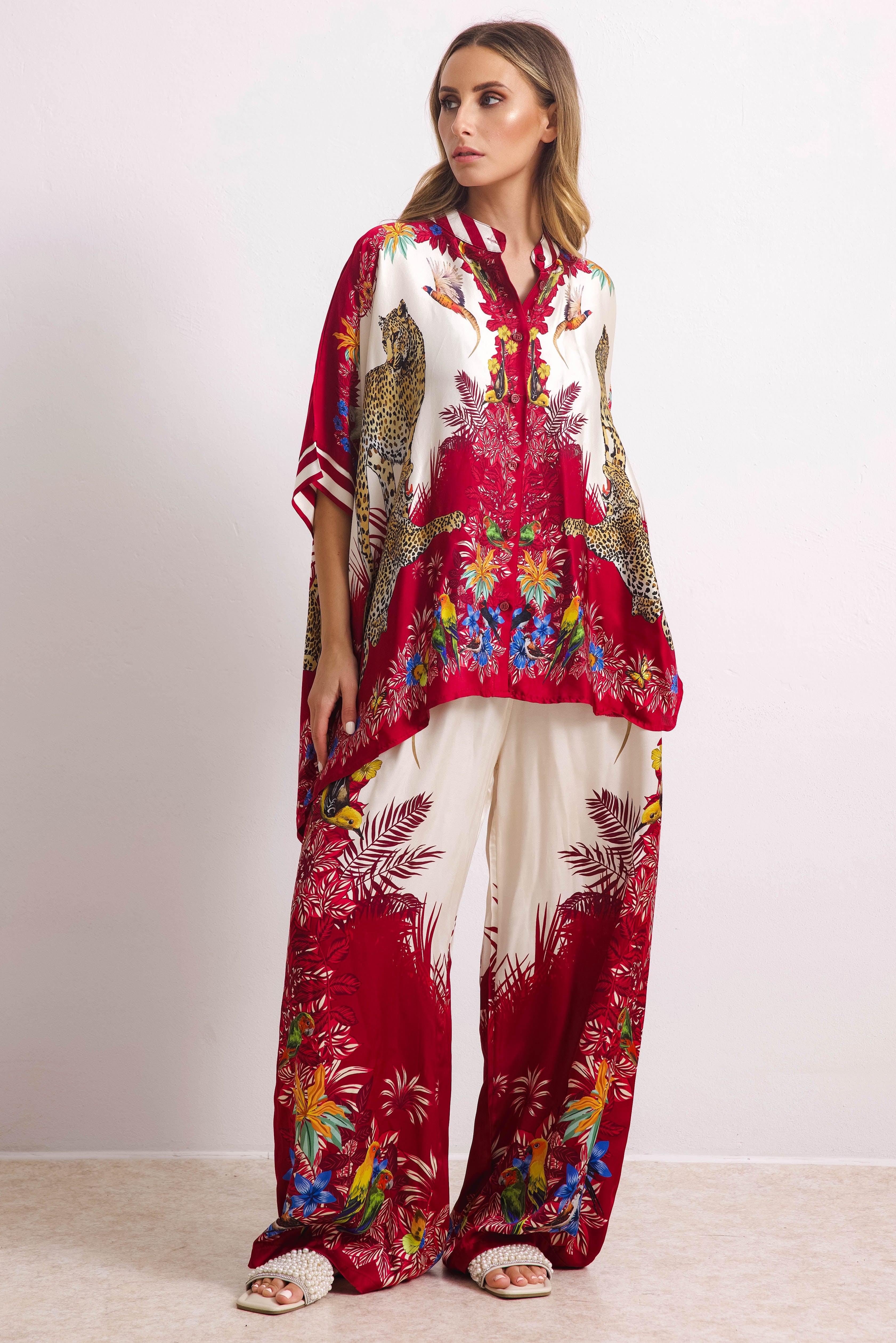 Completo composto da camicia ampia dai lineamenti morbidi ed irregolari con bottoncini centrali frontali. Pantalone classico a palazzo, leggermente elasticizzato in vita.