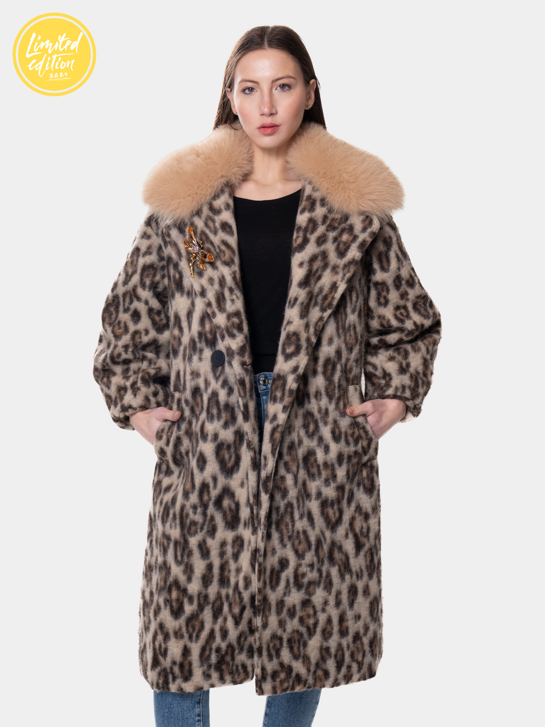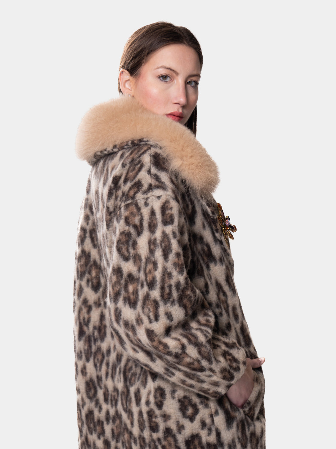 La suave lana hervida envuelve el cuerpo con una sensación de confort y calidez, mientras que el refinado estampado de leopardo aporta un toque de audaz elegancia. El cuello de piel de zorro añade un aura de lujo atemporal, pero lo que realmente distingue a esta pieza son sus impresionantes joyas. Una joya engastada con maestría, trabajada con materiales preciosos y detalles finamente cincelados, que se funde armoniosamente con la textura del tejido.
