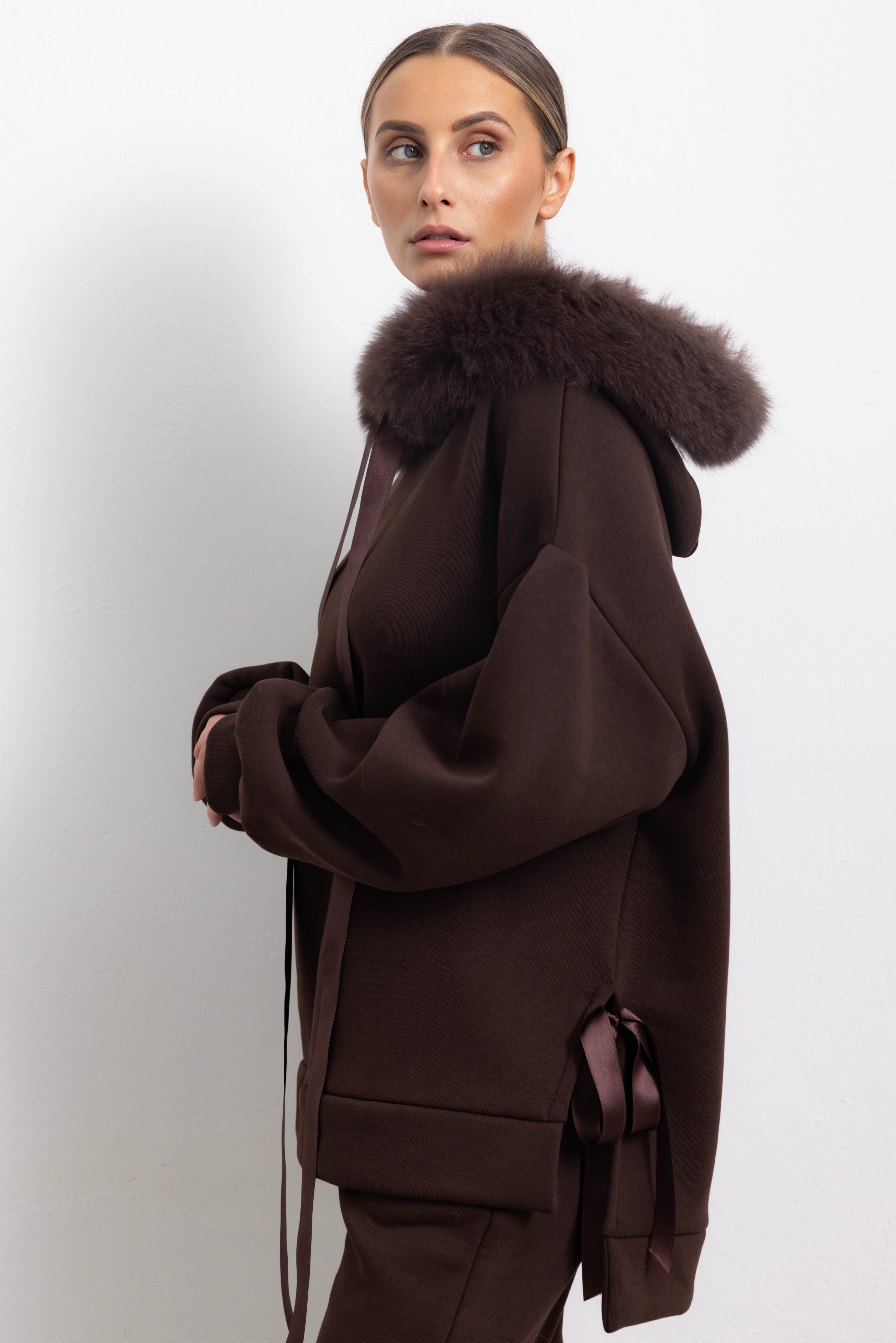 El chándal Portocervo incluye sudadera y pantalón juntos. El chándal está confeccionado en algodón y tiene un corte oversize, recomendado para los amantes de las prendas suaves e irregulares. Se adapta a tallas medianas hasta XL de forma excepcional. La parte delantera de la sudadera es ligeramente más corta que la trasera y, además de la clásica capucha con ribete de piel de zorro, se caracteriza por los cordones de raso. Cálido y perfecto para cualquier ocasión, en algodón, íntegramente polar.