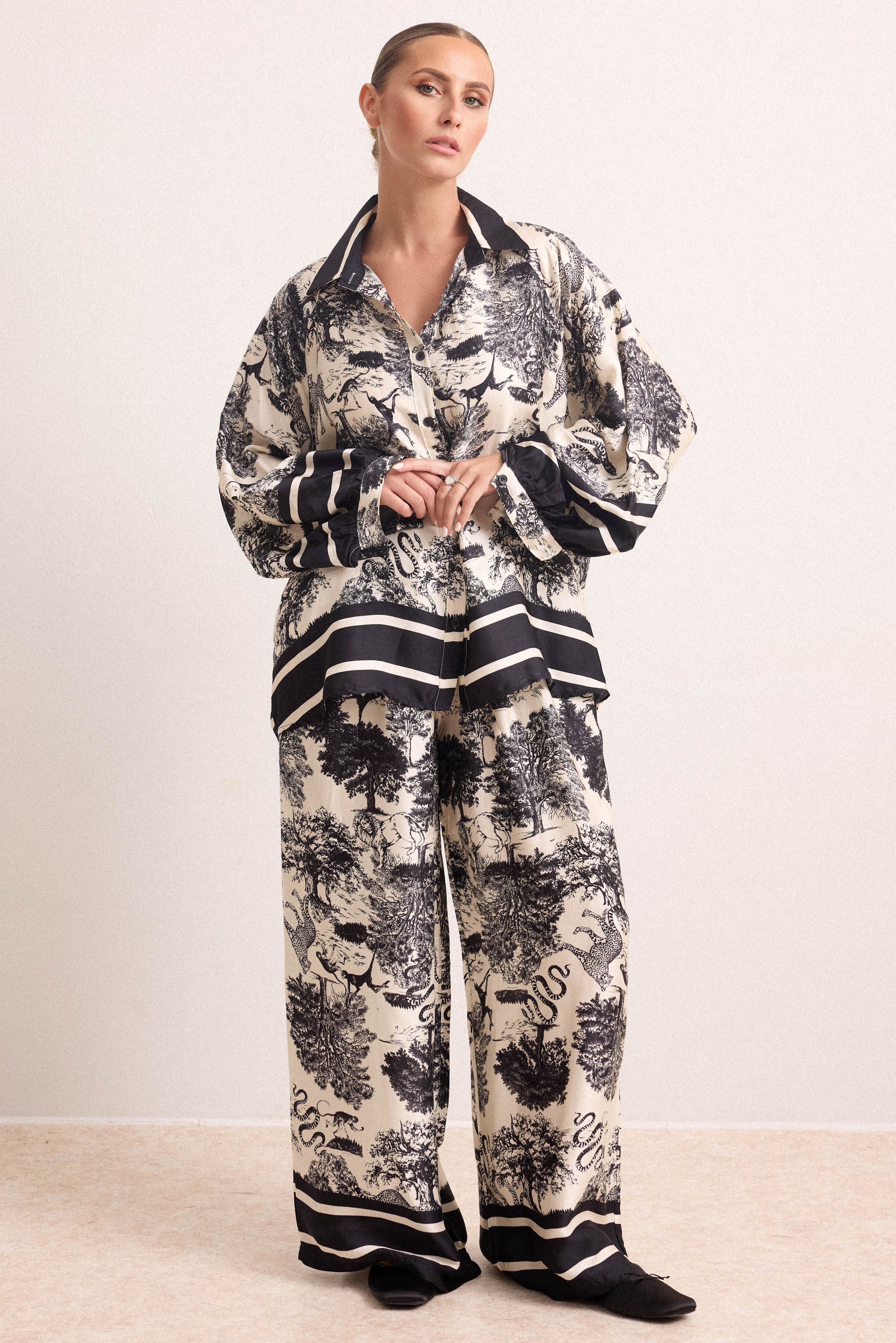 Completo composto da ampia camicia oversize dalle linee morbide, con bottoni centrali, colletto classico e maniche lunghe.