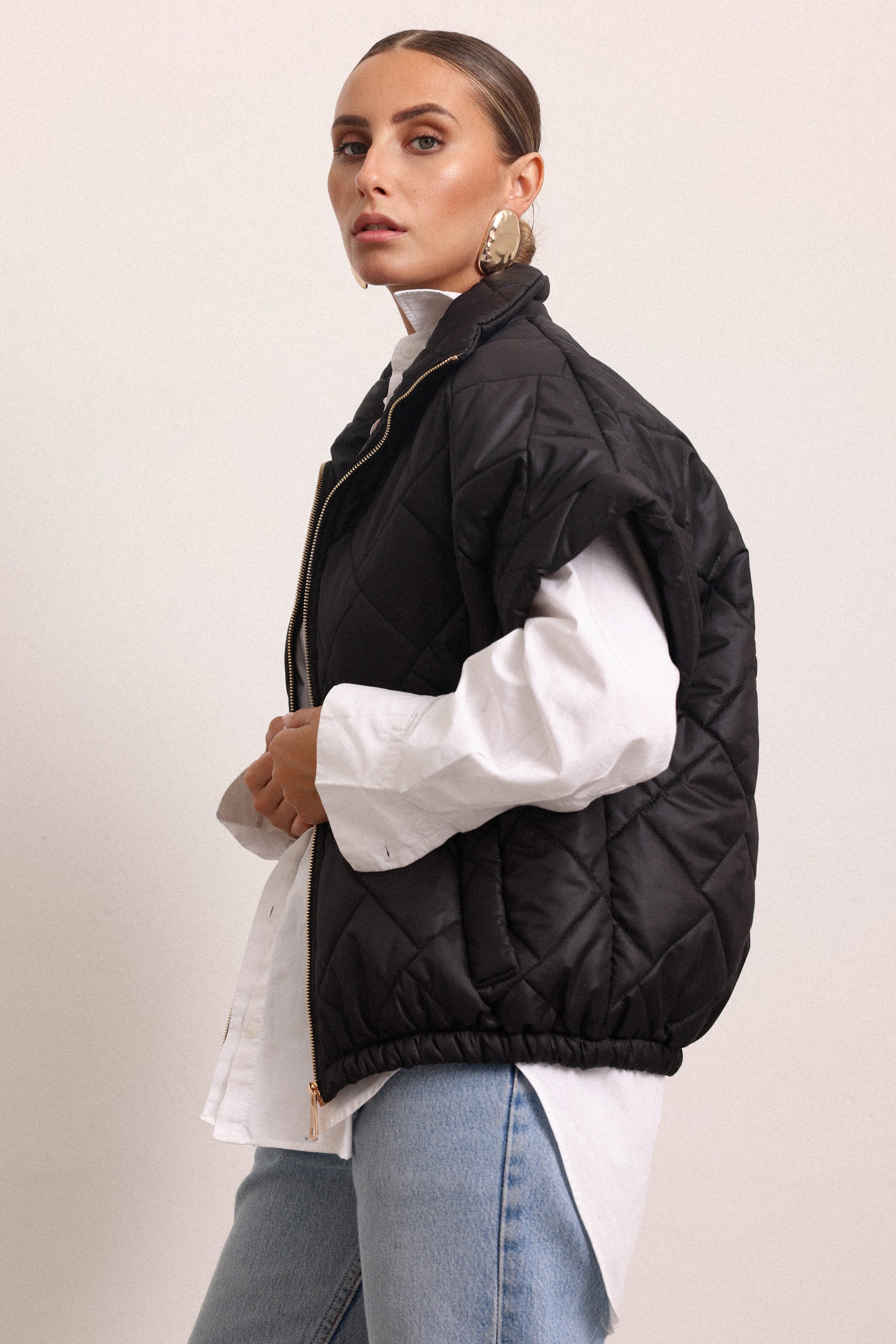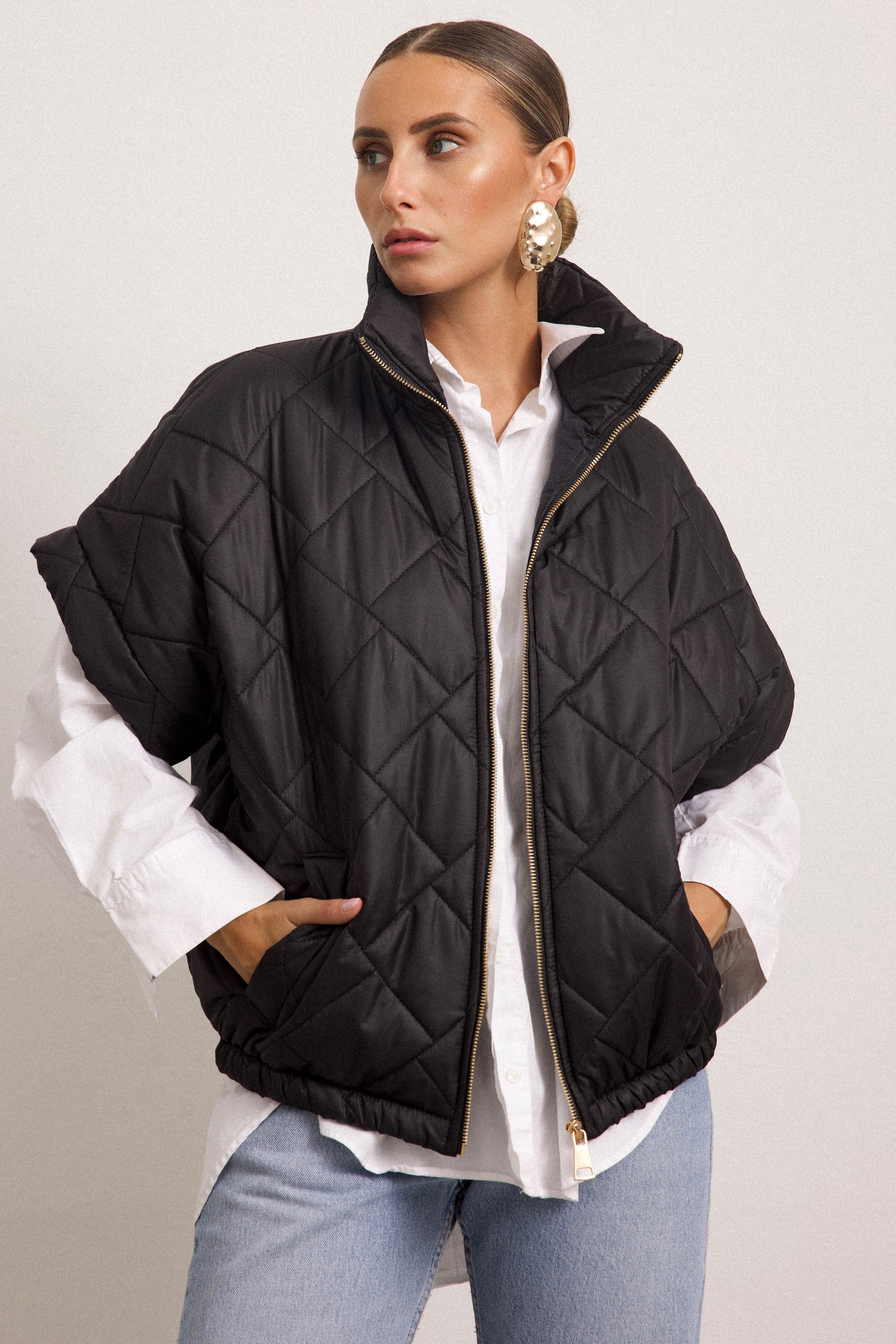 Giacchetta a maniche corte con colletto e cerniera frontale. Internamente foderato ed elasticizzato sulla parte finale così da ottenere un effetto bomber quando chiuso.