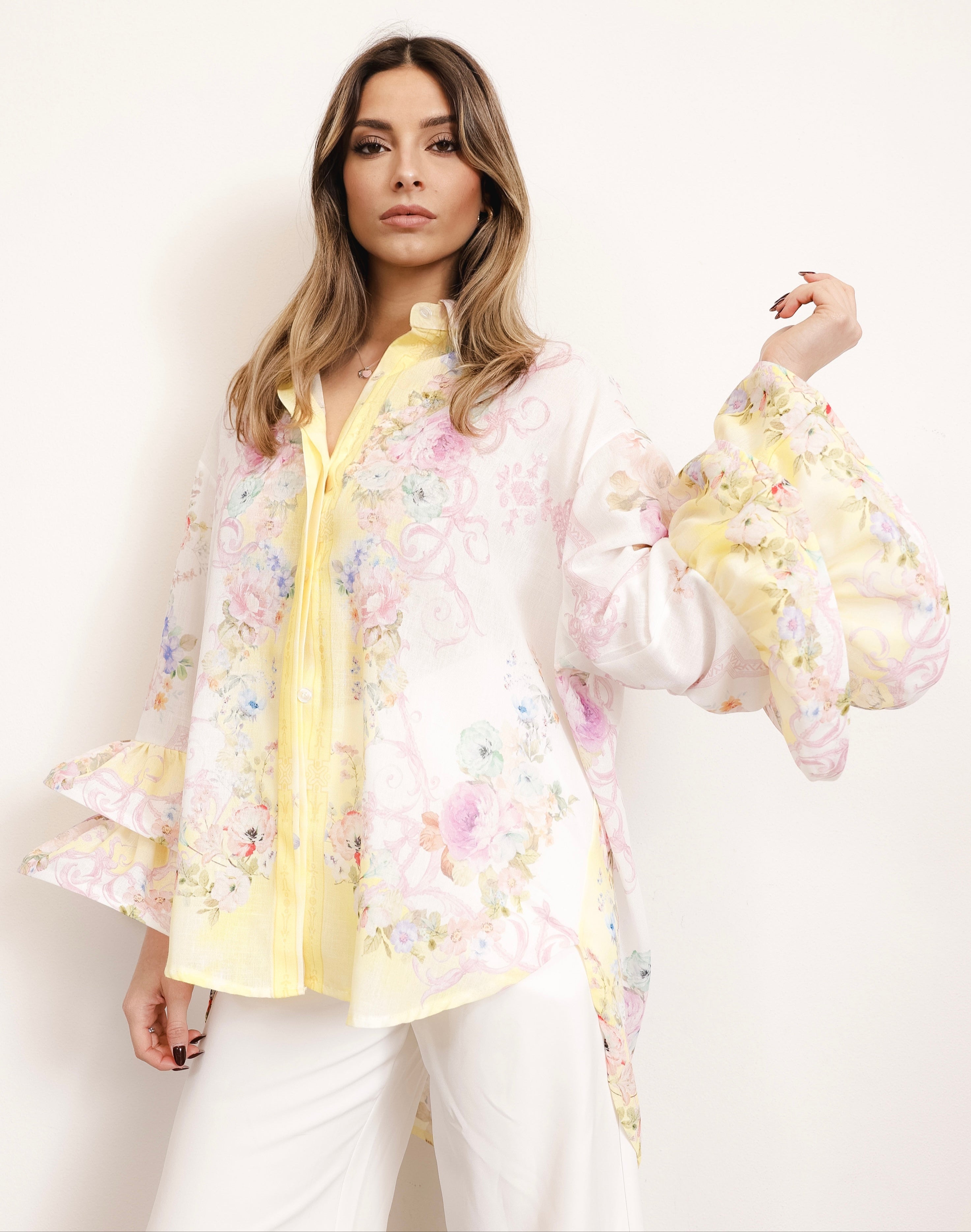 La camisa con mangas Volant es una obra maestra de vestimenta, diseñada para la mujer moderna que quiere un toque de elegancia y frescura en su armario. Esta camisa es la esencia del lujo y el refinamiento discretos, una pieza única que no pasa desapercibida.
