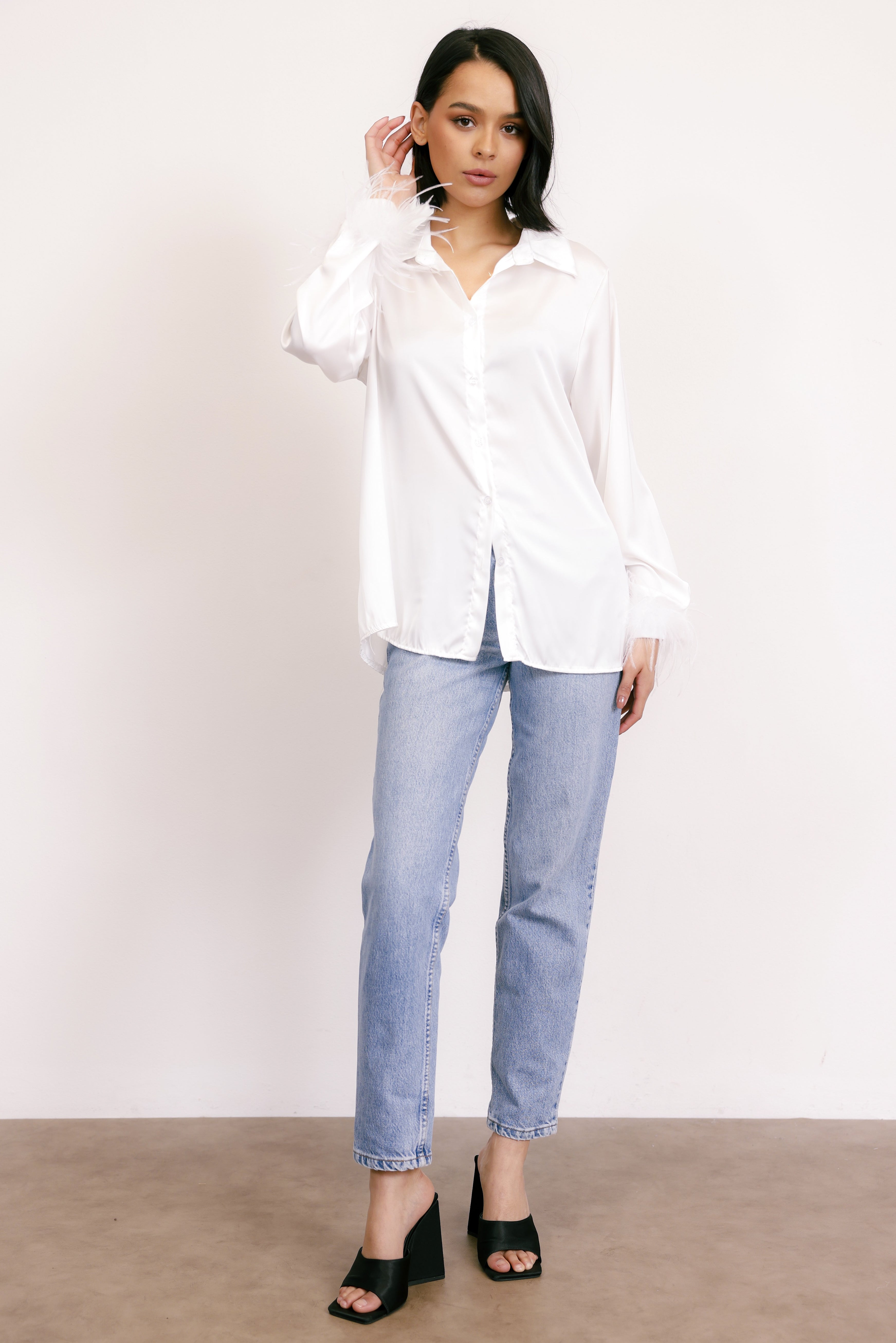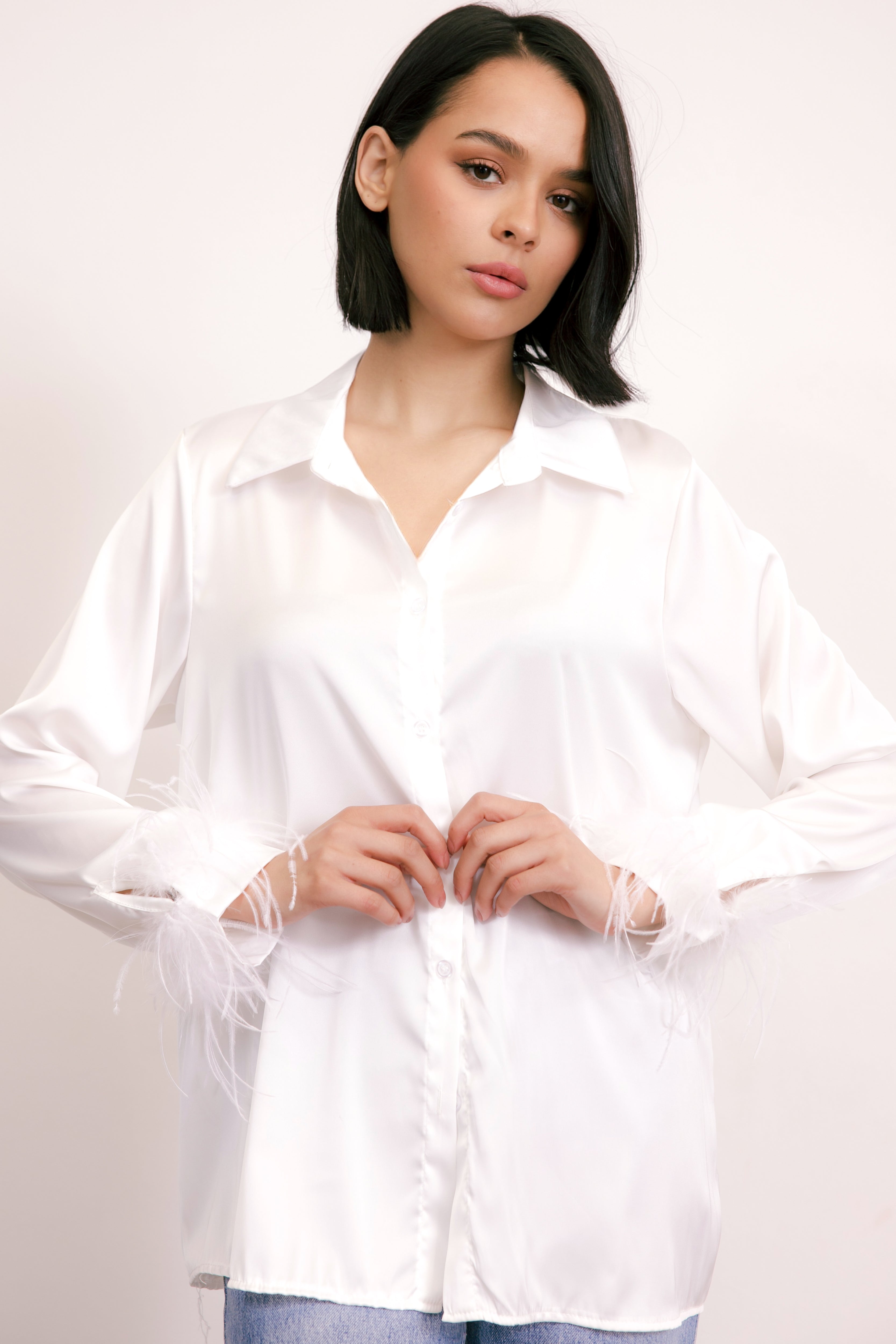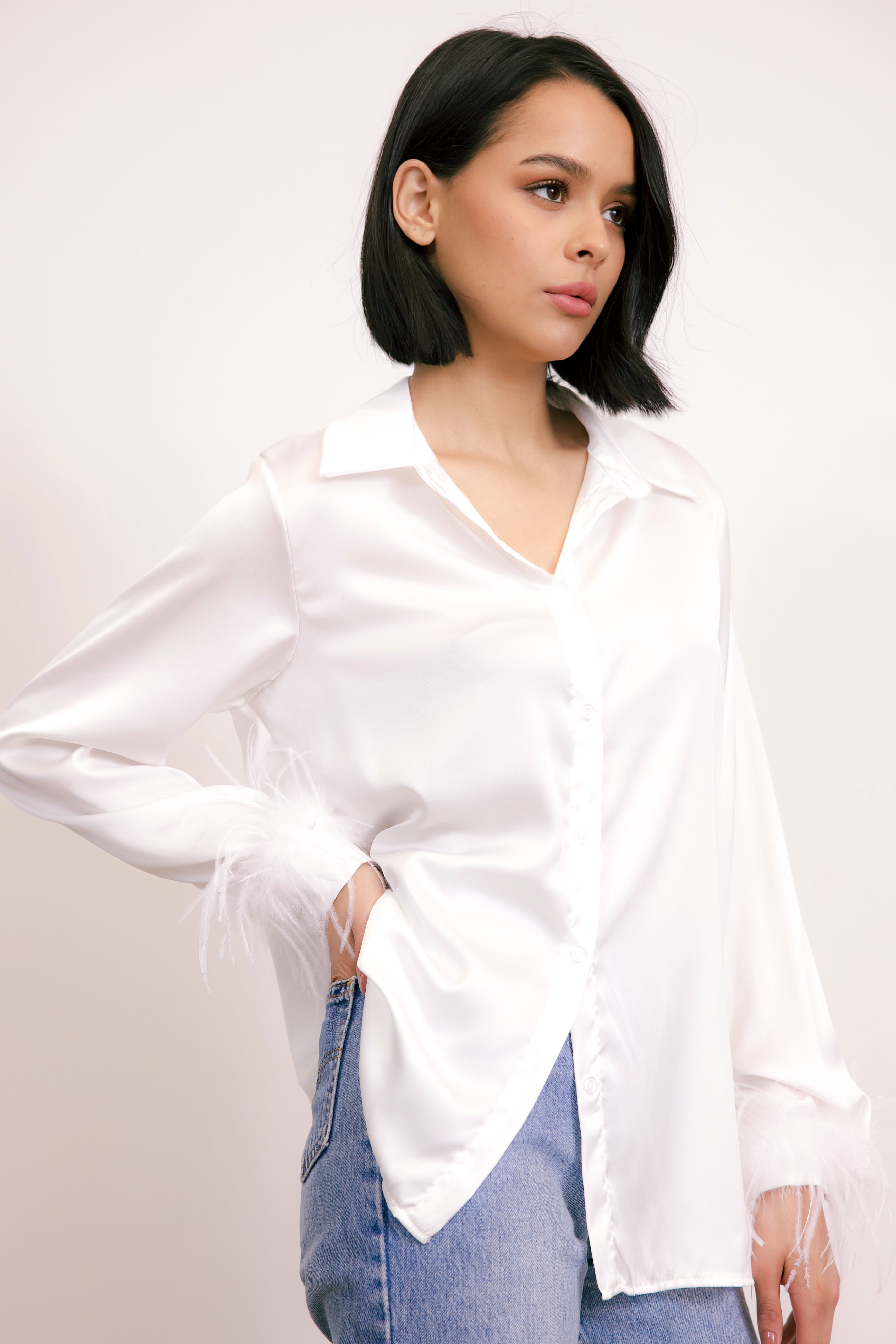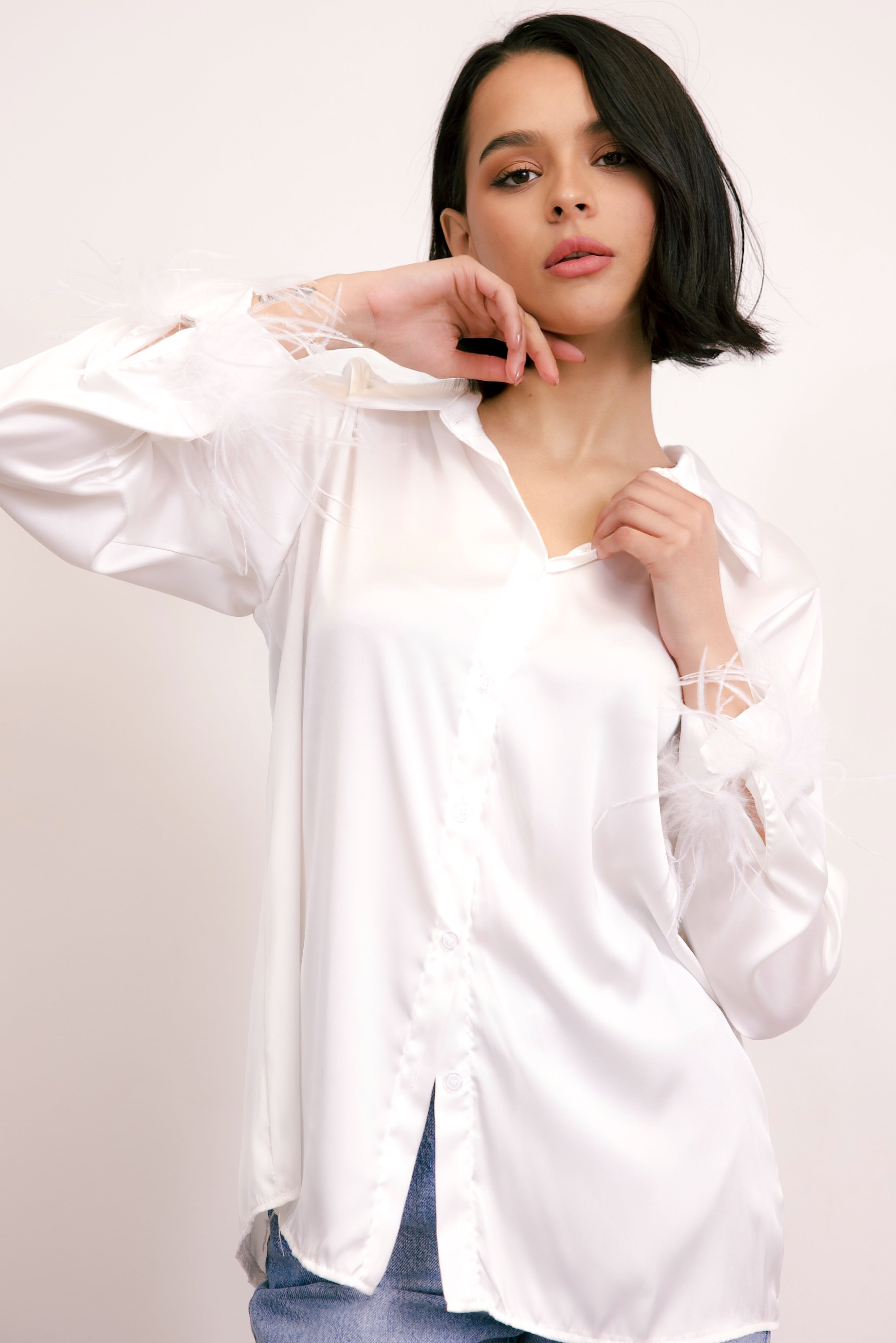 Descubra nuestra camisa clásica con un toque único: Las plumas de Vere Marabù adornan las mangas, ofreciendo un sutil acento de lujo.