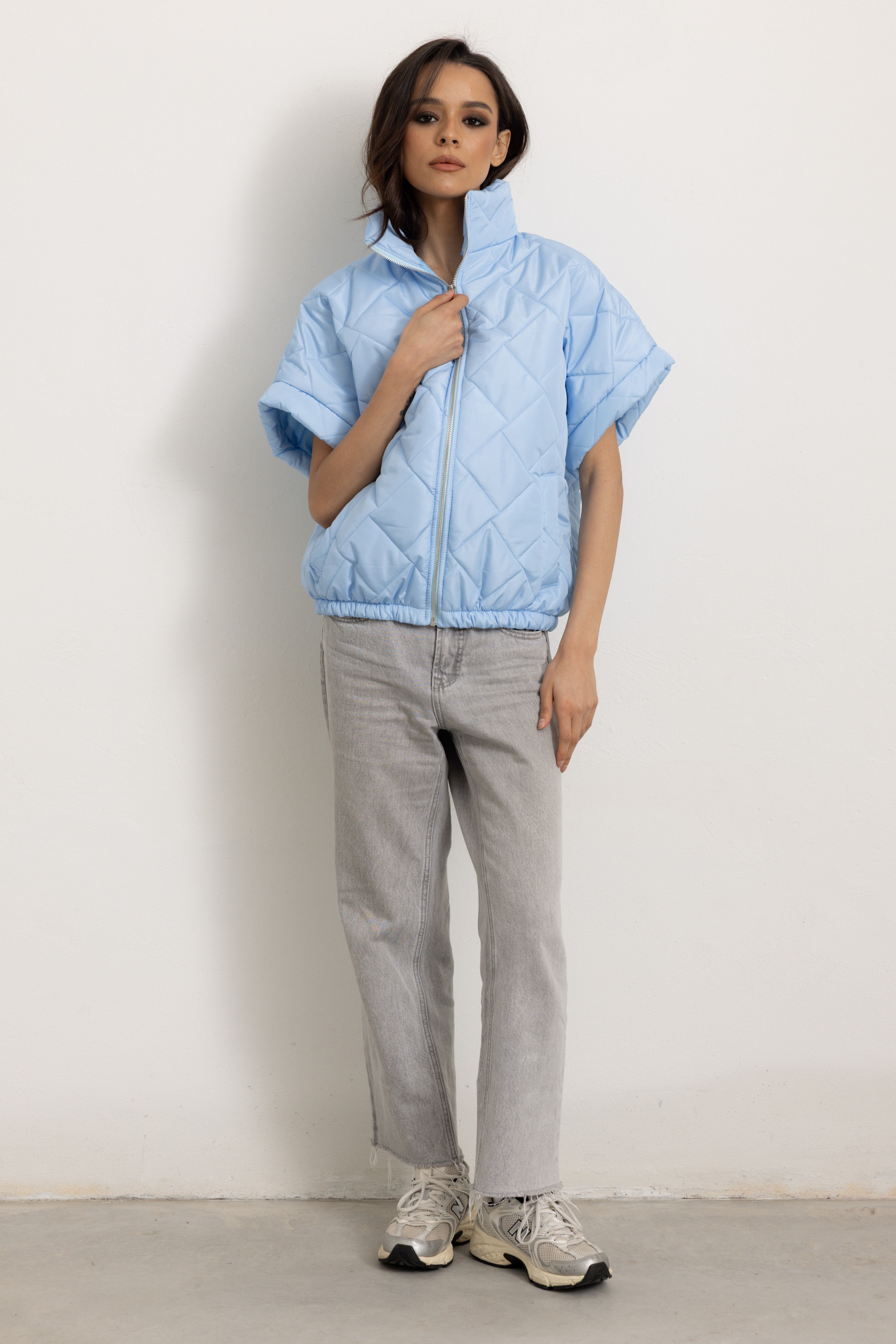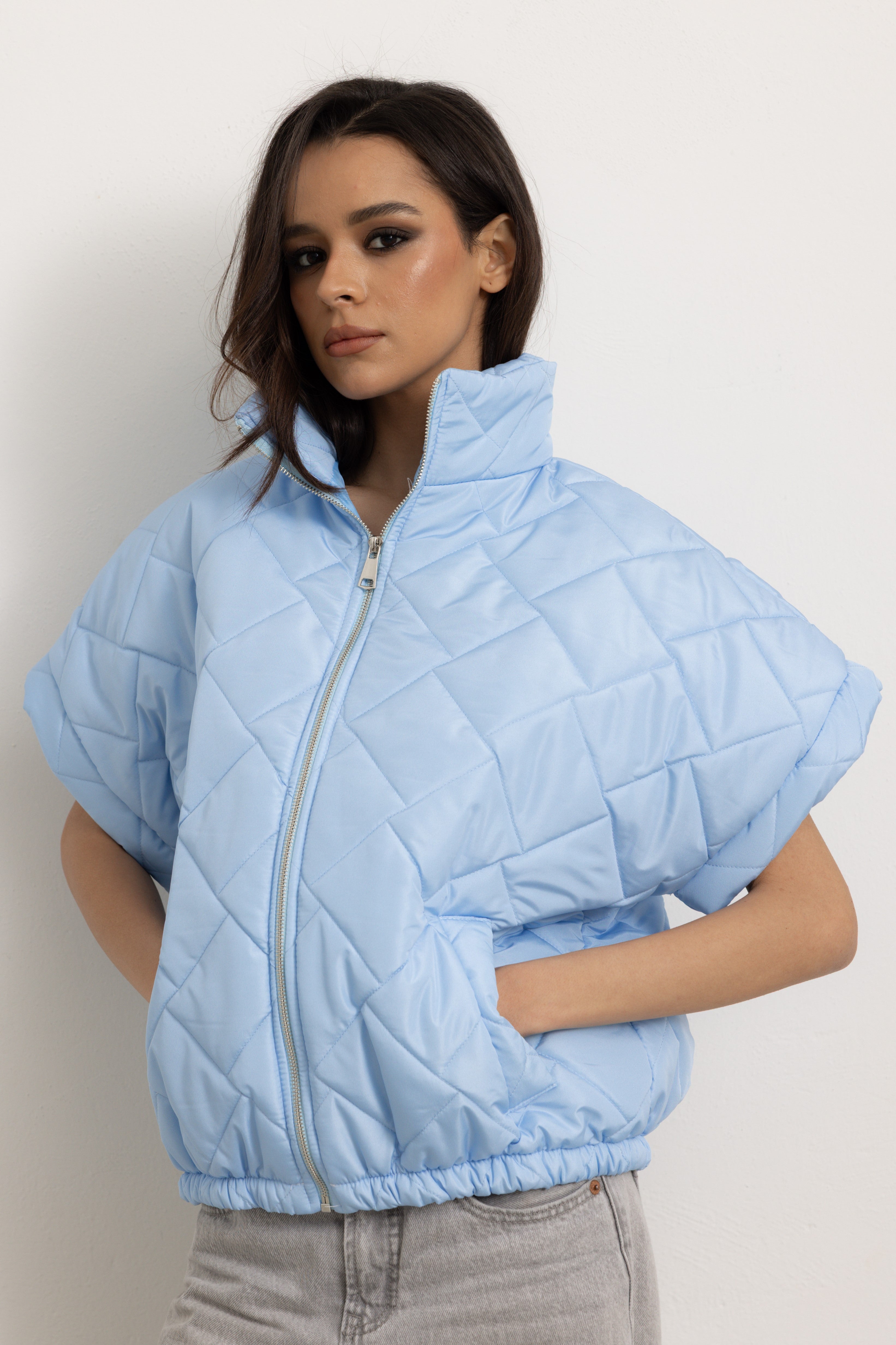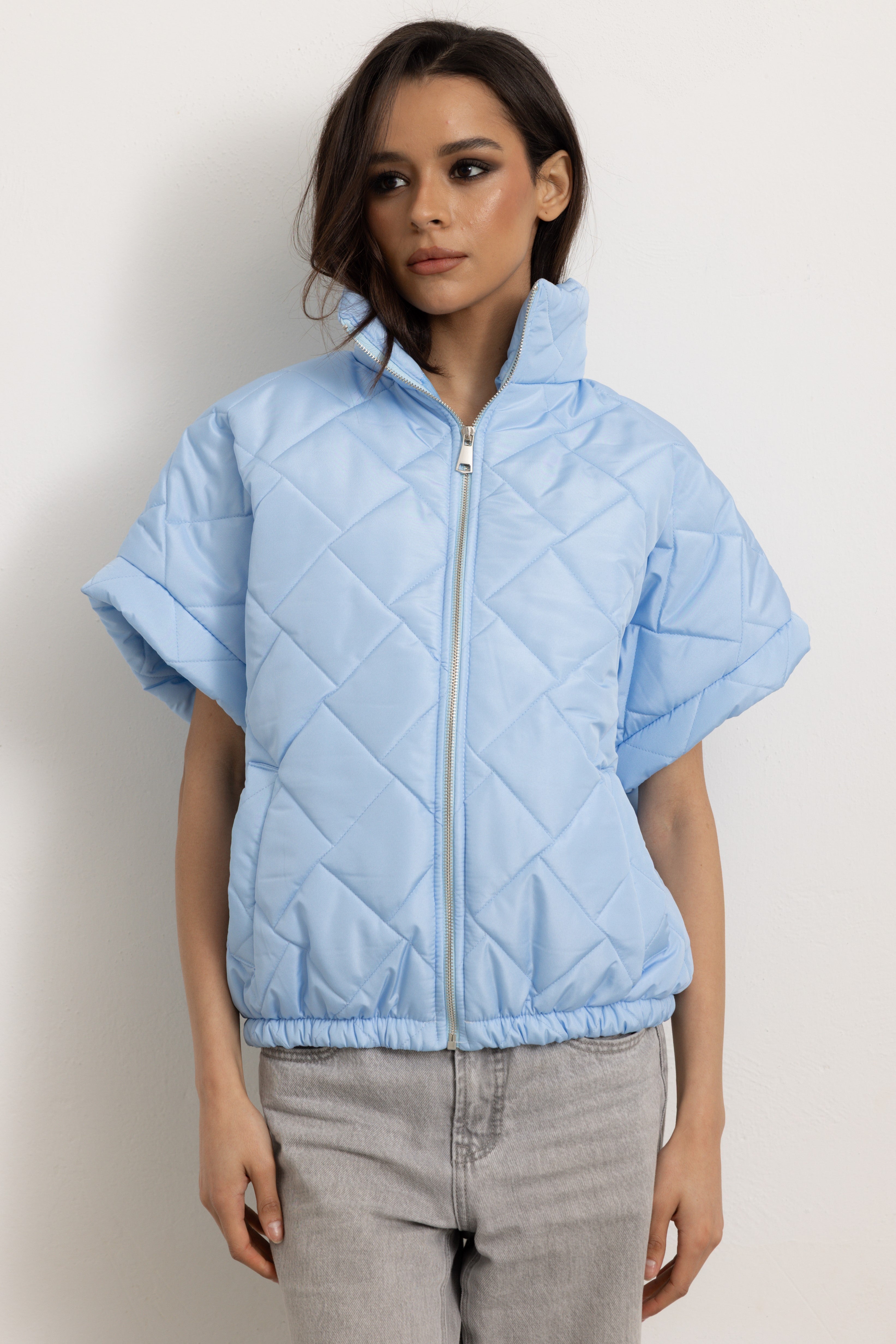 Giacchetta a maniche corte con colletto e cerniera frontale. Internamente foderato ed elasticizzato sulla parte finale così da ottenere un effetto bomber quando chiuso.