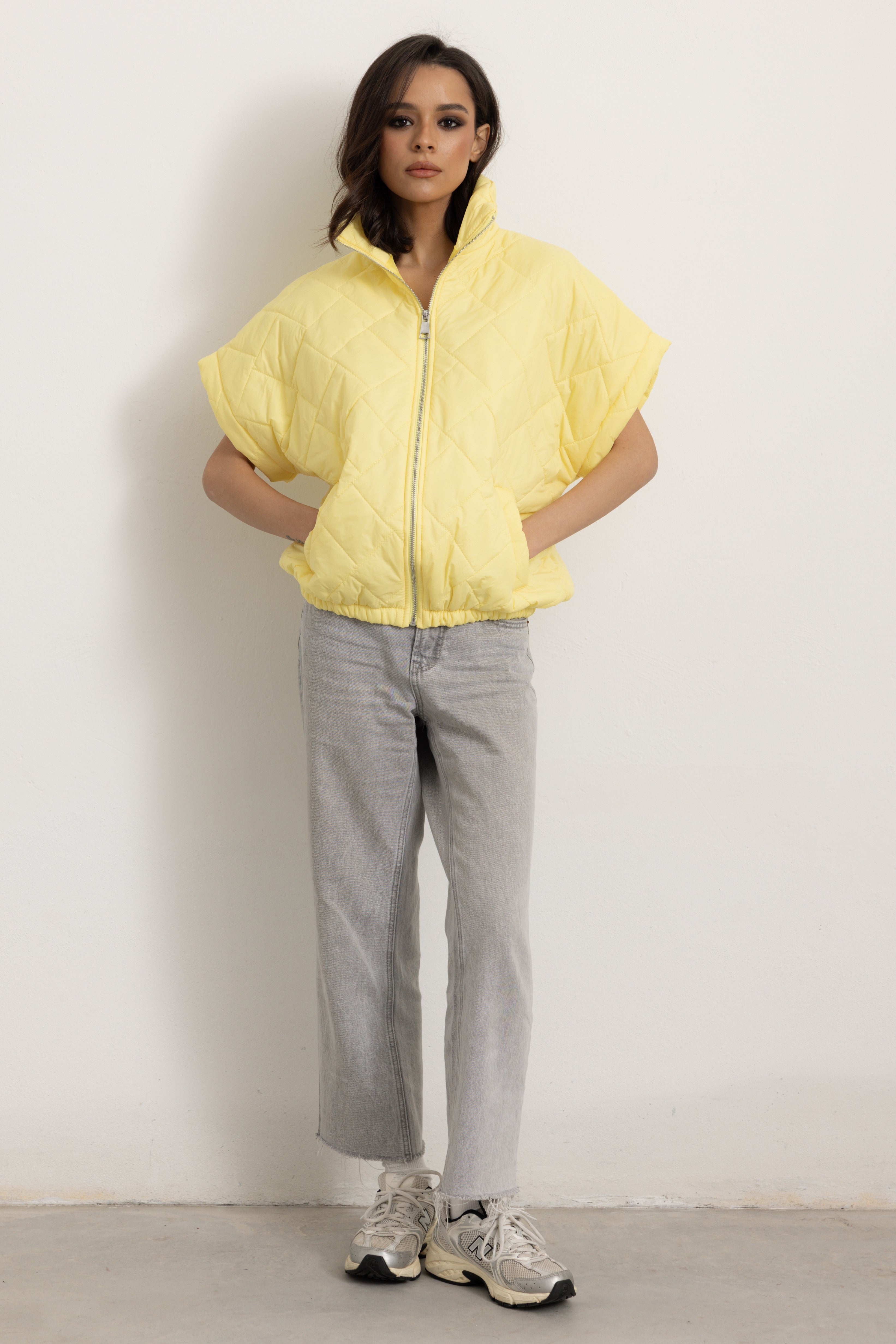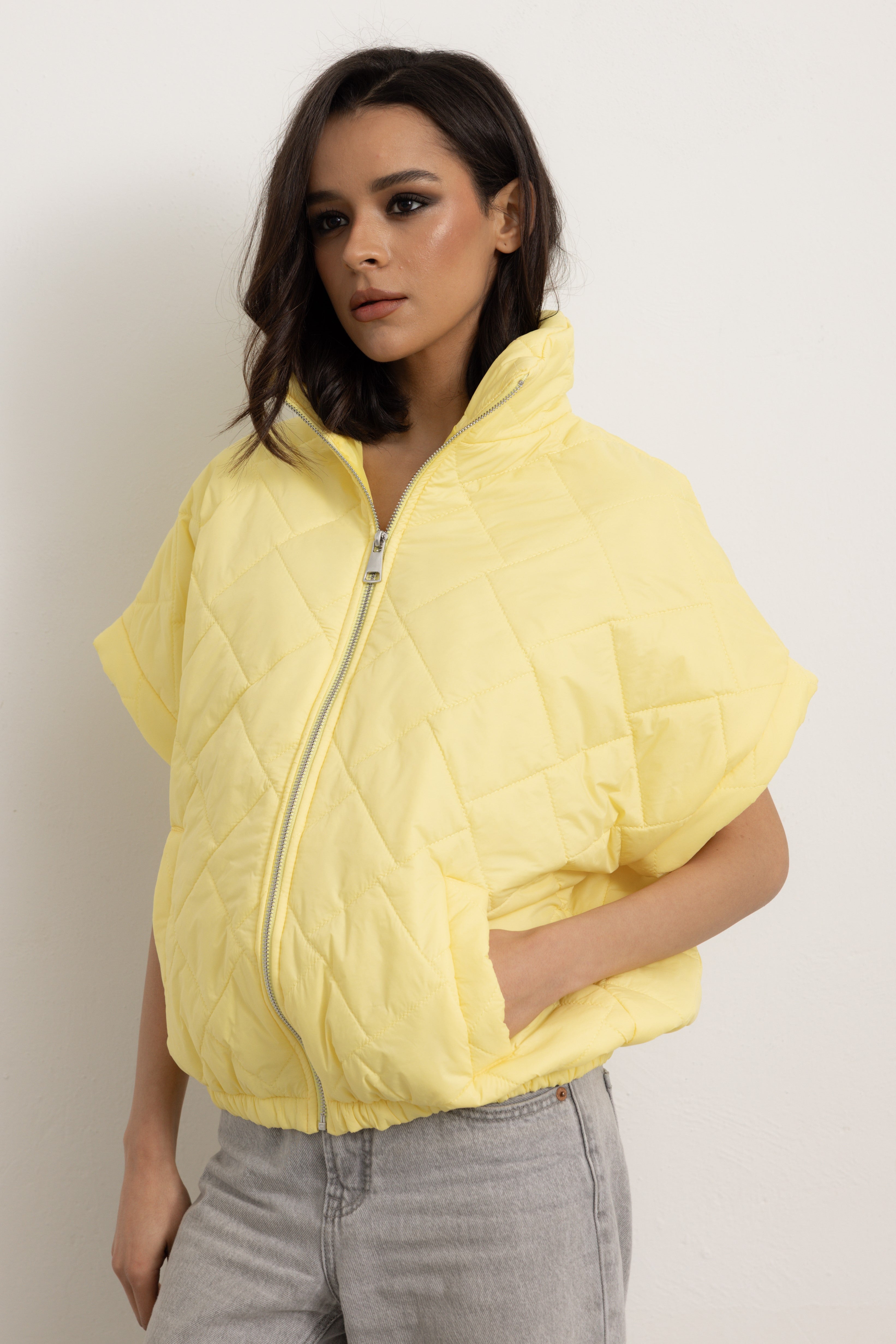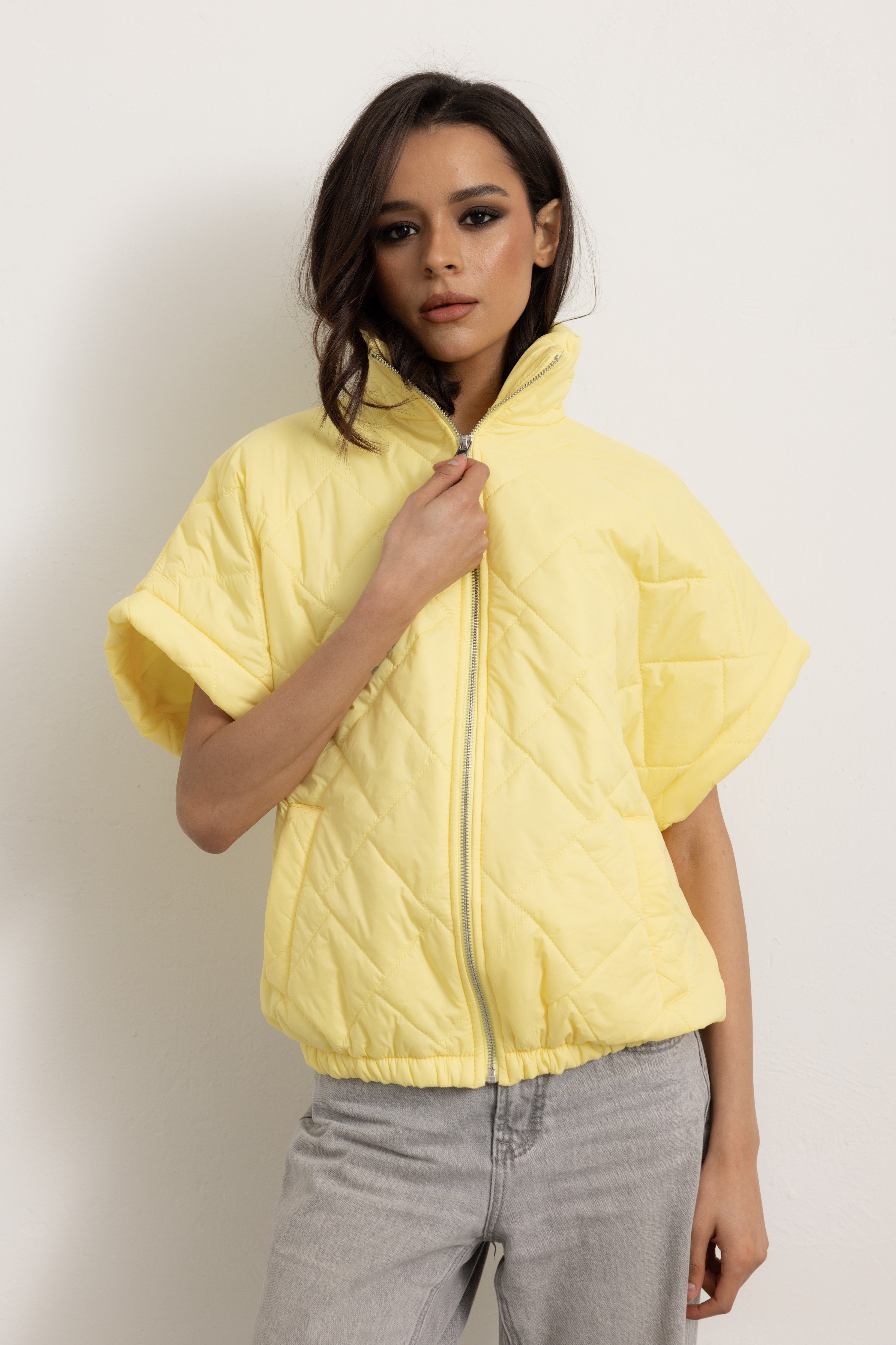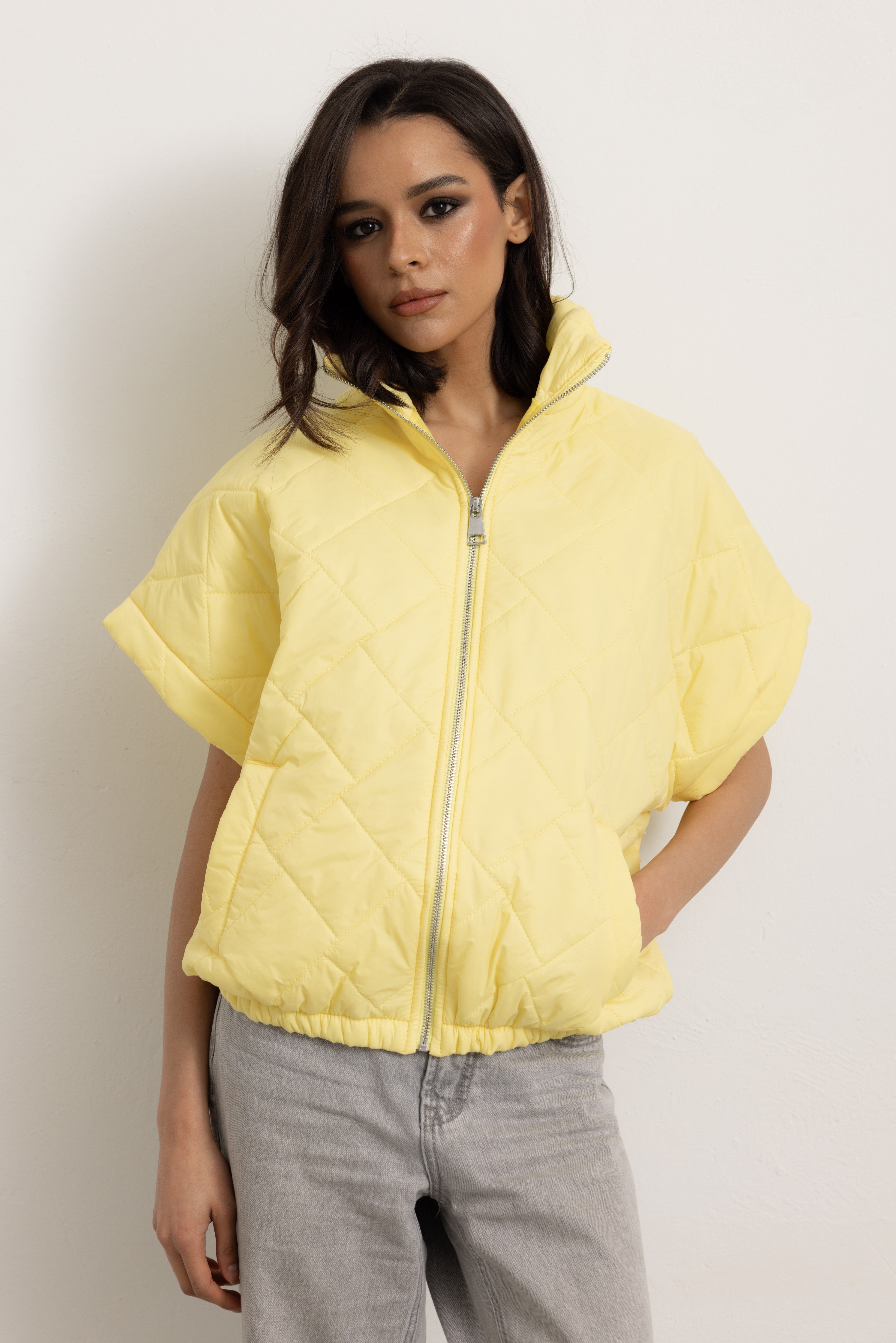 Giacchetta a maniche corte con colletto e cerniera frontale. Internamente foderato ed elasticizzato sulla parte finale così da ottenere un effetto bomber quando chiuso.