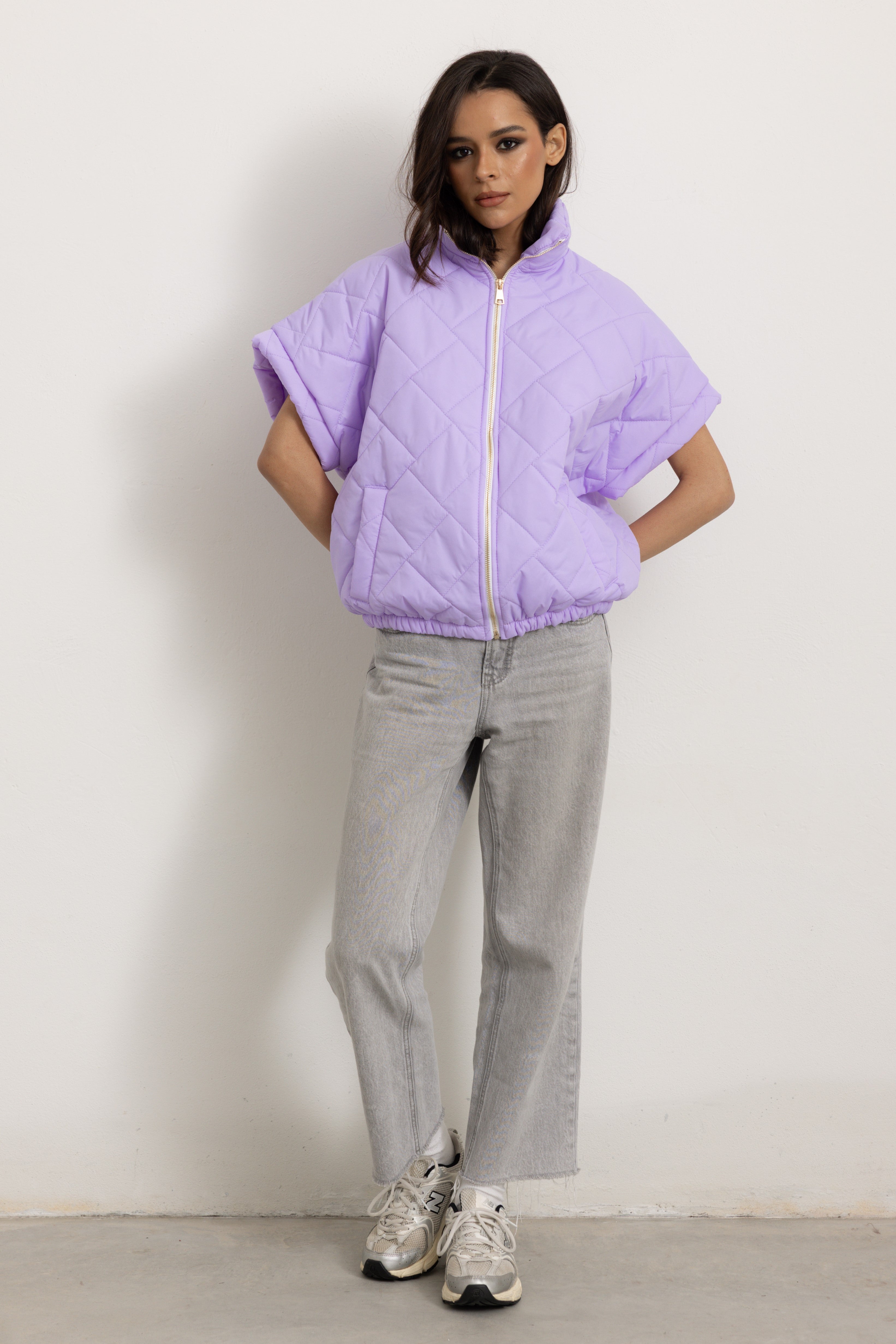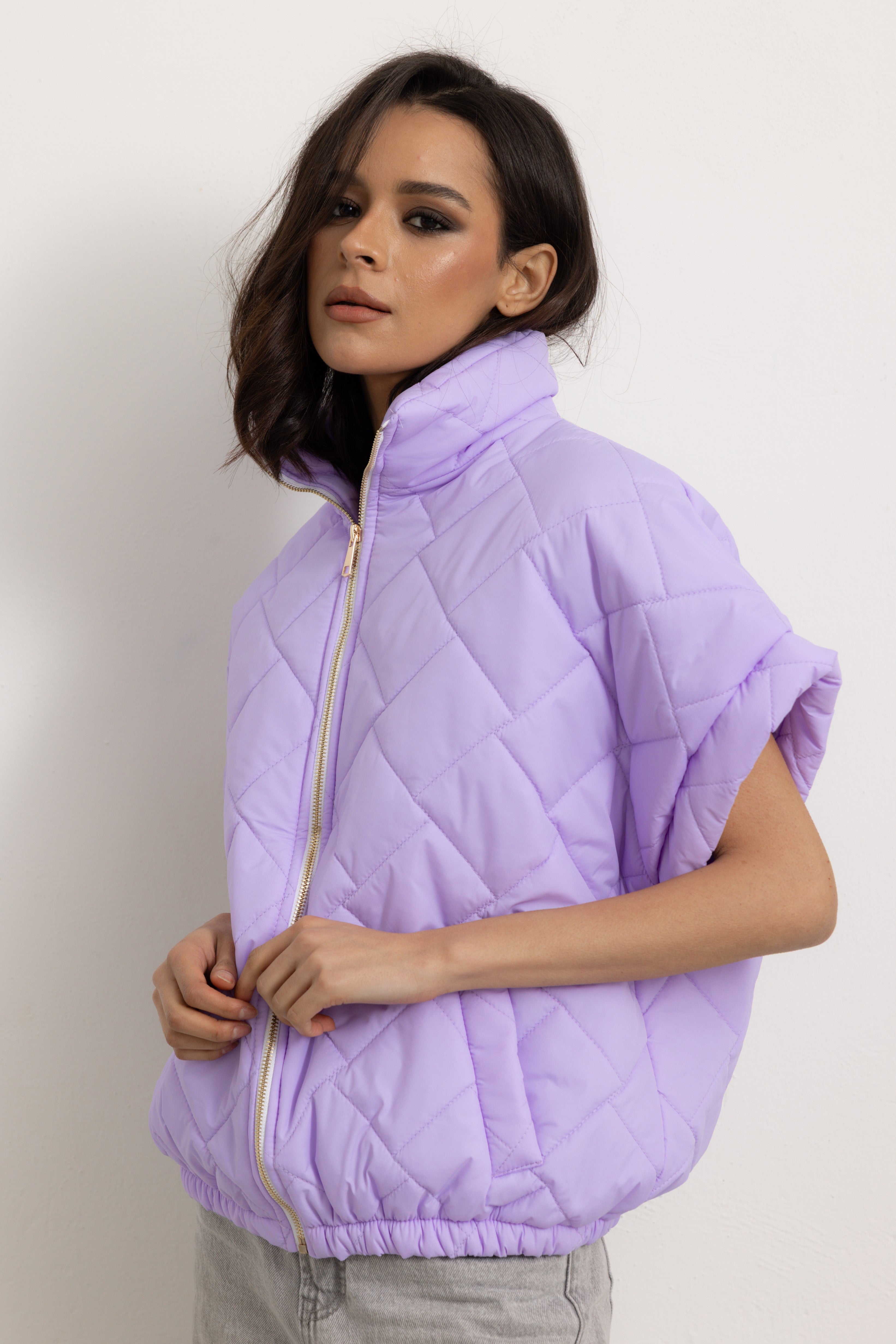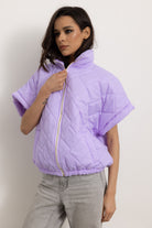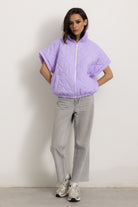 Giacchetta a maniche corte con colletto e cerniera frontale. Internamente foderato ed elasticizzato sulla parte finale così da ottenere un effetto bomber quando chiuso.