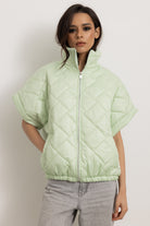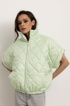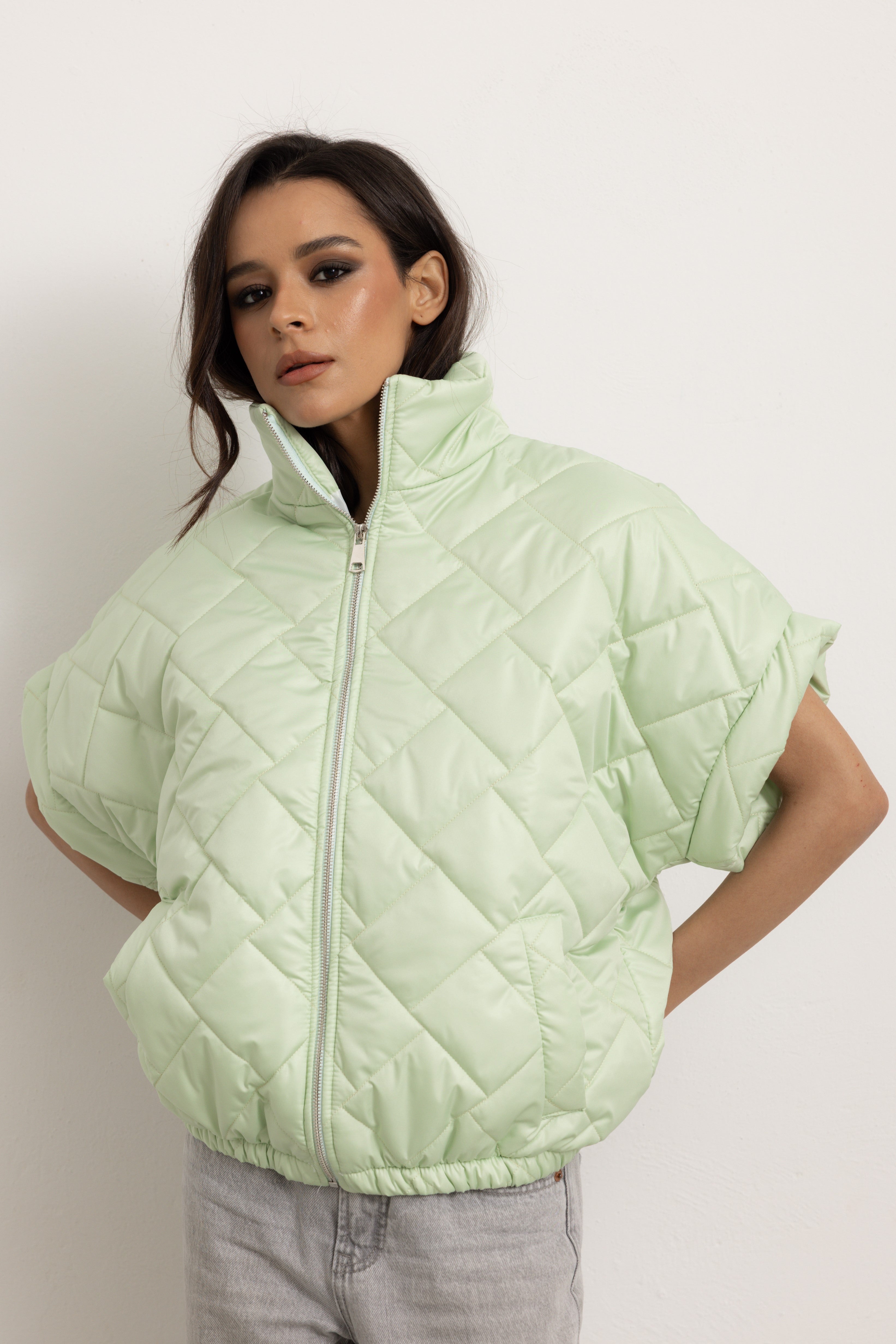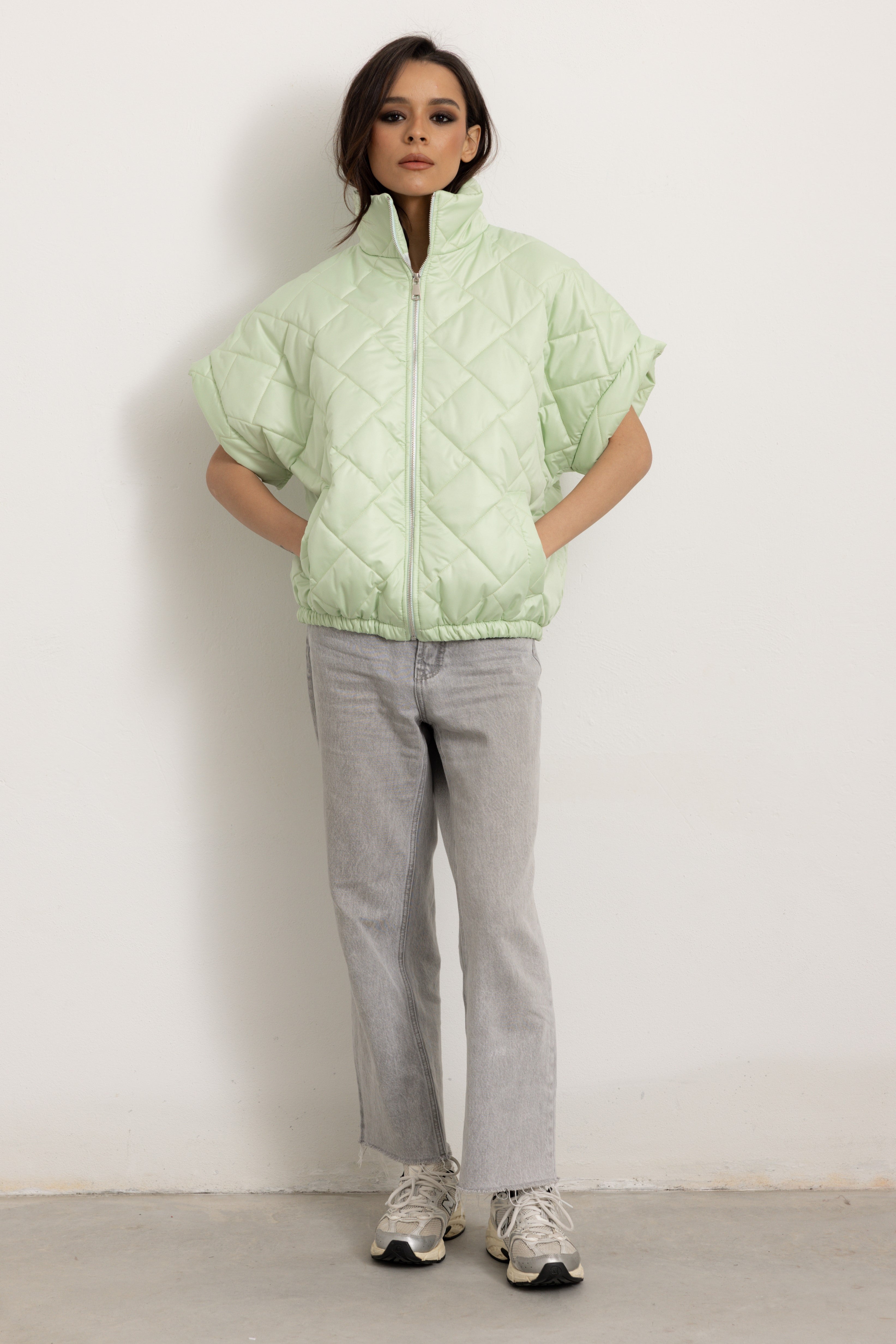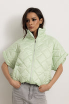 Giacchetta a maniche corte con colletto e cerniera frontale. Internamente foderato ed elasticizzato sulla parte finale così da ottenere un effetto bomber quando chiuso.