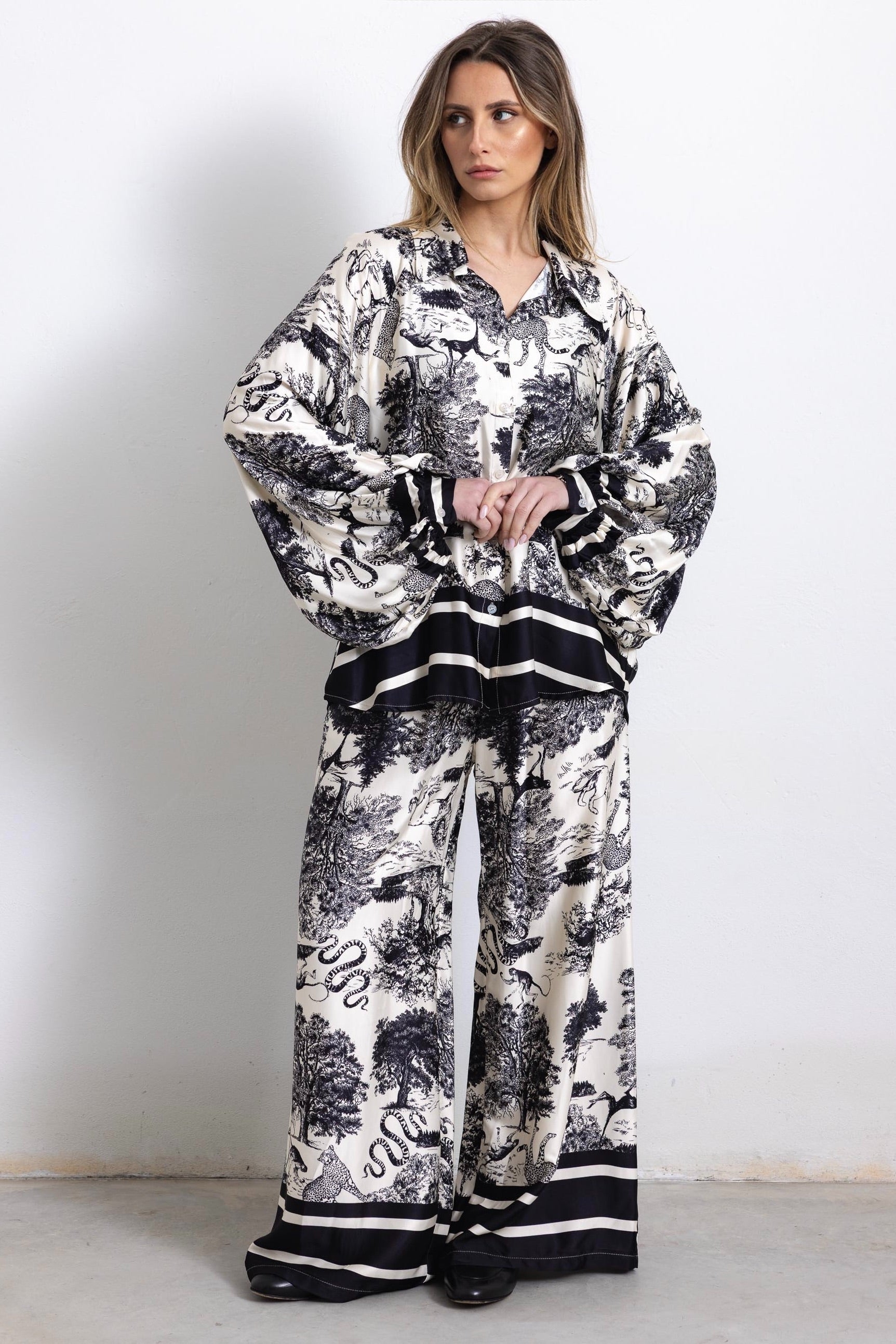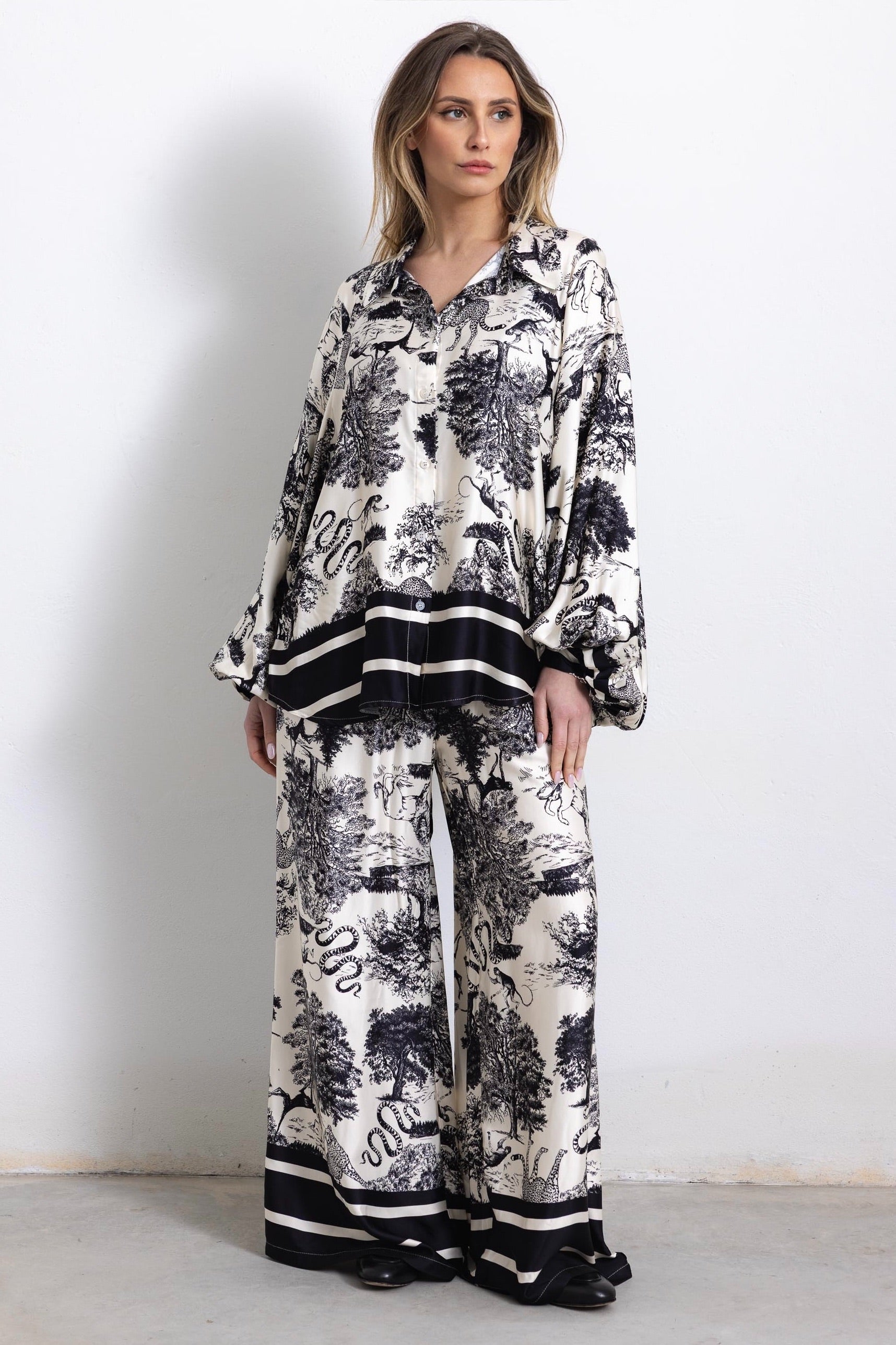 Completo composto da ampia camicia oversize dalle linee morbide, con bottoni centrali, colletto classico e maniche lunghe.