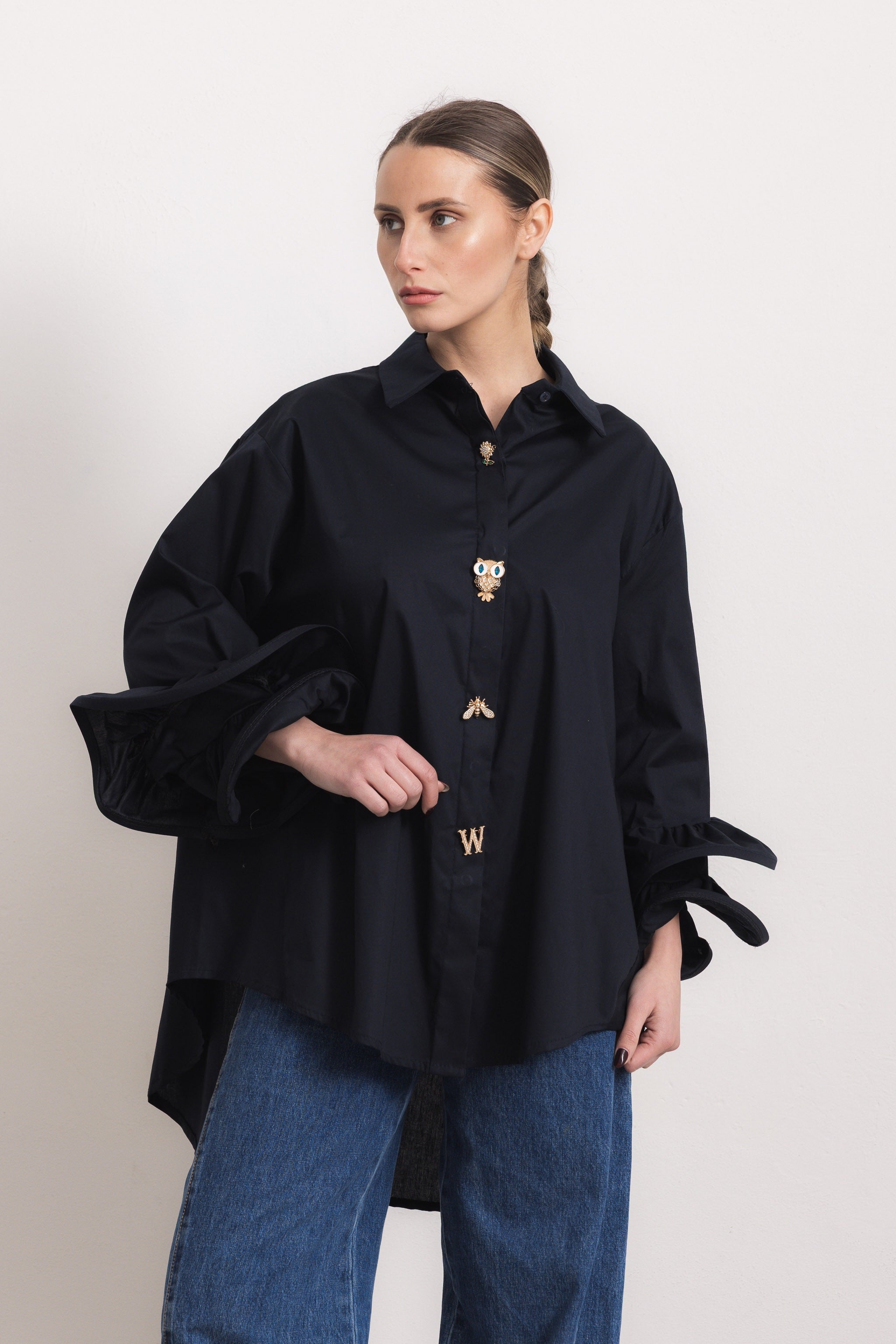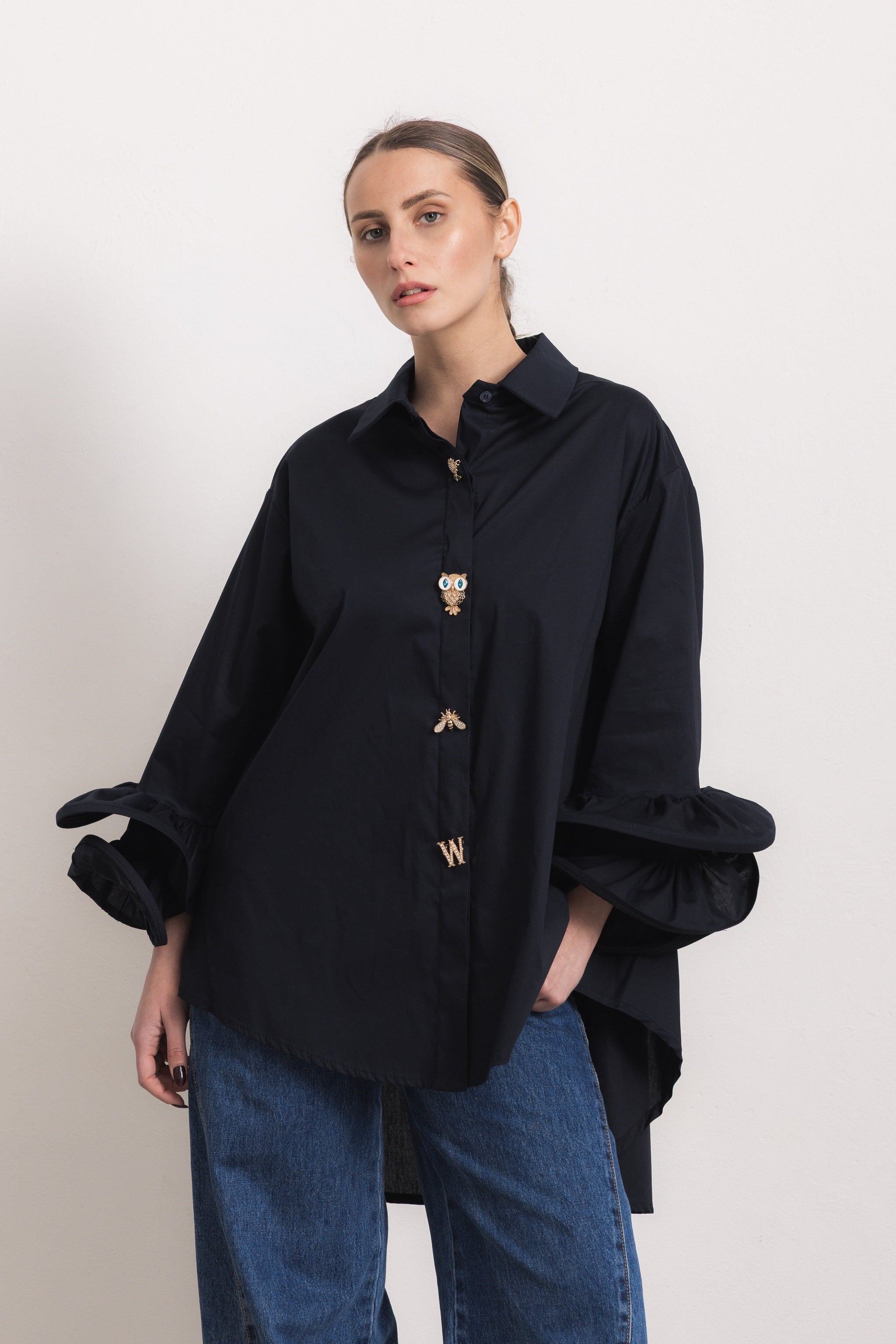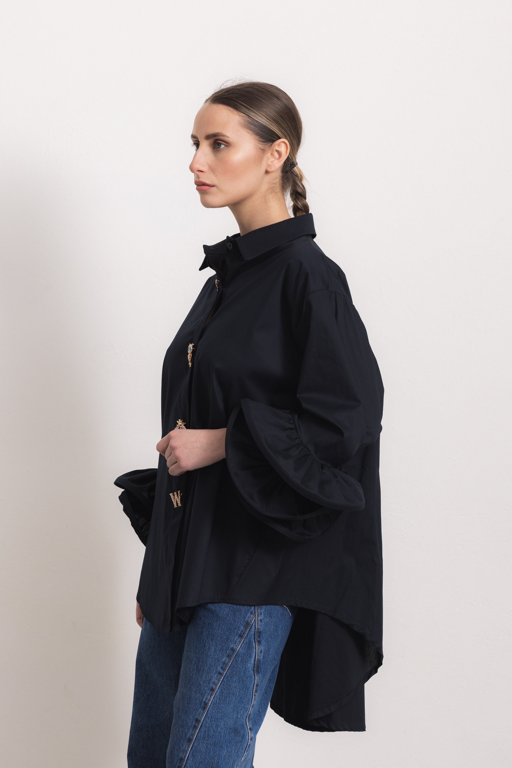 Maniche Volant: le maniche volant di questa camicia sono una celebrazione della femminilità. Realizzate con una cura minuziosa, presentano morbide onde di tessuto che cadono leggermente sopra il gomito, creando un movimento fluido e romantico. Le pieghe sono sapientemente progettate per dare volume senza appesantire la silhouette, aggiungendo un tocco di drammaticità sofisticata ad ogni gesto.