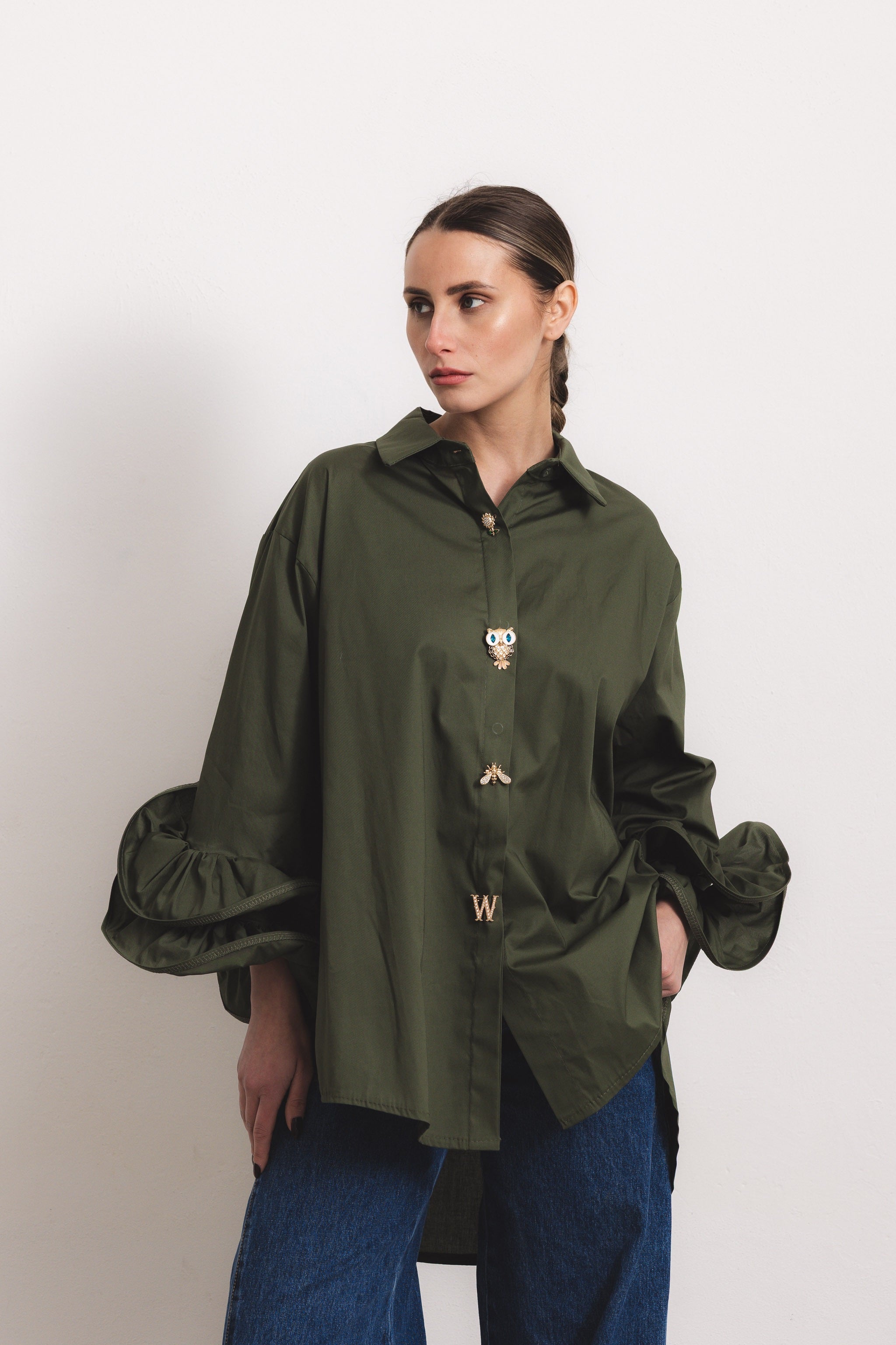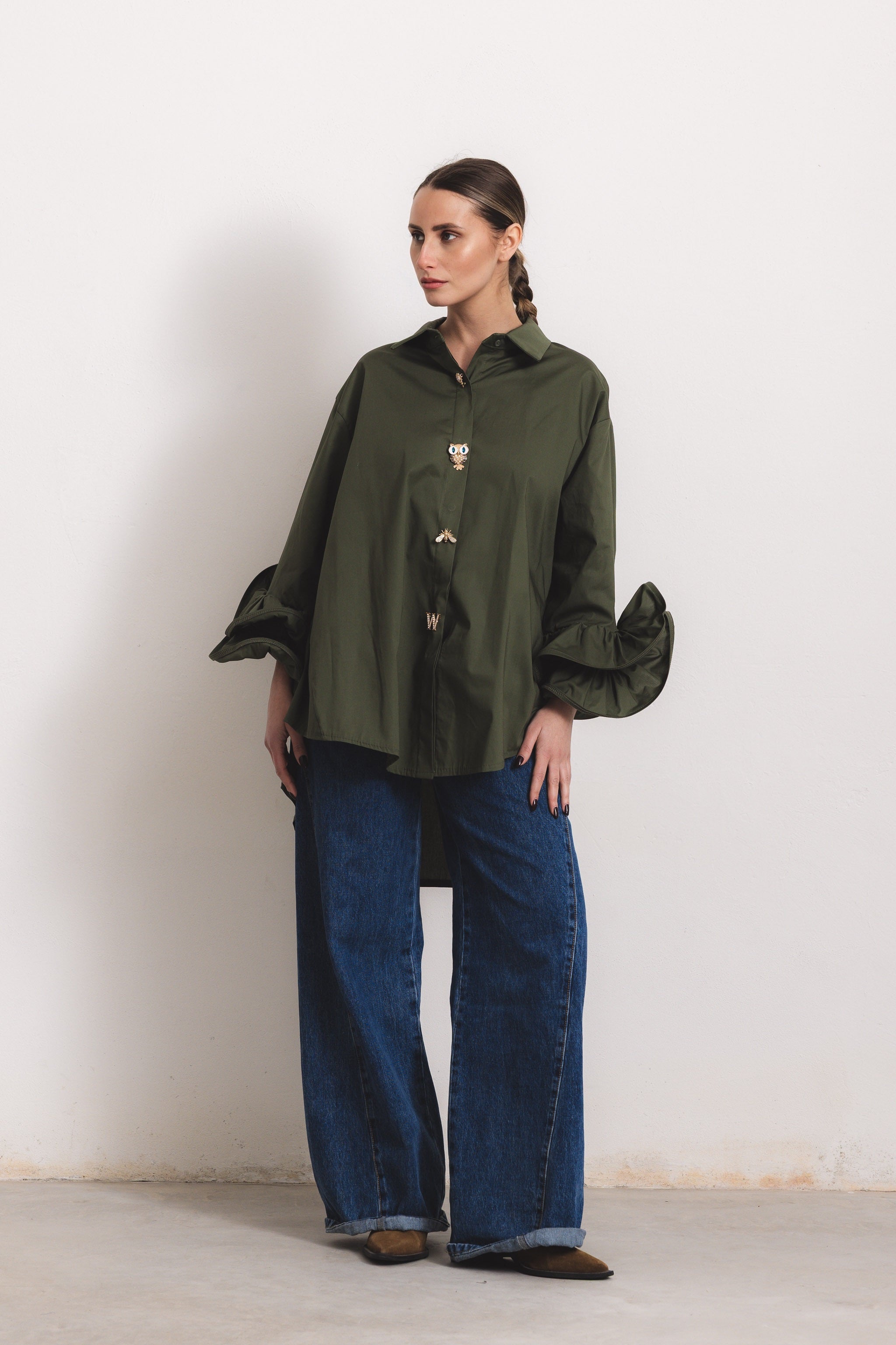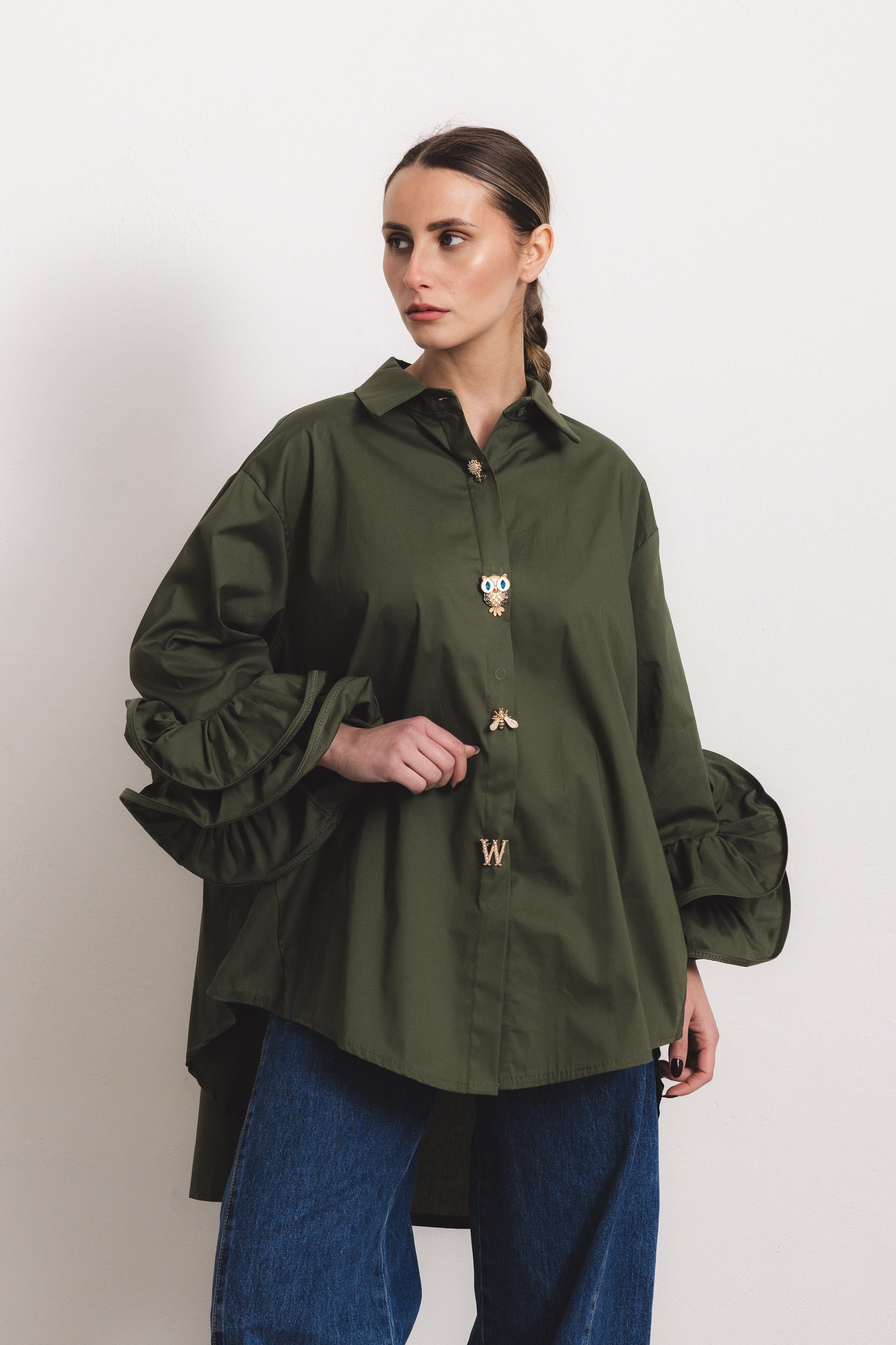 FLAMENCO - Camicia con rouches (Verde Militare Bottoni Gioiello)