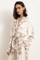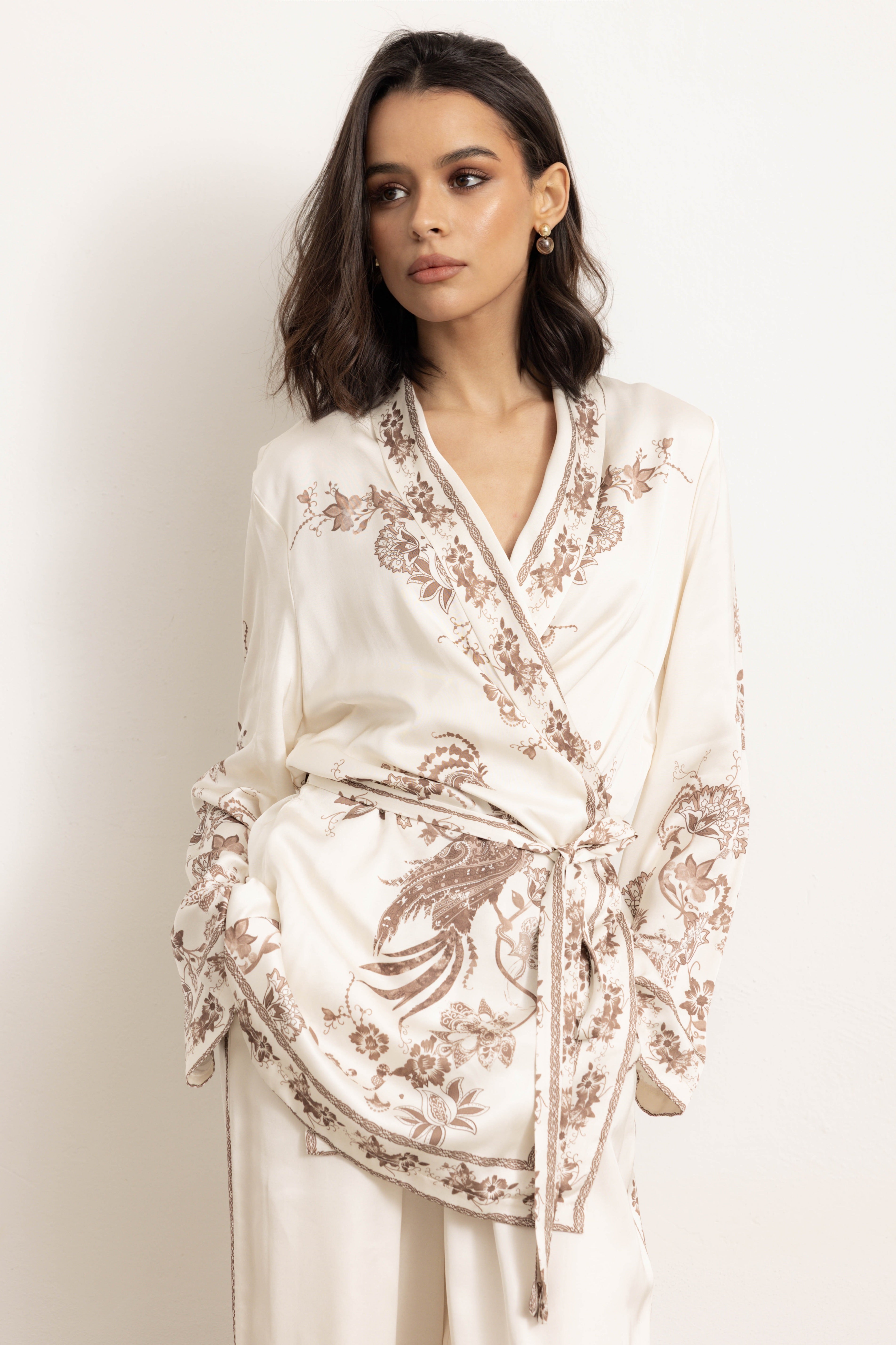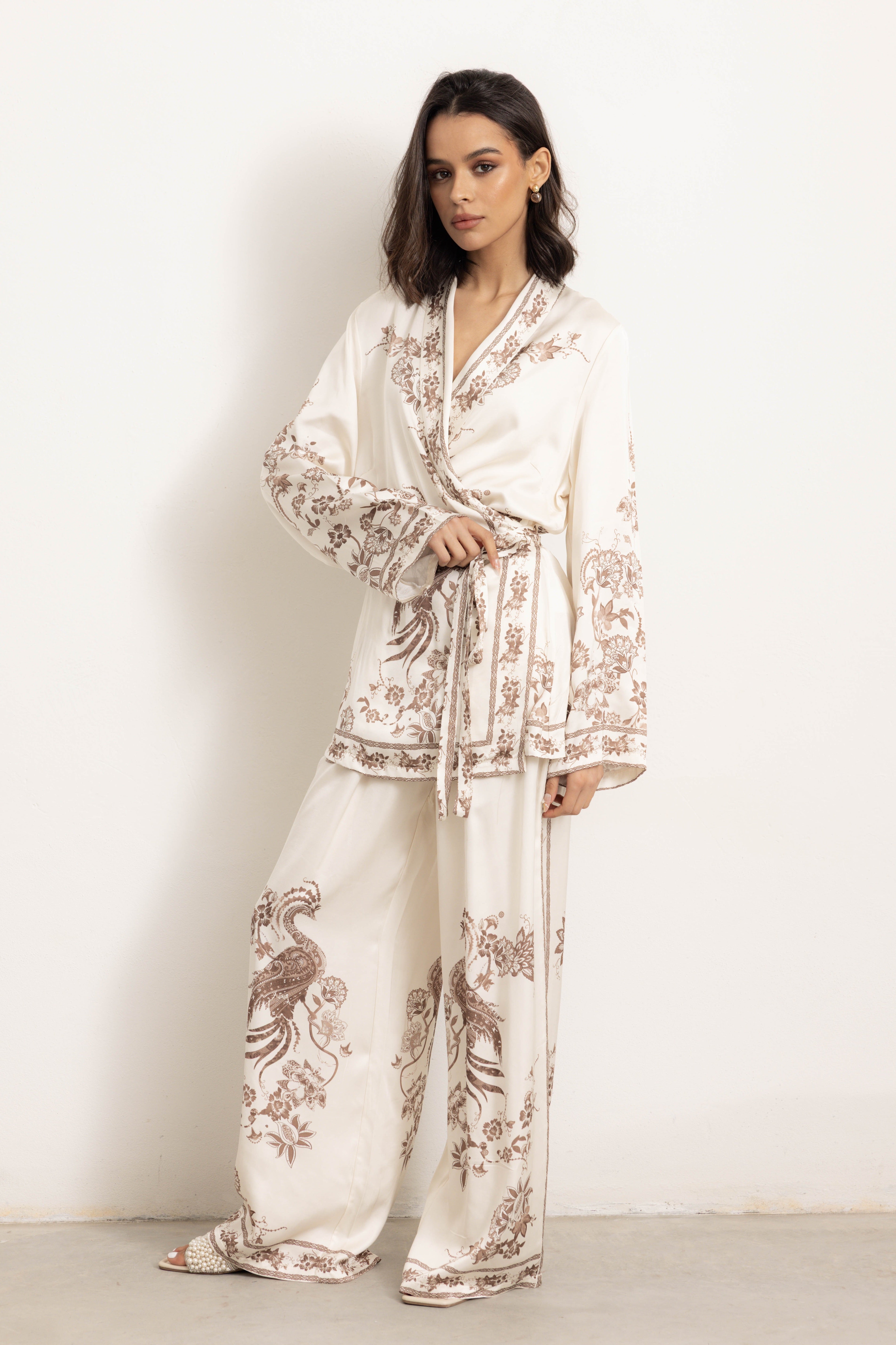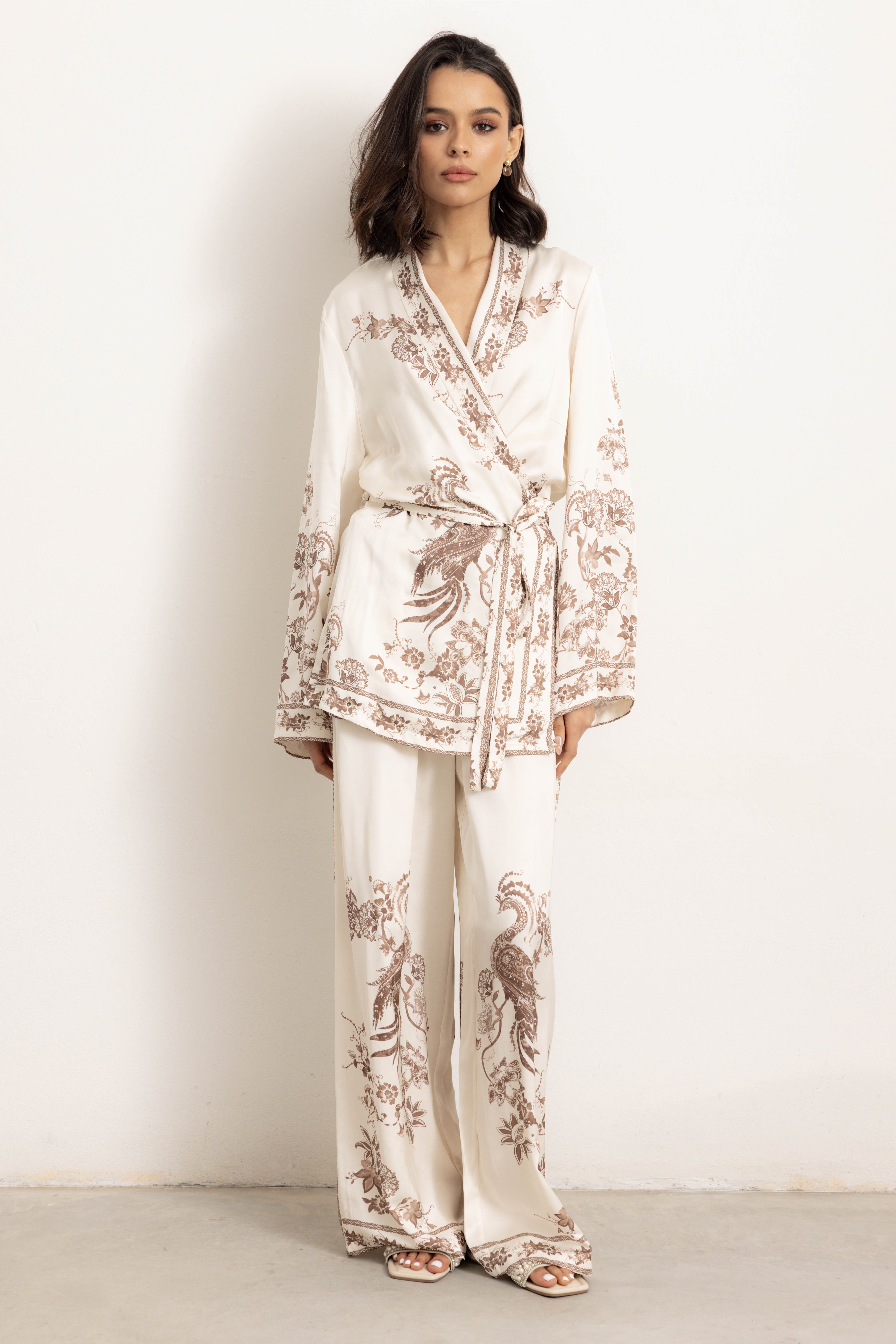 Completo fantasia, con fascia laterale in vita e manica lunga. Hong kong è un capo che richiama a geometrie e fantasie orientali, così da donare alle vostre serate, un'atmosfera esotica e sofisticata. Un completo ricercato ed al contempo, assolutamente confortevole.